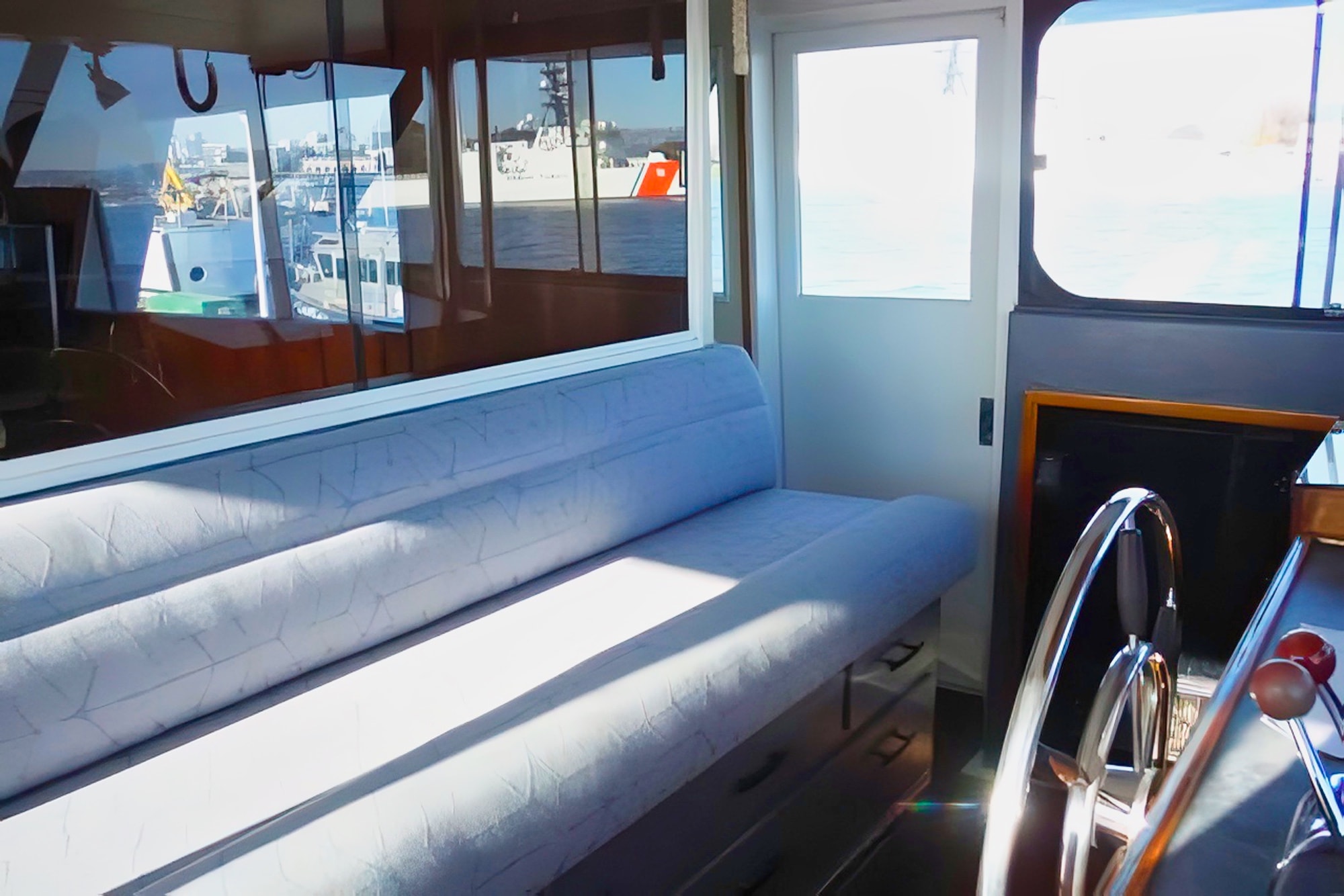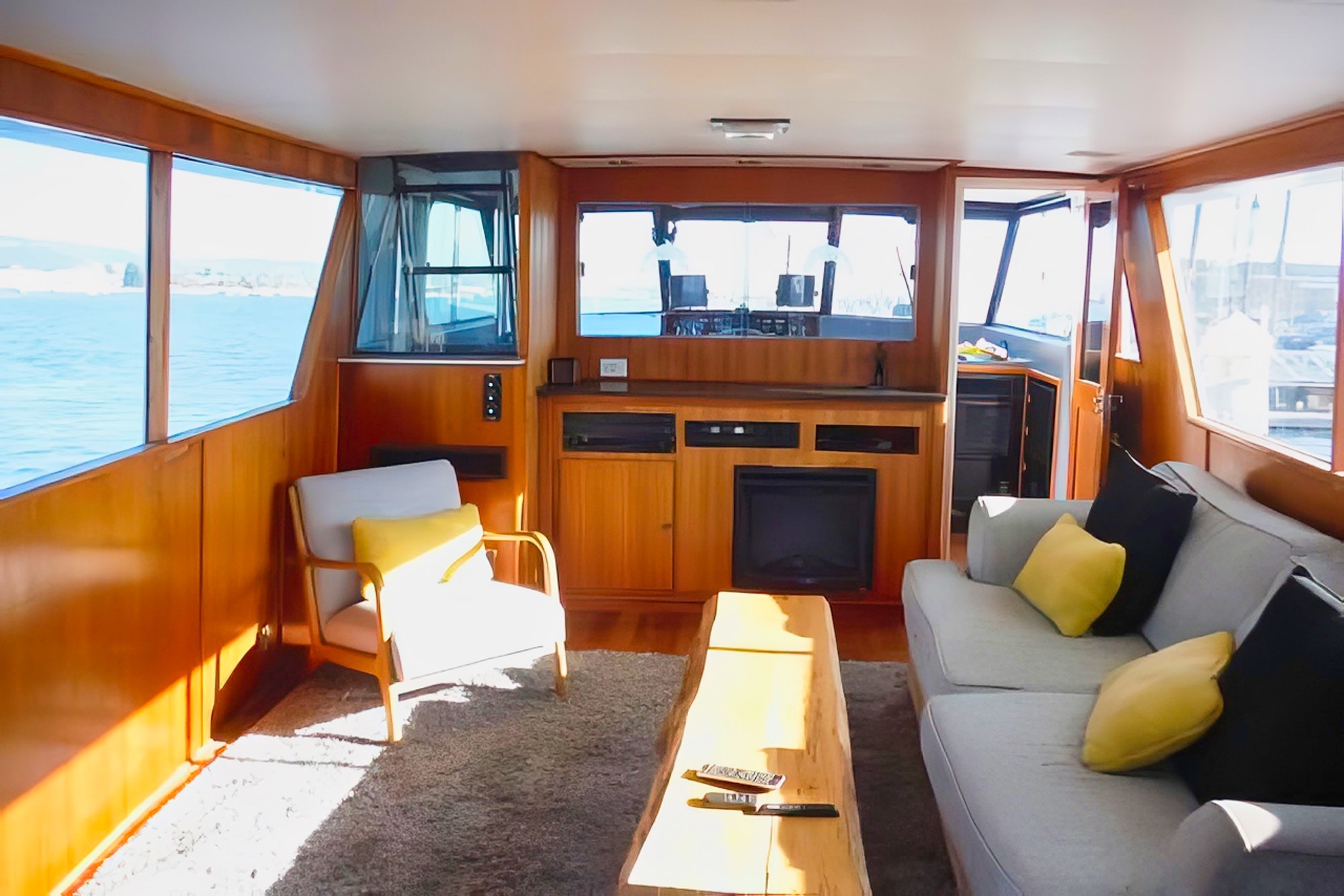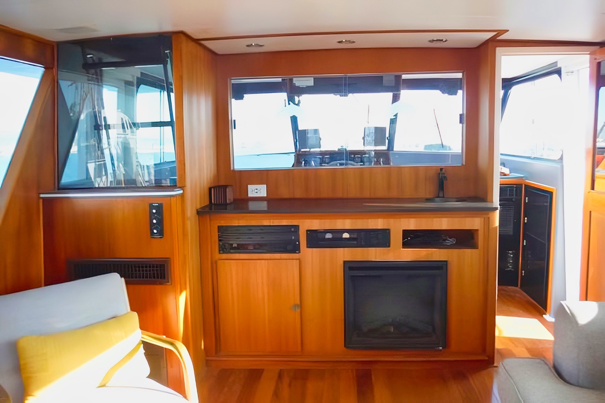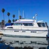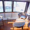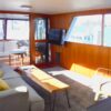She has a great salon open via double doors to a super aft deck. Large galley is down from the mid-ship pilothouse.Tons of storage throughout the boat,which includes standing headroom in the engine room and a laundry room.