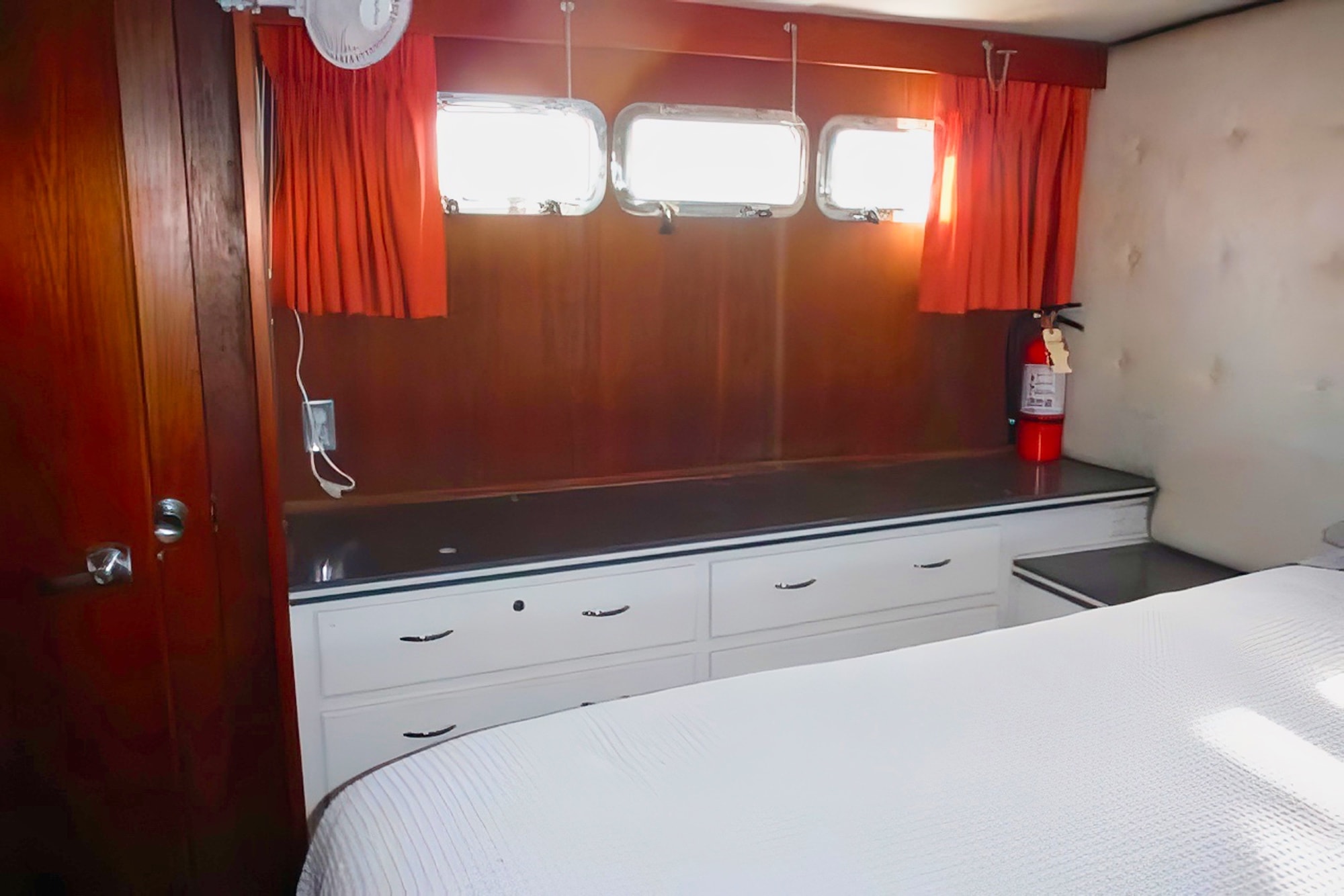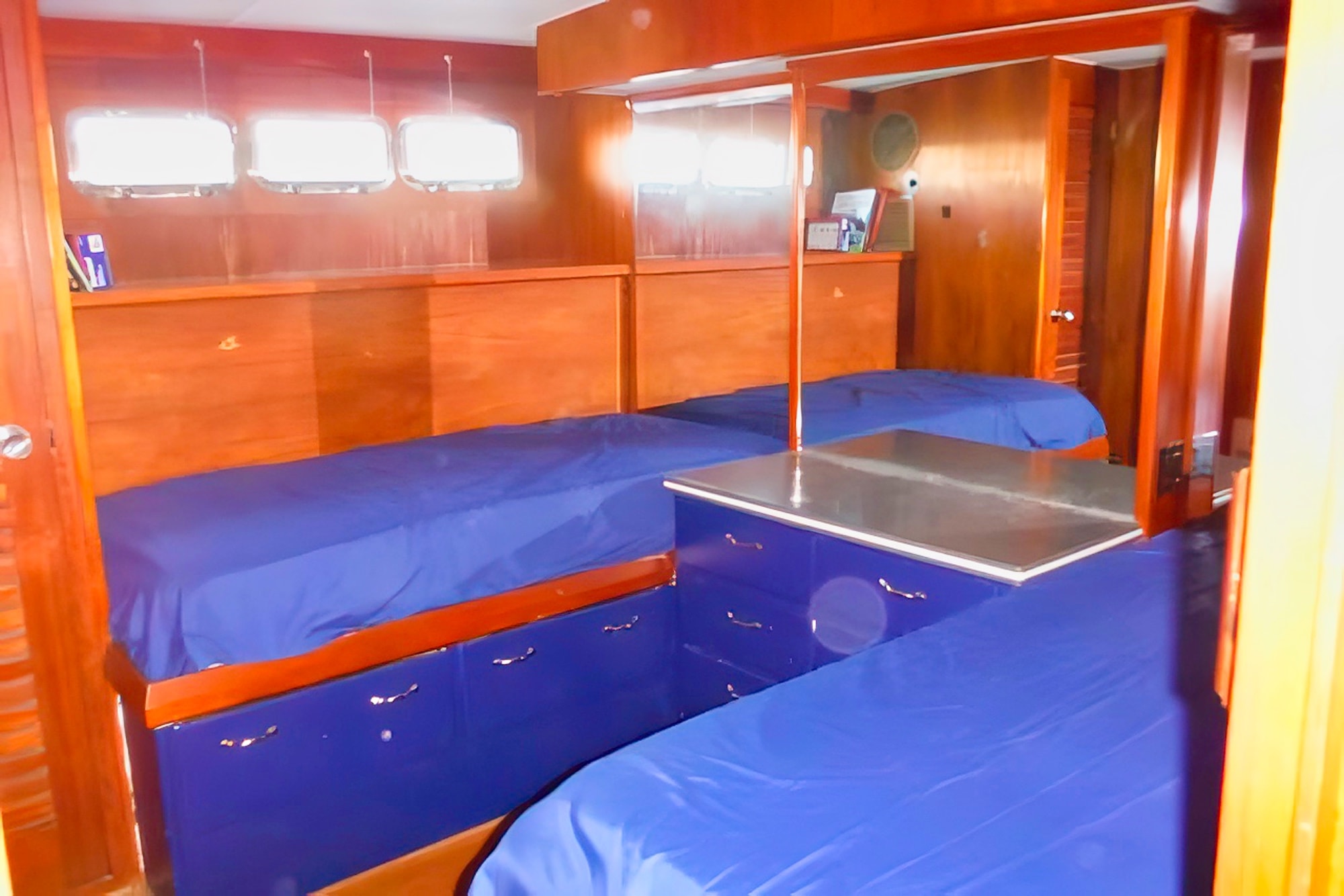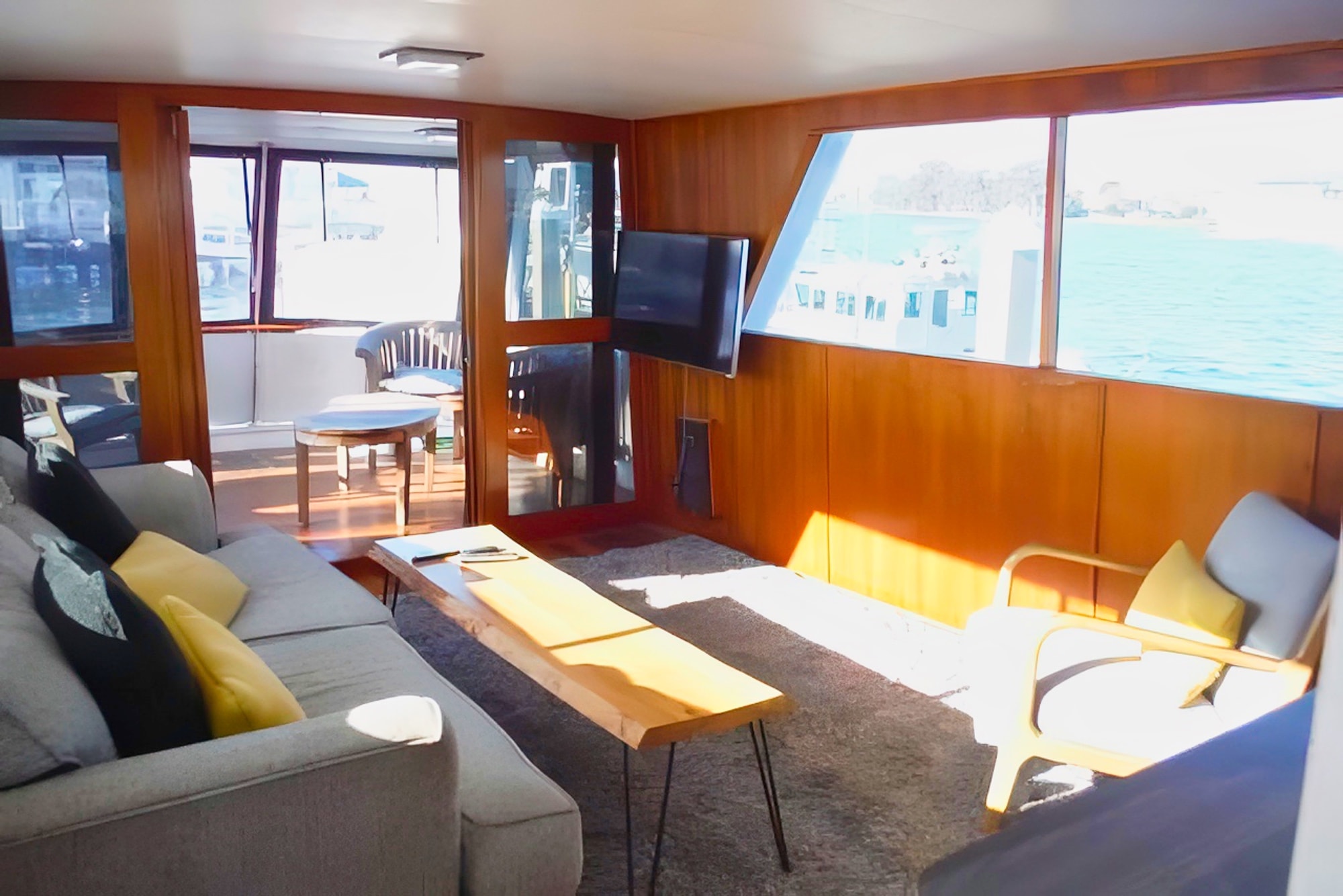 She has a great salon open via double doors to a super aft deck. Large galley is down from the mid-ship pilothouse.Tons of storage throughout the boat,which includes standing headroom in the engine room and a laundry room.