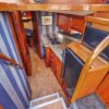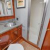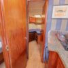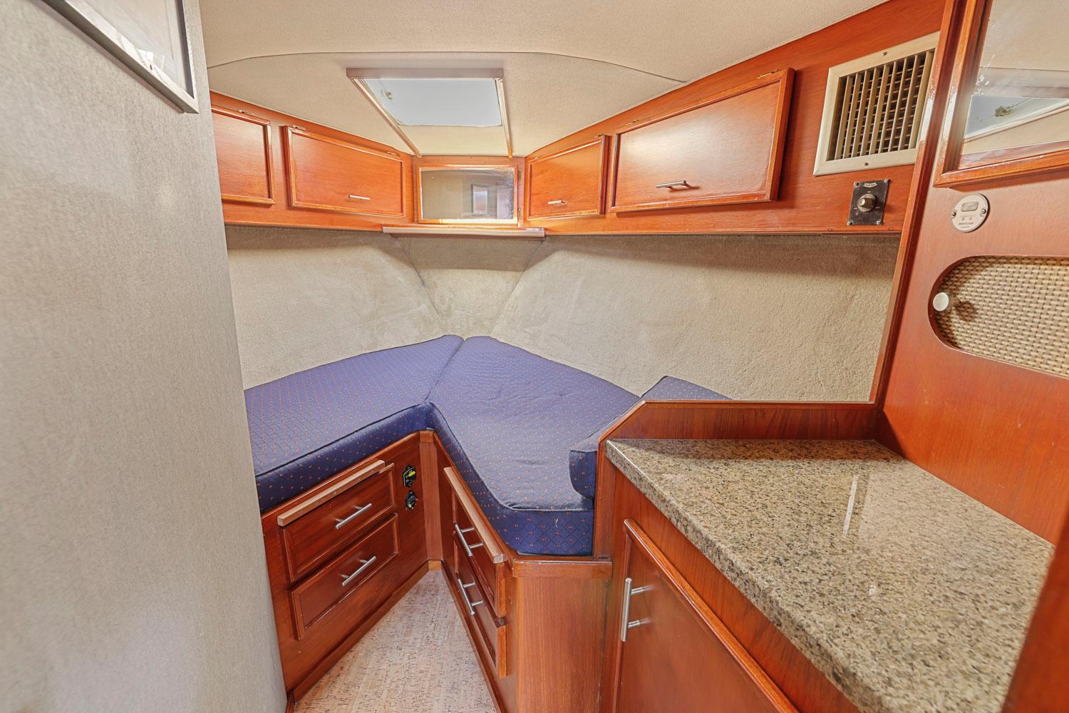 Large open main salon with sliding door entrance from large teak cockpit. large settee to starboard. down a few step is the galley on starboard. opposite is a guest stateroom with Pullman double berth with private head access. Head is just forward with vacuflush toilet and separate stall shower. master stateroom is forward with large V-berth with infill cushion.