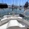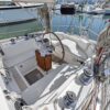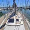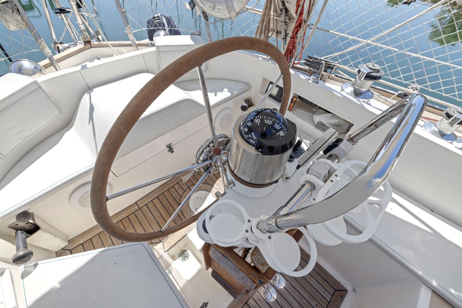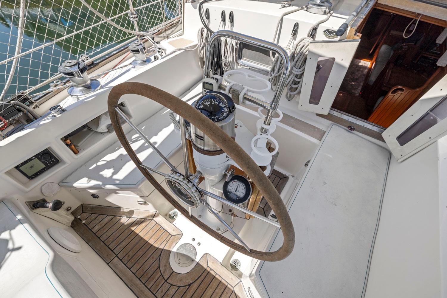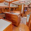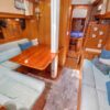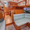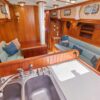 The interior showcases quality craftsmanship with teak woodwork and appointments, providing a warm and inviting living space ideally suited for cruising. The well-designed layout offers dedicated spaces for living, dining, navigation, and storage to accommodate extended voyages in comfort.