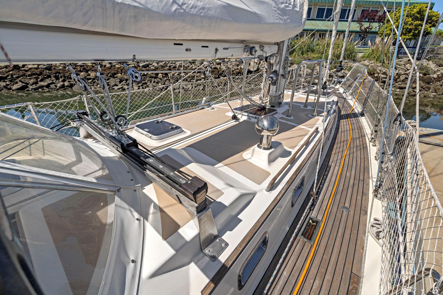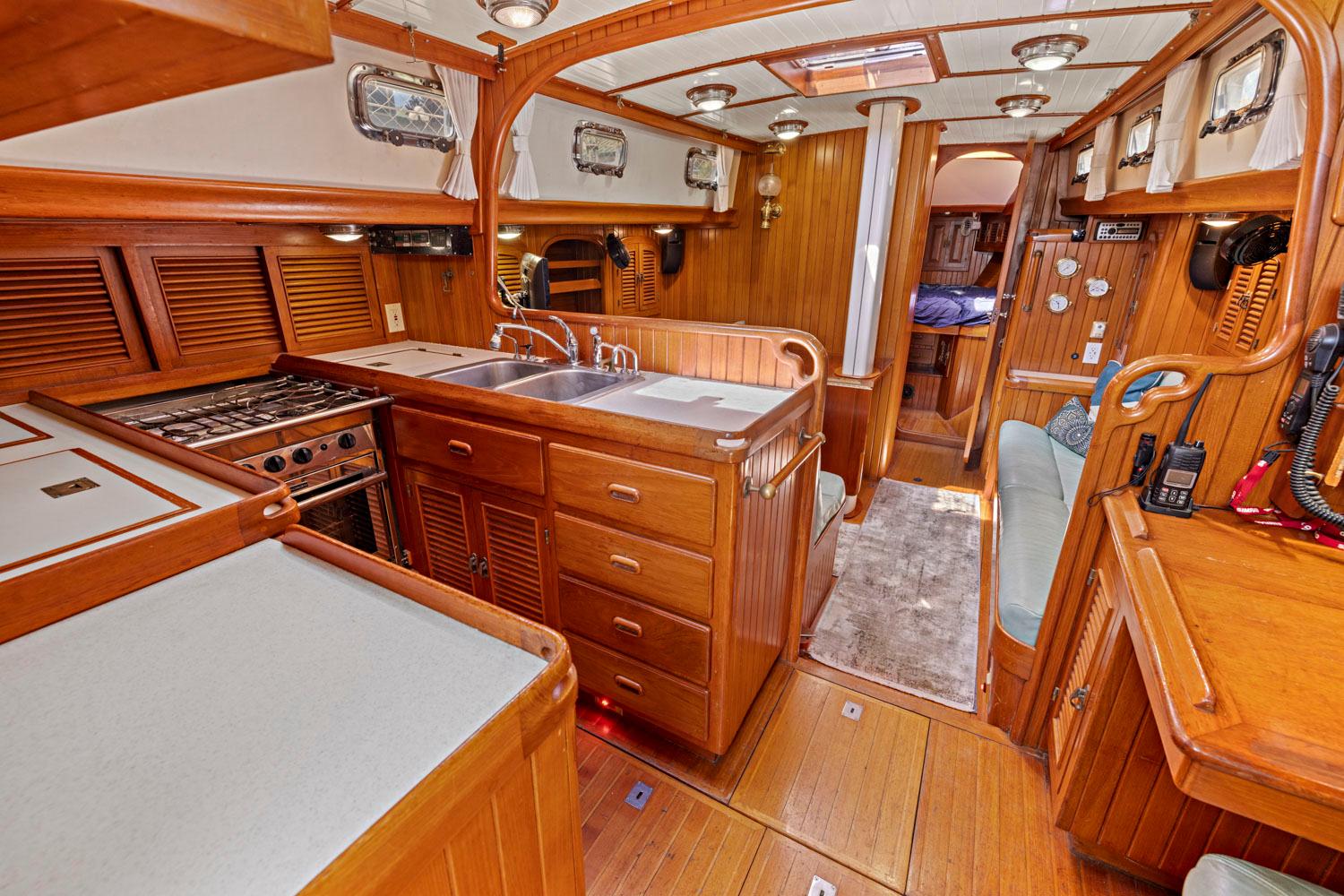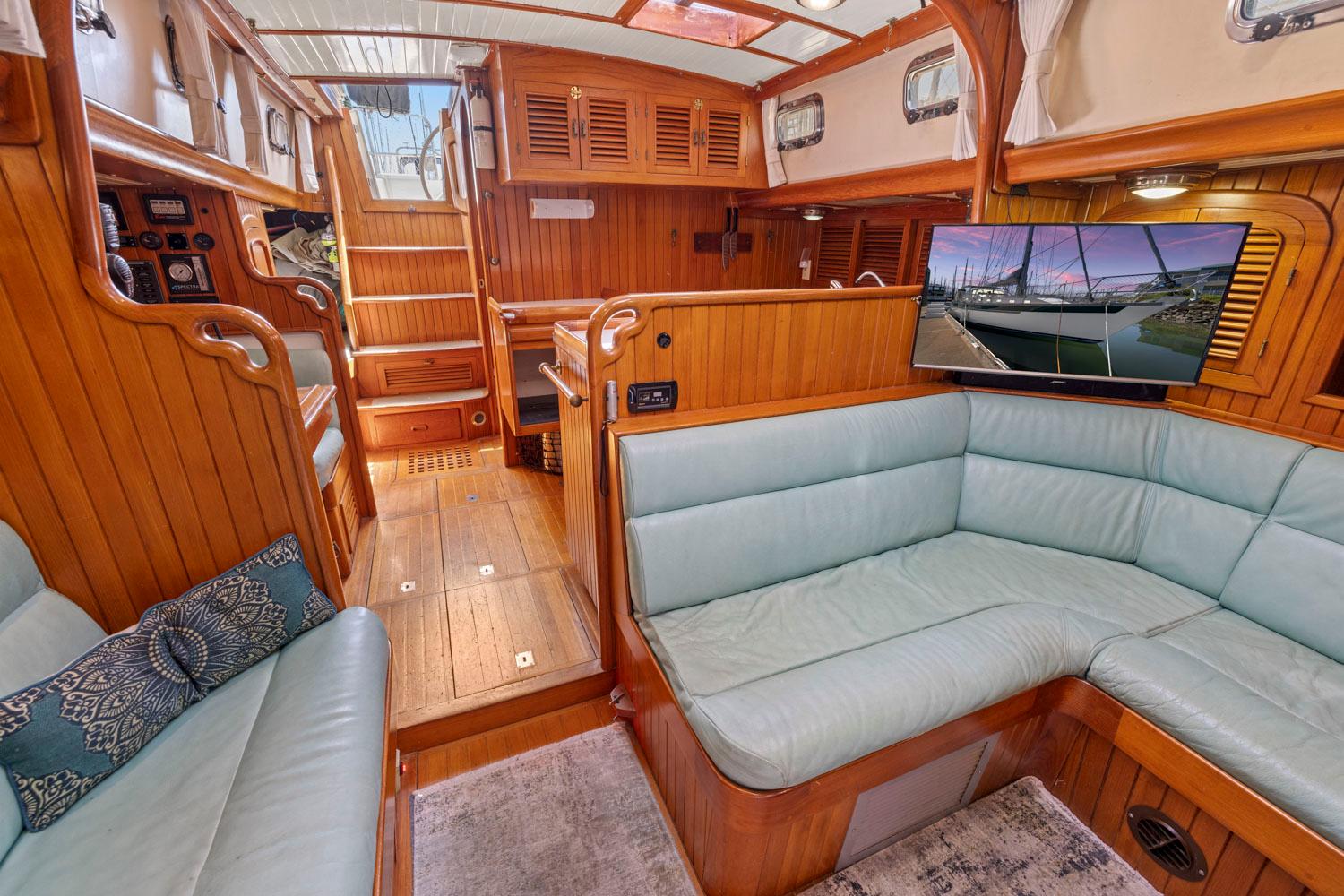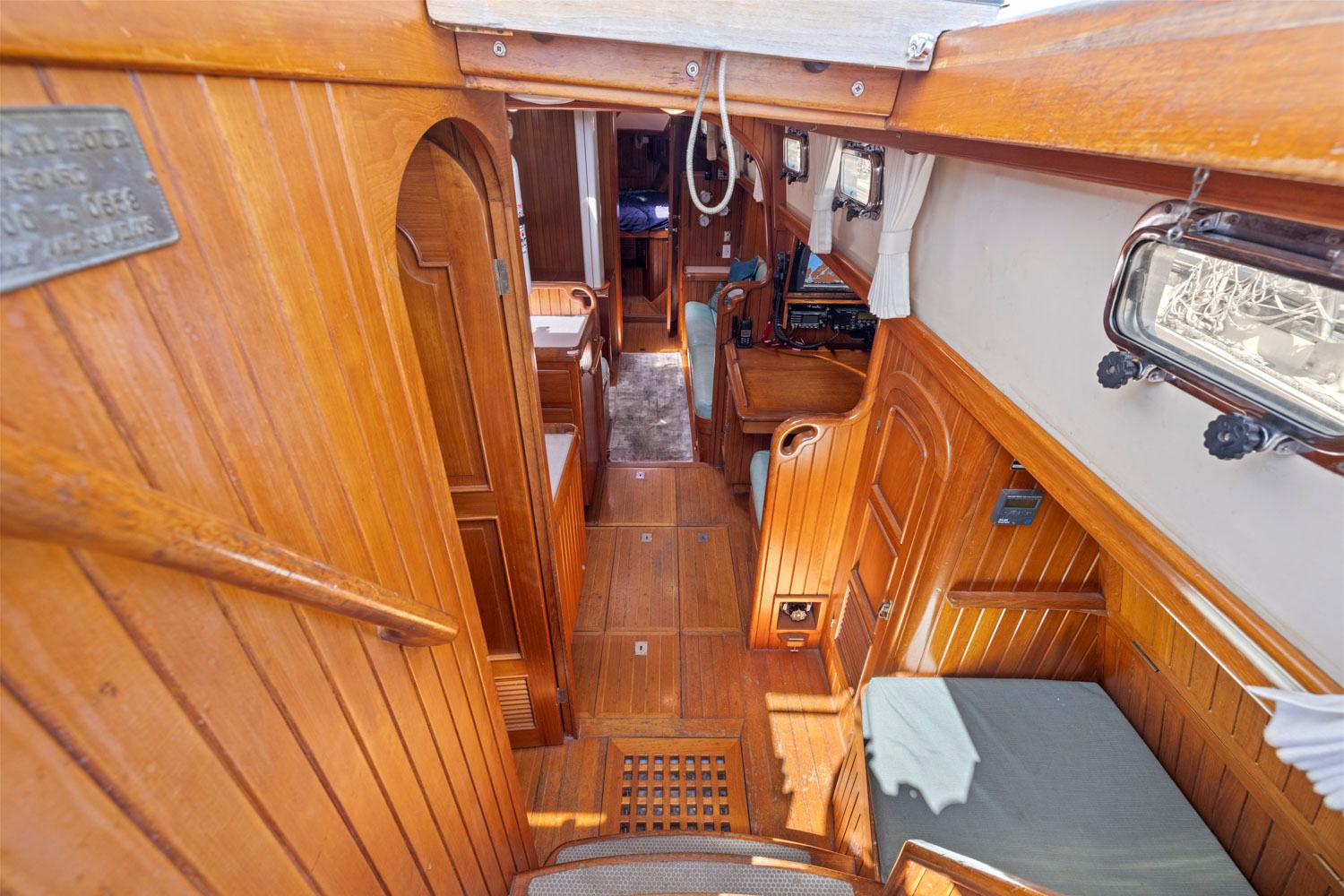 - Rich teak interior with trim, cabinetry, handholds, and soles