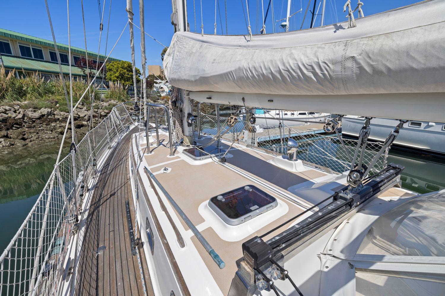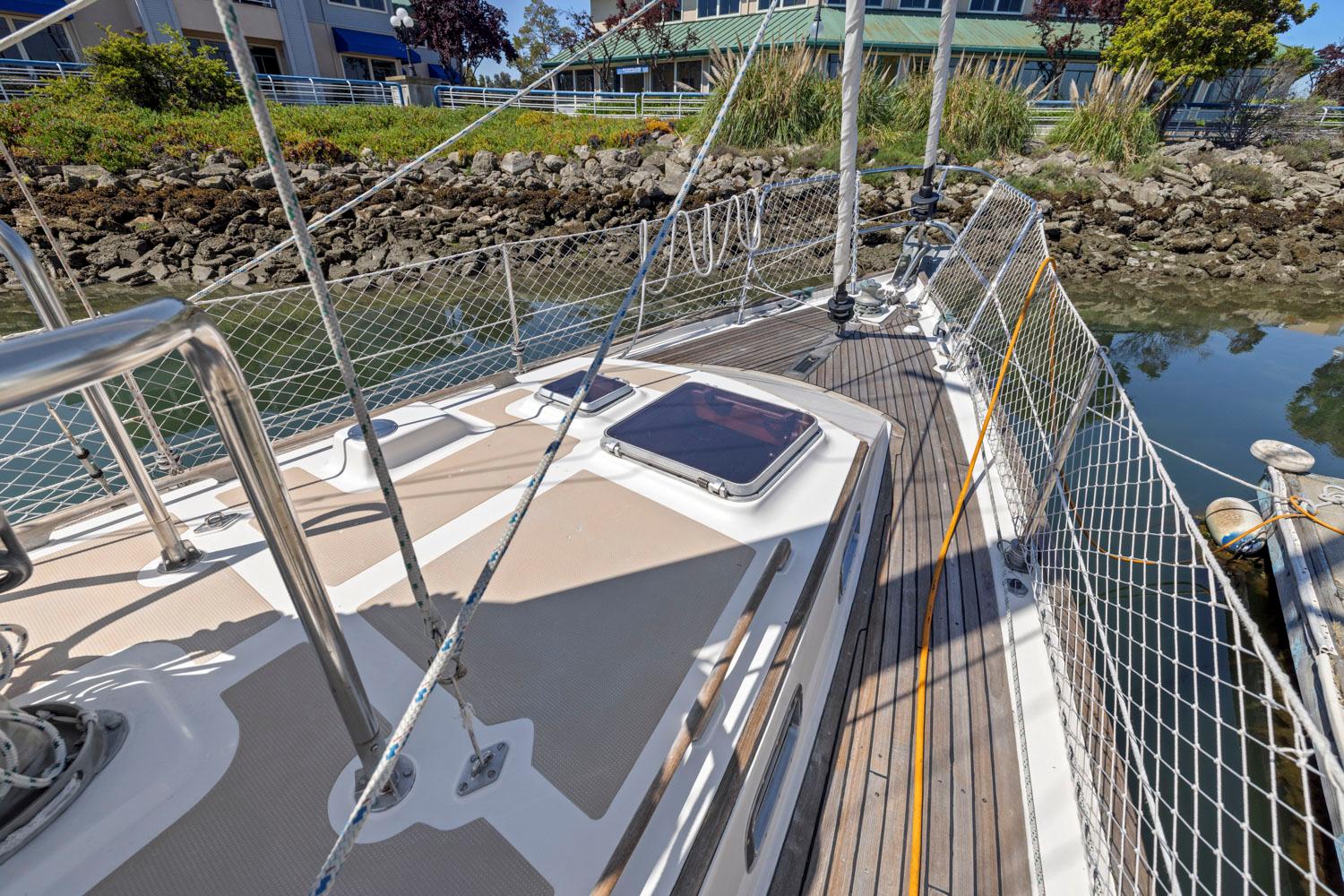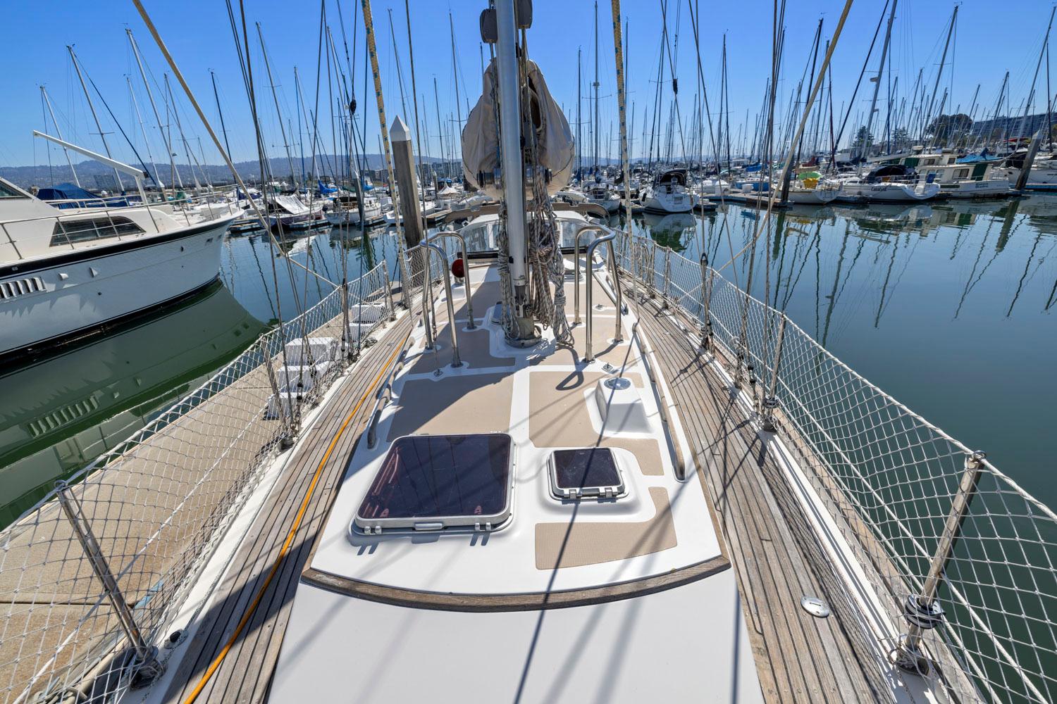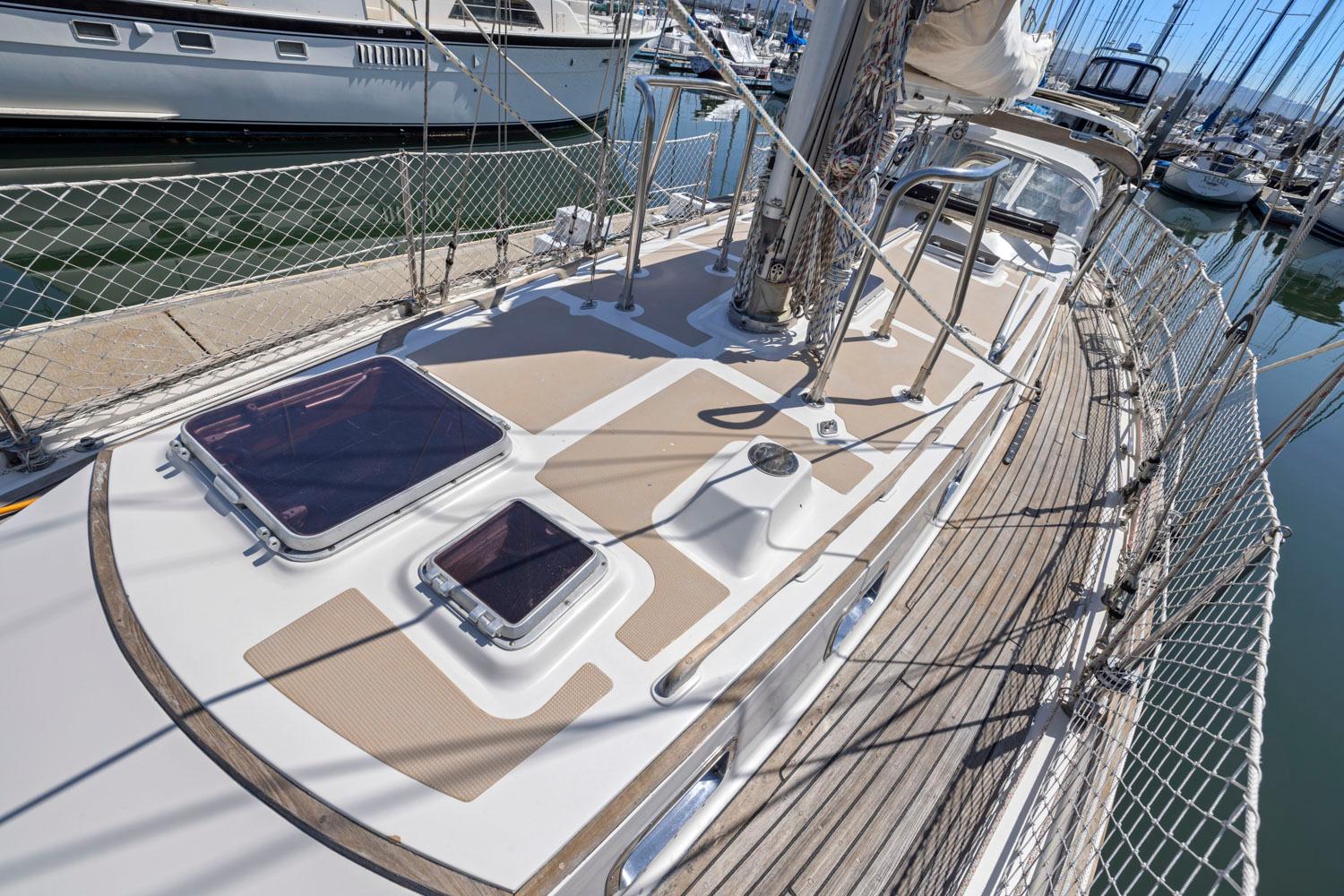 - Rich teak interior with trim, cabinetry, handholds, and soles