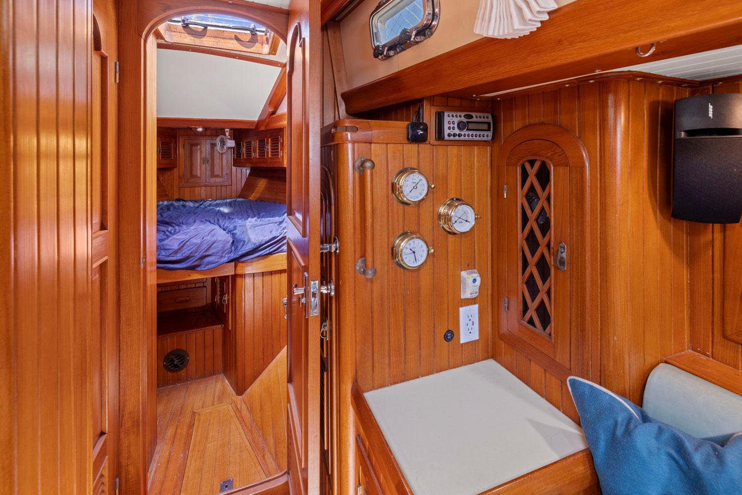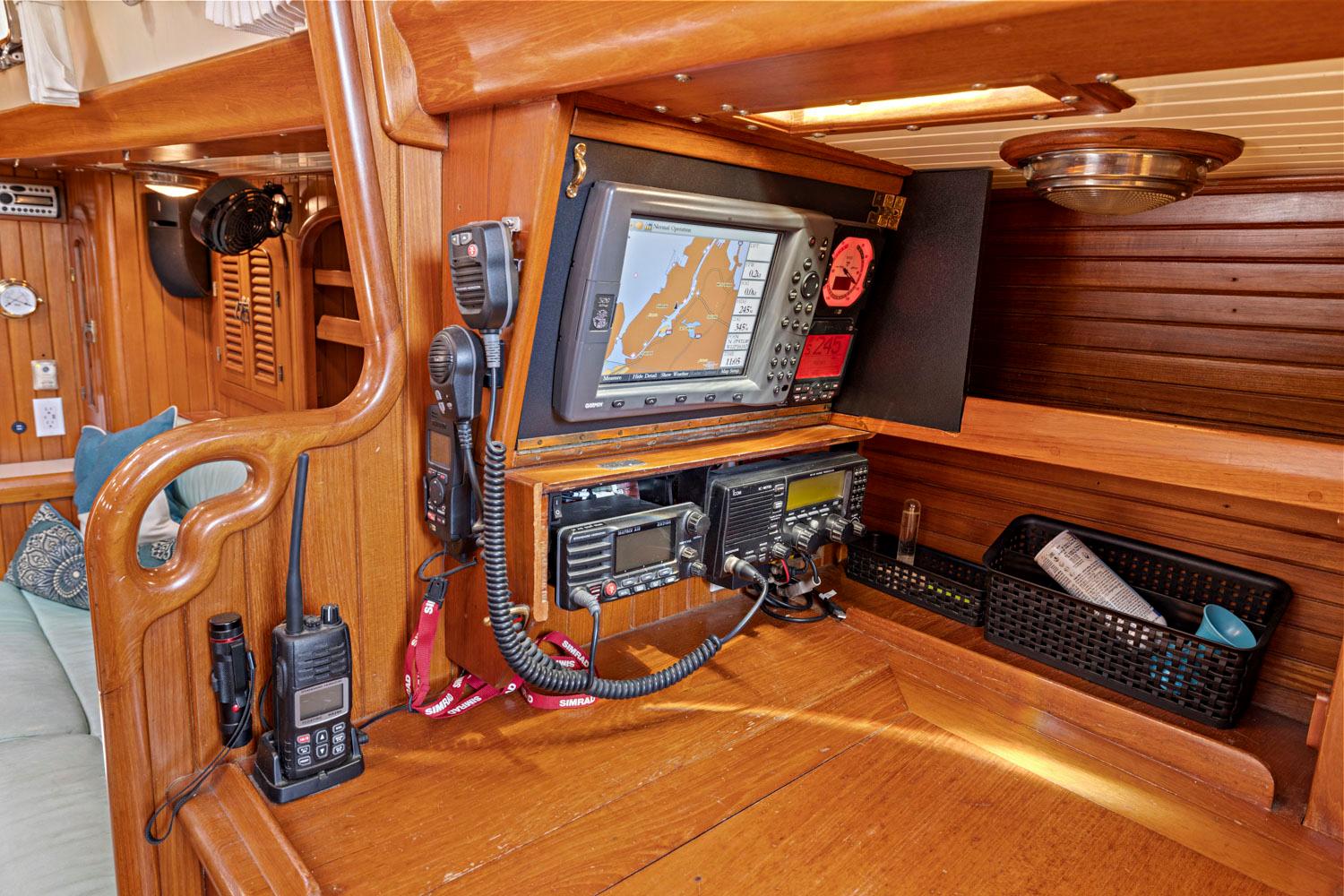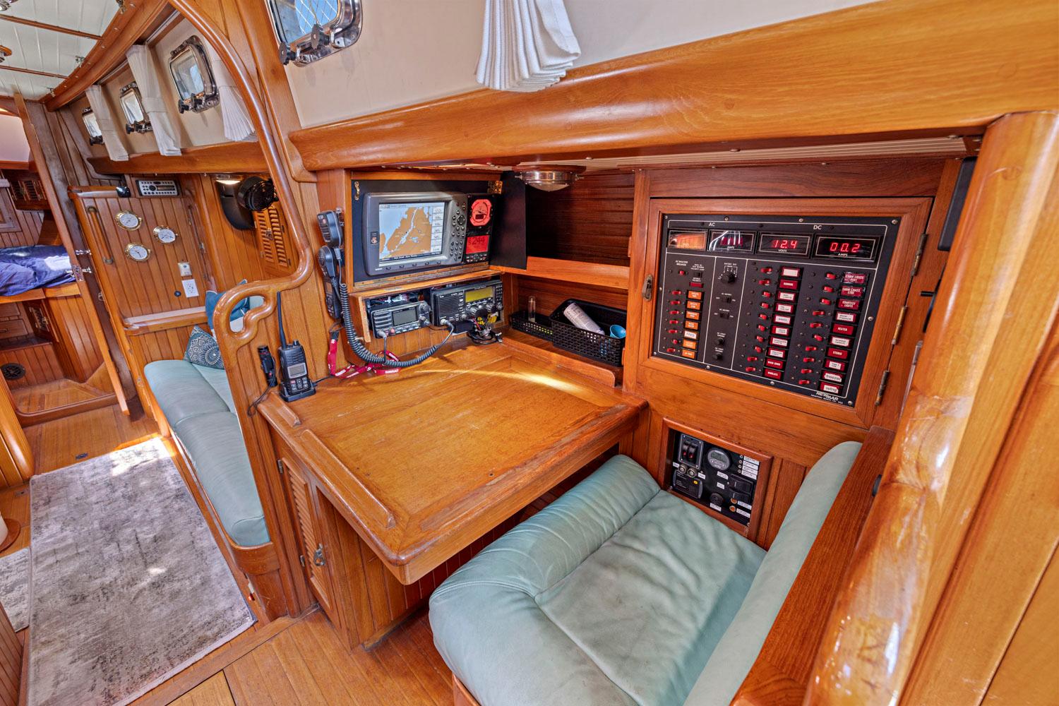 - Nav station to starboard with desktop, electrical panels, electronics