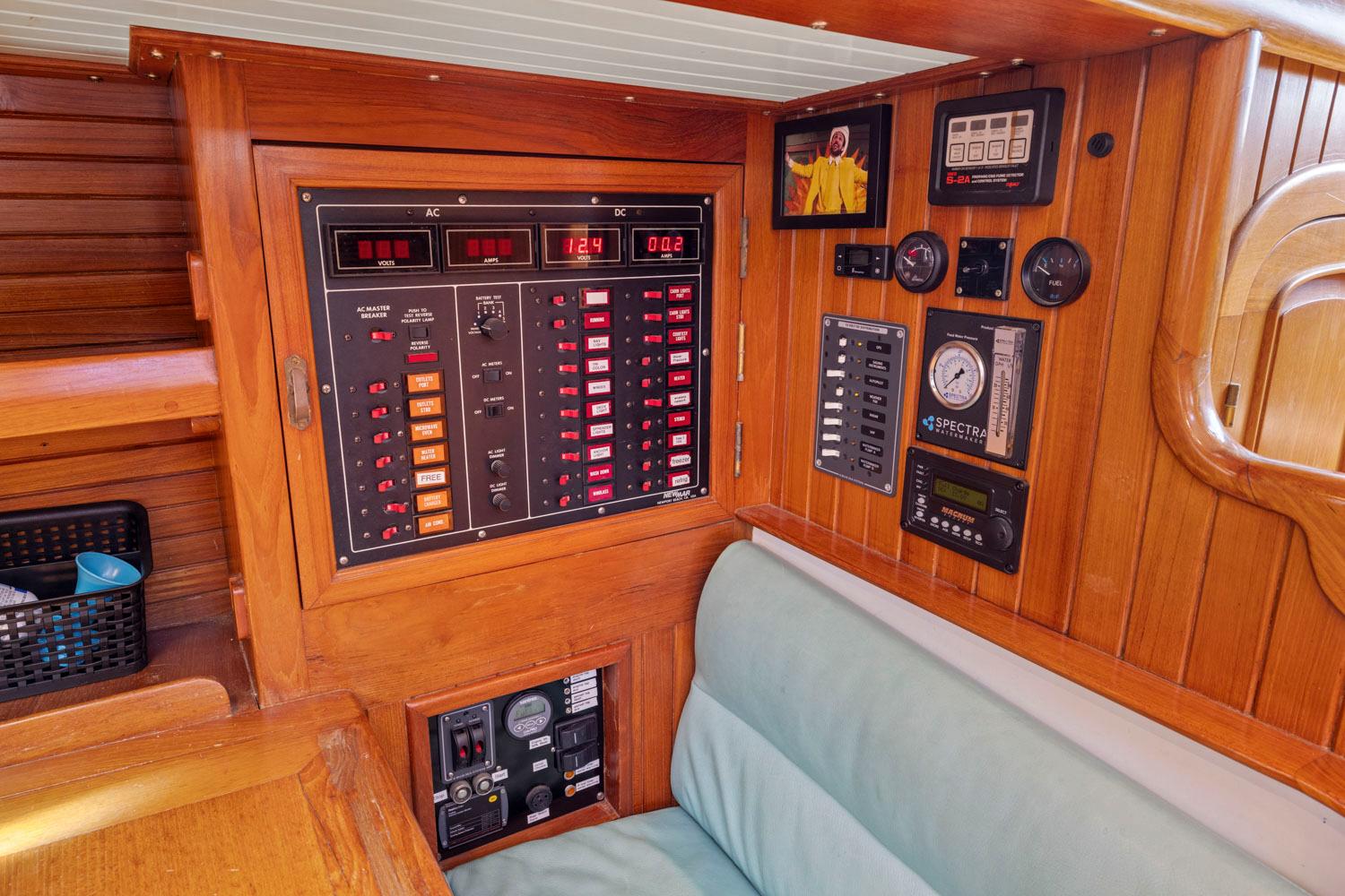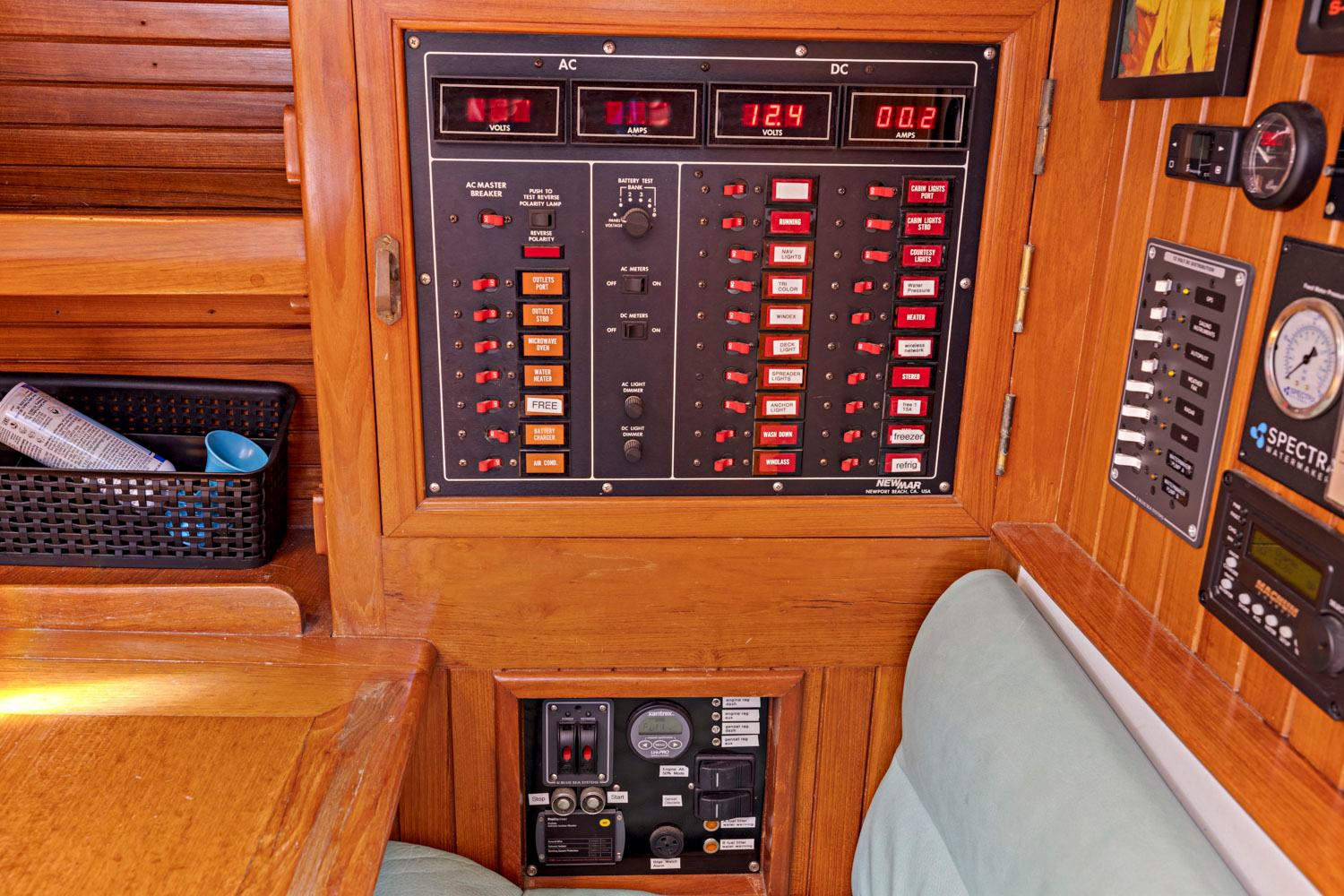 - 12V DC and 110V AC systems, with fully labeled distribution panels at nav station.
