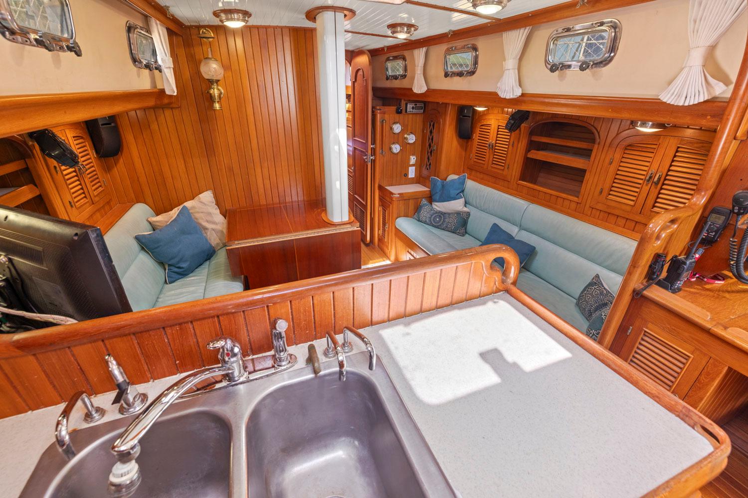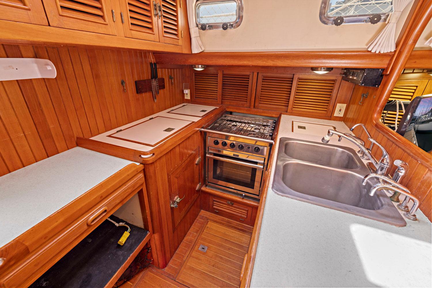 - Large, double-deep stainless steel sinks with single-lever fixture for hot/cold pressure water; fresh and salt water foot pumps, and filtered water.