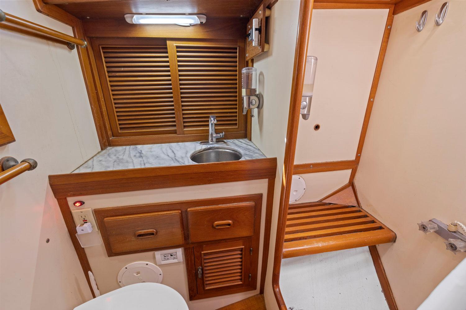 - Head with walk-in shower and electric toilet to port