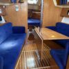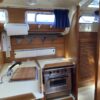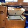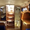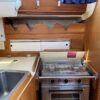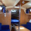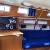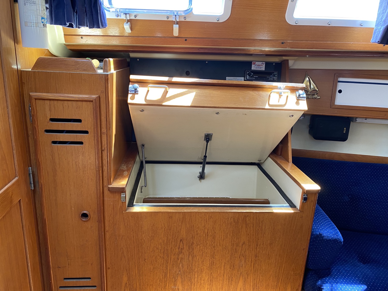 Teak bulkheads give this boat a classic, warm and inviting feel. The bright navy upholstery shows almost no wear. It has matching pleated curtains for the portlights. The teak salon table has two drop leafs to allow easy access. Storage behind sliding doors over both settees. Underneath the chart table is a large insulated ice box and a storage locker to the left.