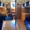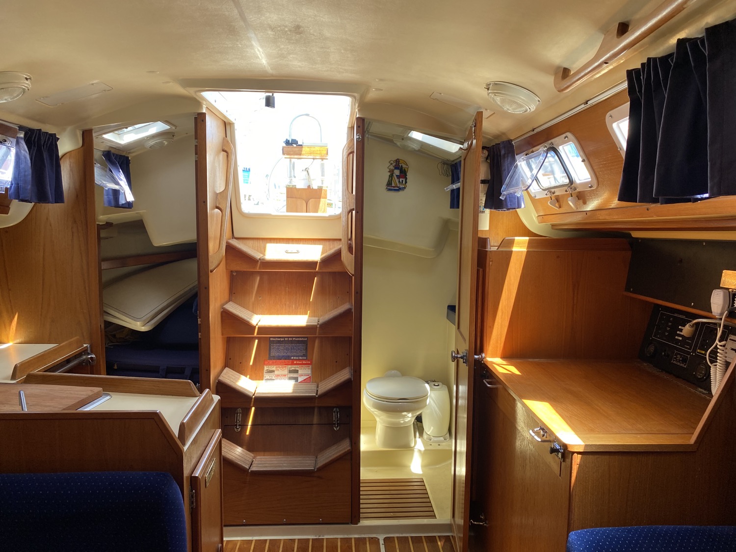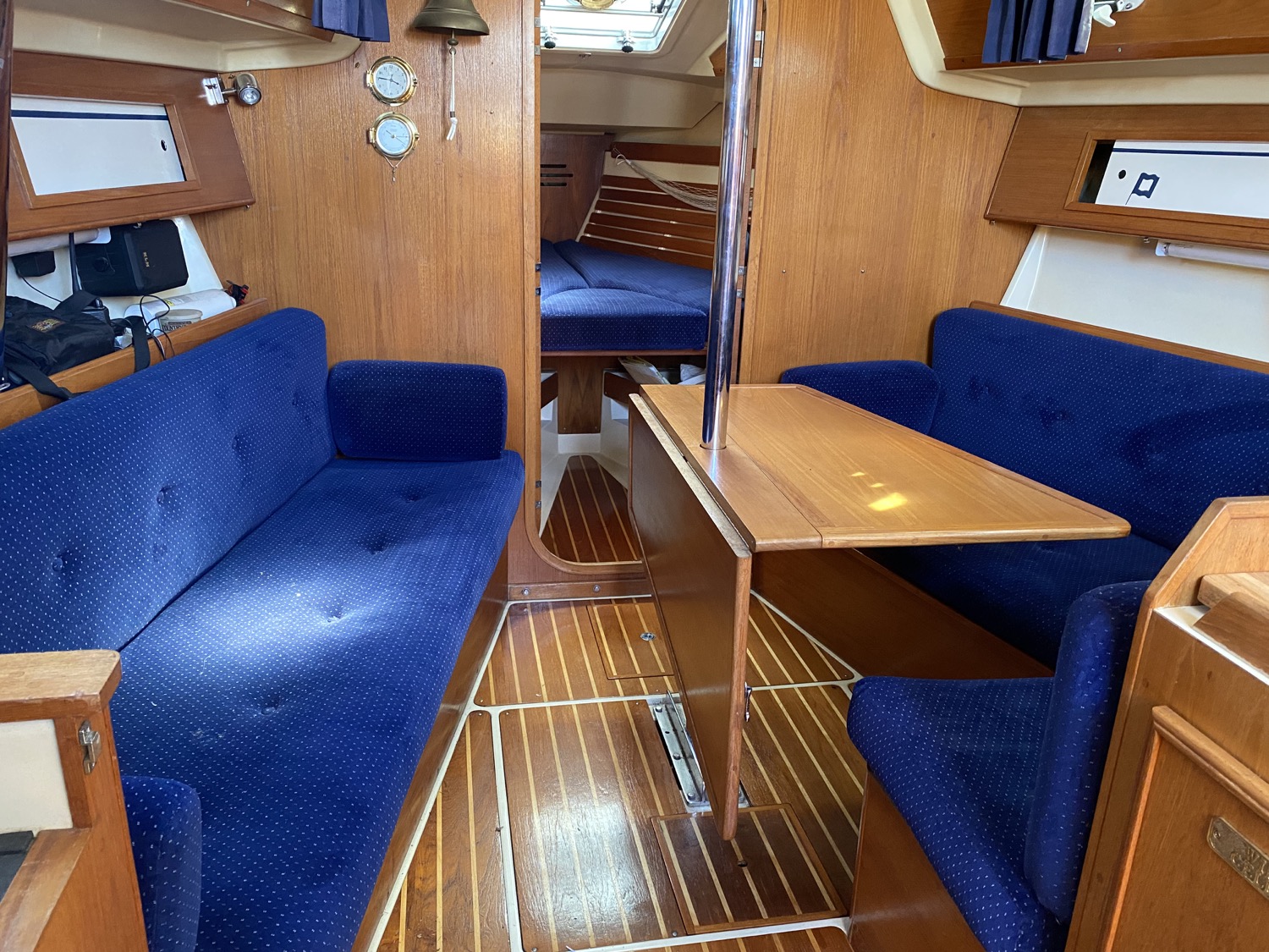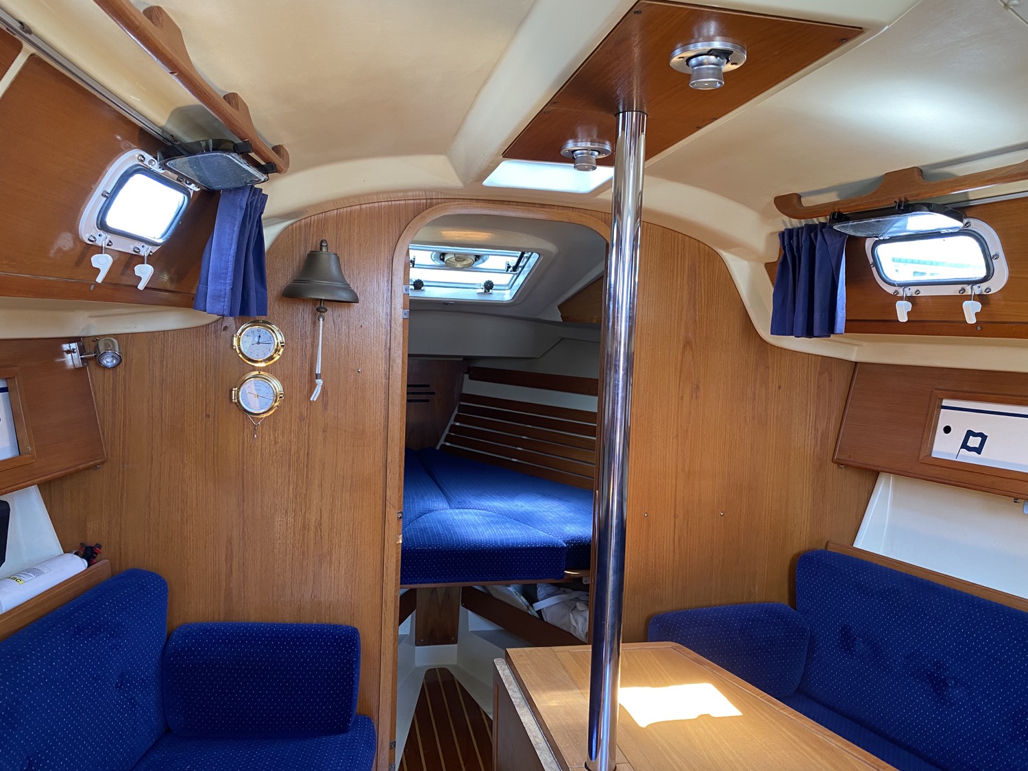 The interior has ample headroom, a drop leaf table, bright navy upholstery and curtains in very good condition. The teak and holly sole is in good condition. There is great interior light and ventilation from multiple port windows and overhead hatches.