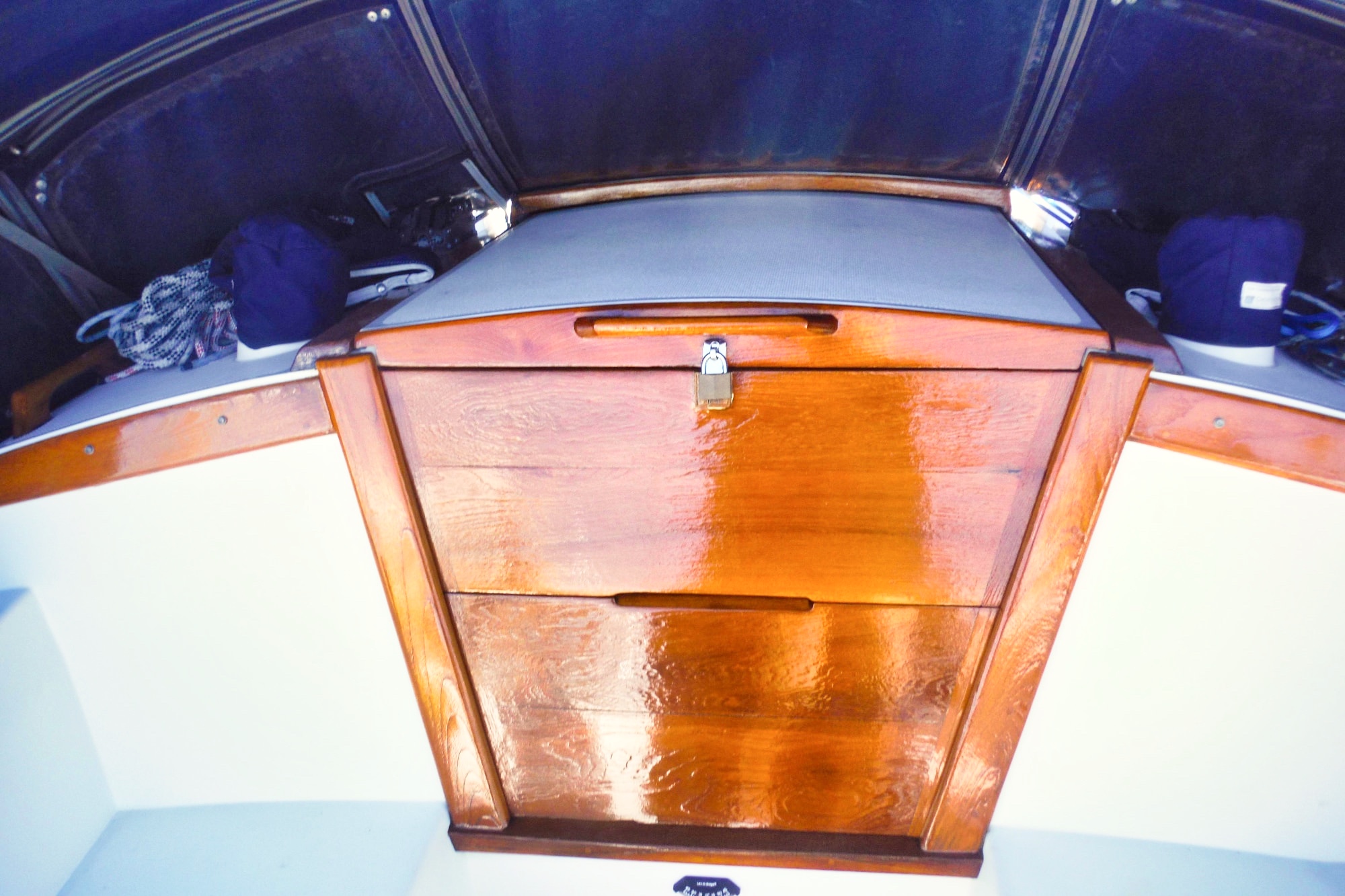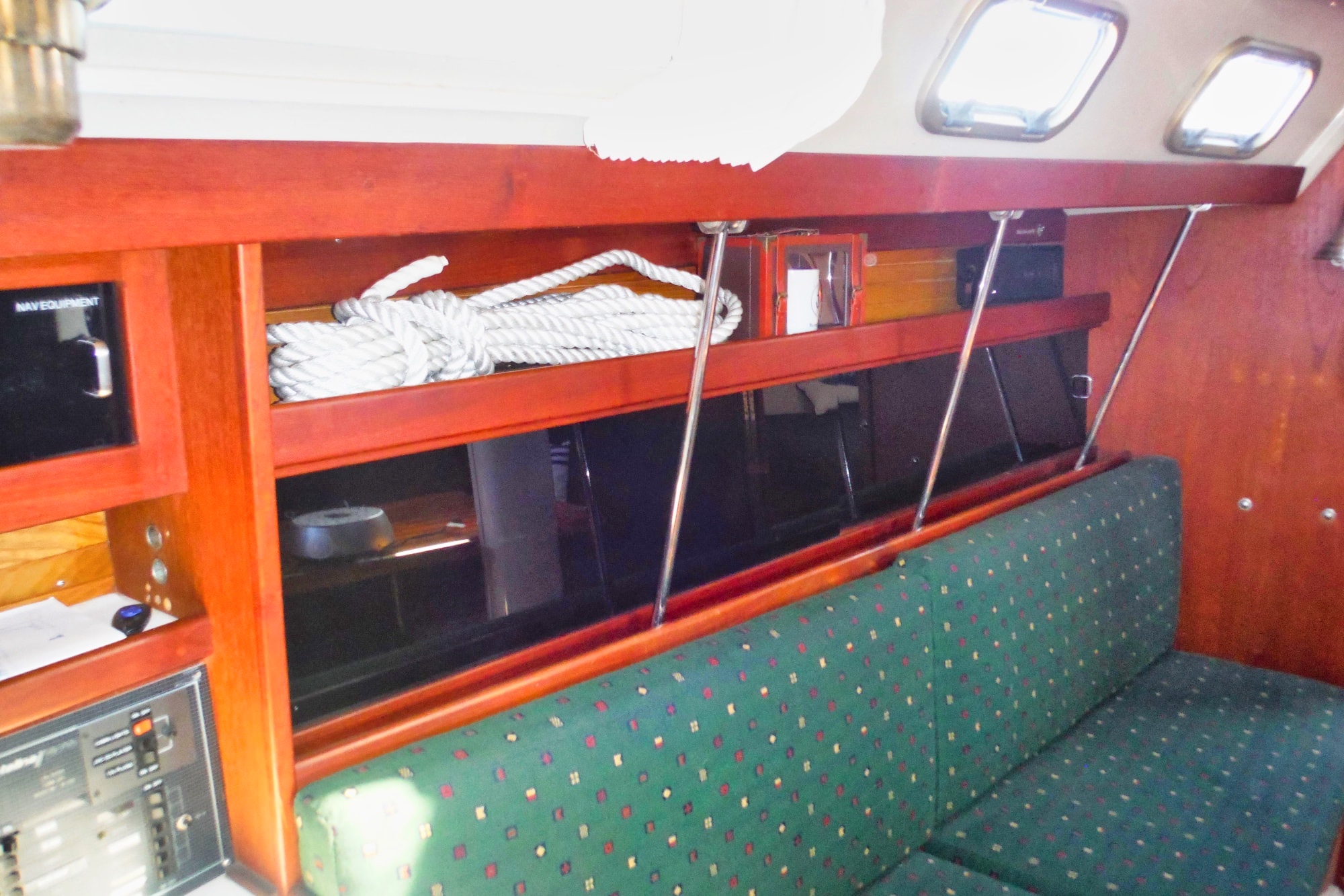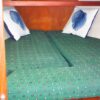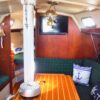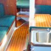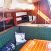 The salon comprises a straight settee to port and a U-shaped settee/dinette to starboard and there’s a large v-berth in the bow. Multiple hatches and opening ports provide good ventilation and plenty of light. Teak and holly sole throughout.
