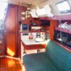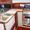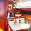 Entering from the large cockpit, the head compartment and nav station are to port, with an L-shaped galley and spacious quarter berth to starboard, and the engine compartment on the centerline below the stairway.