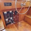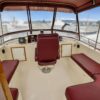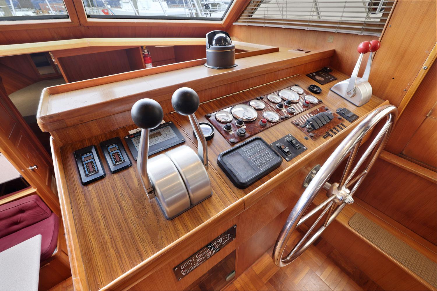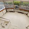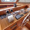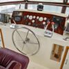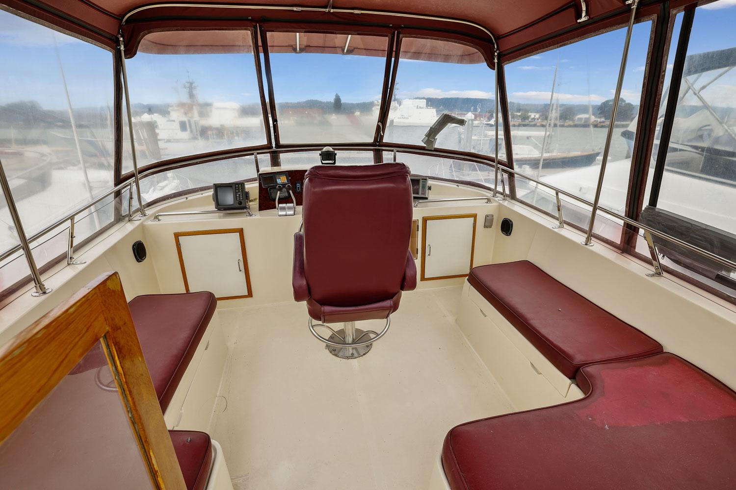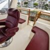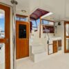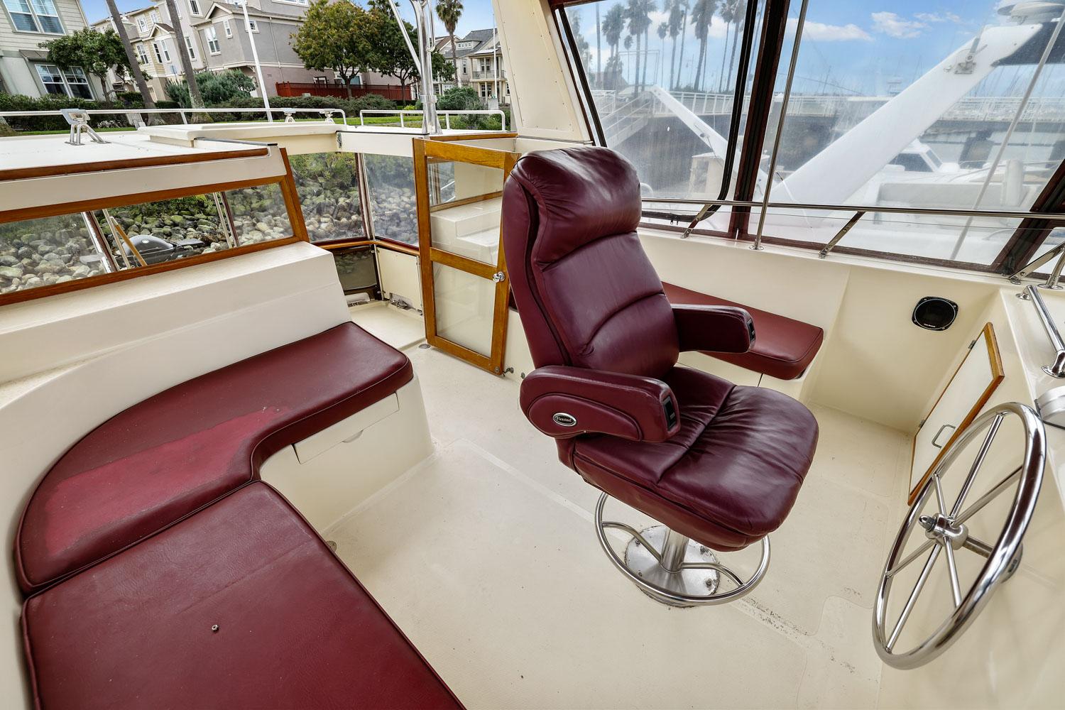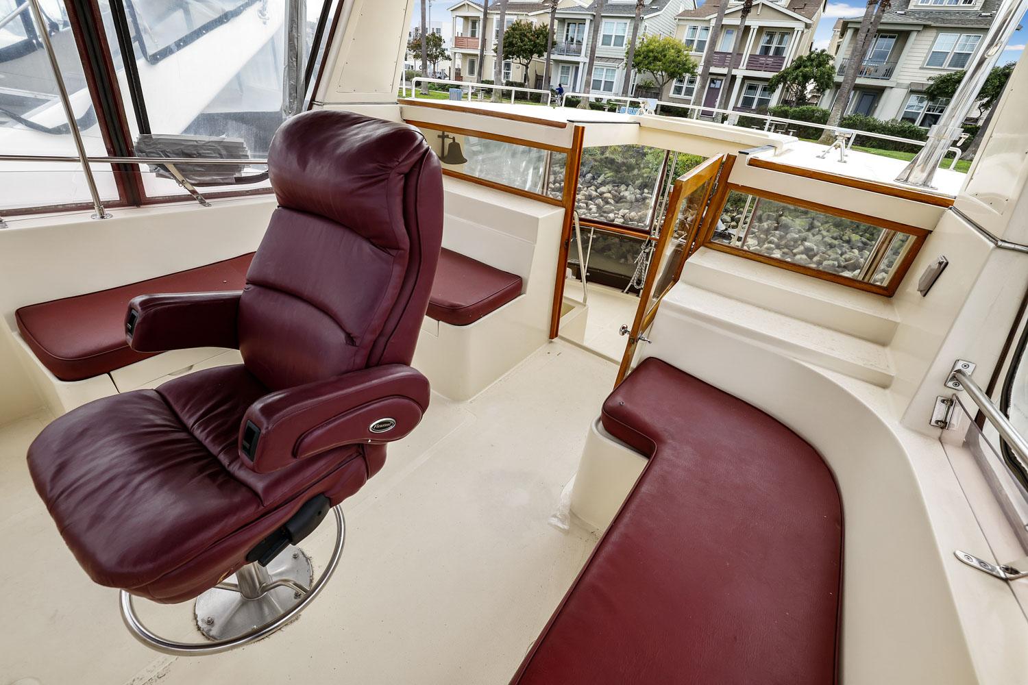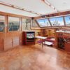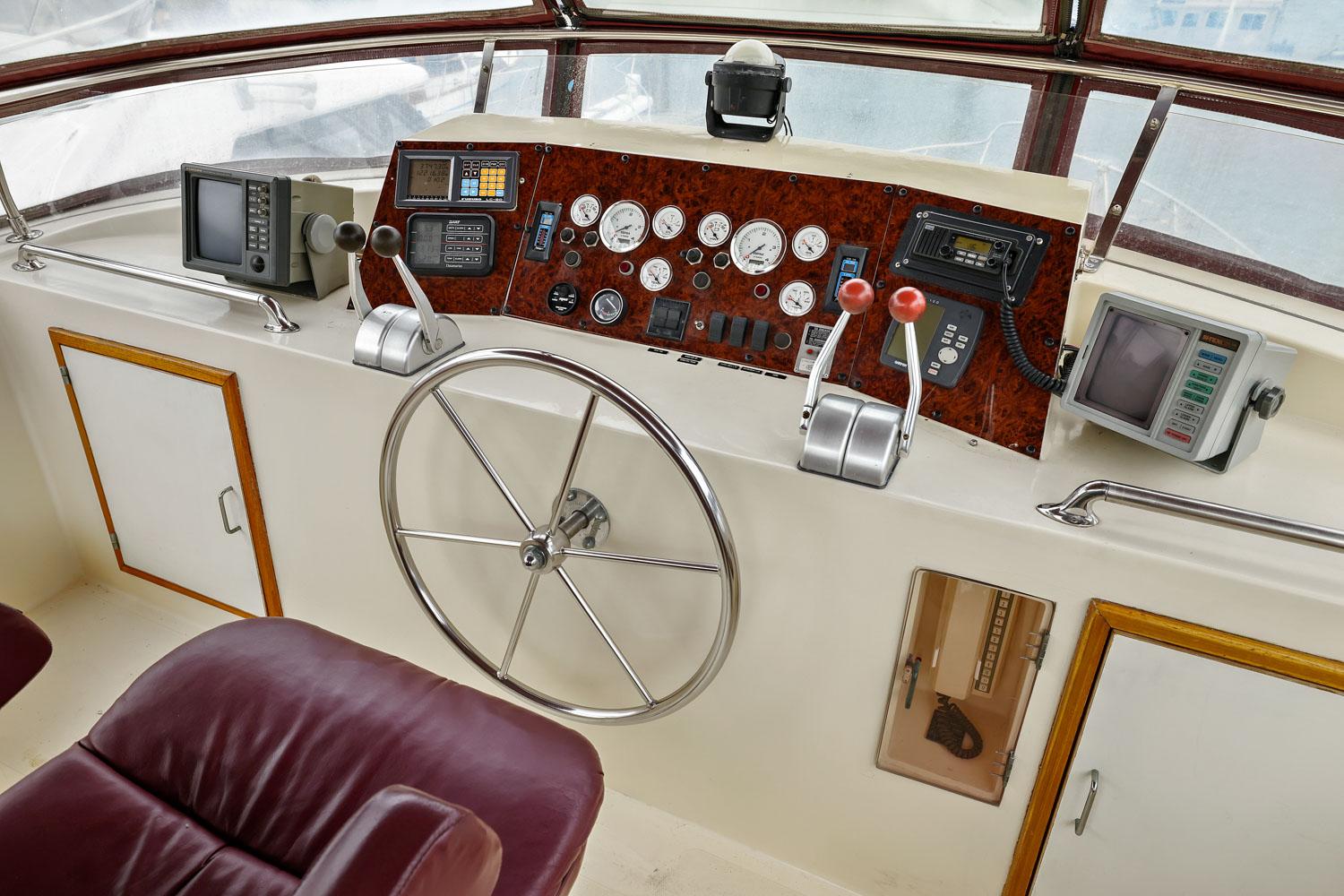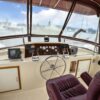 The flybridge is 3 steps up from the sundeck. The helm is forward. All necessary engine controls and instruments are protected by a canvass bimini top with isinglass side panels. There is a Captain’s chair and built-in seating for 8-10 guests.