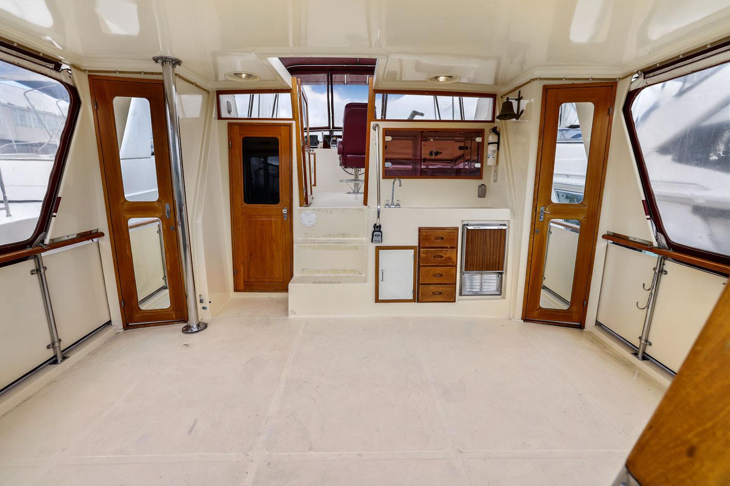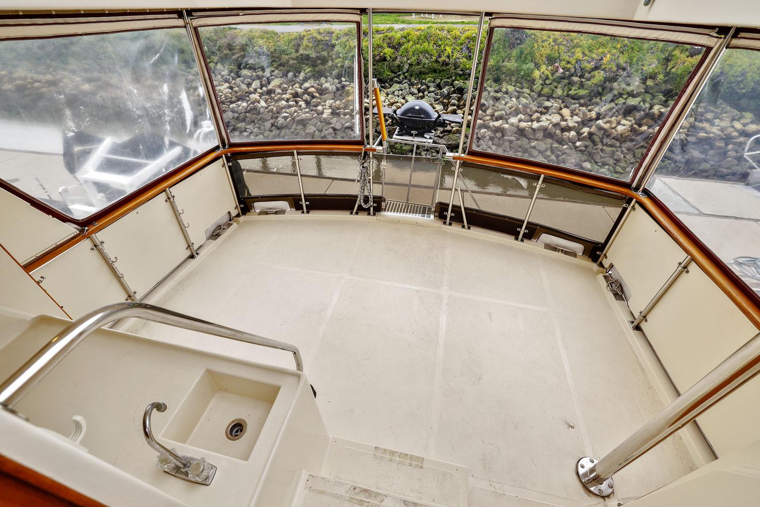 The spacious sundeck is 3 or 4 steps up from the salon. It has a hardtop with removable side panels. There is a hot & cold wet bar. Lots of room for various furniture arrangements.