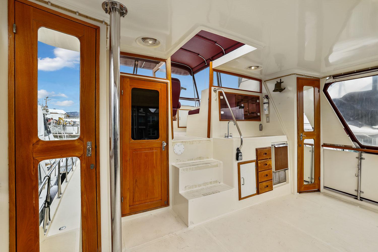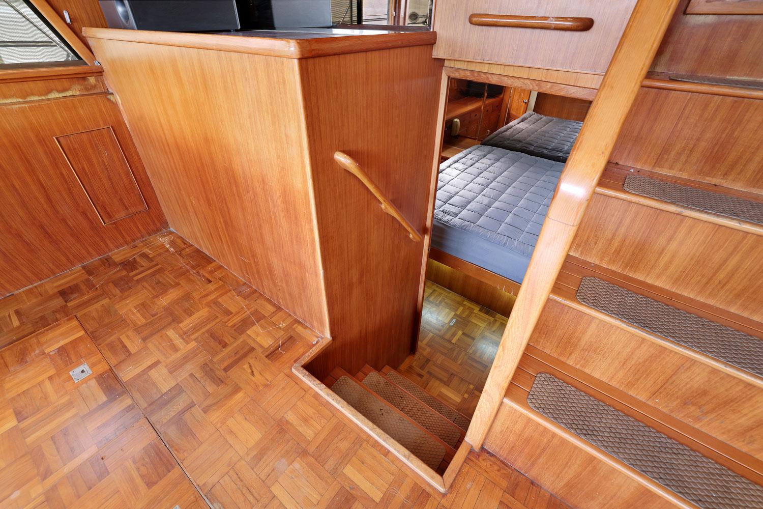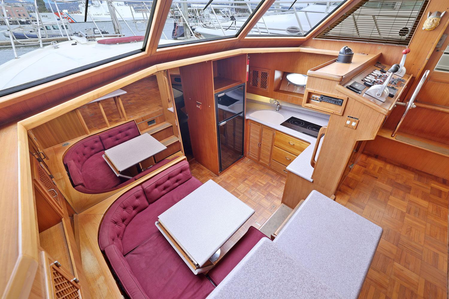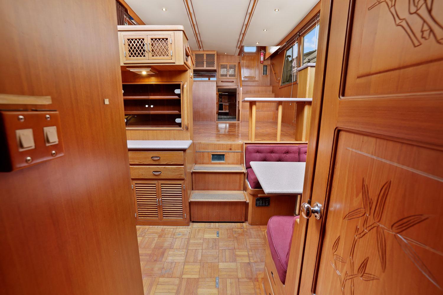 This spacious two-stateroom floor plan is arranged with the salon overlooking the galley and dinette below. The interior is finished with an abundance of well-crafted teak woodwork. There is plenty of fresh air ventilation with opening side windows and the two doors to the salon.