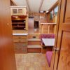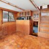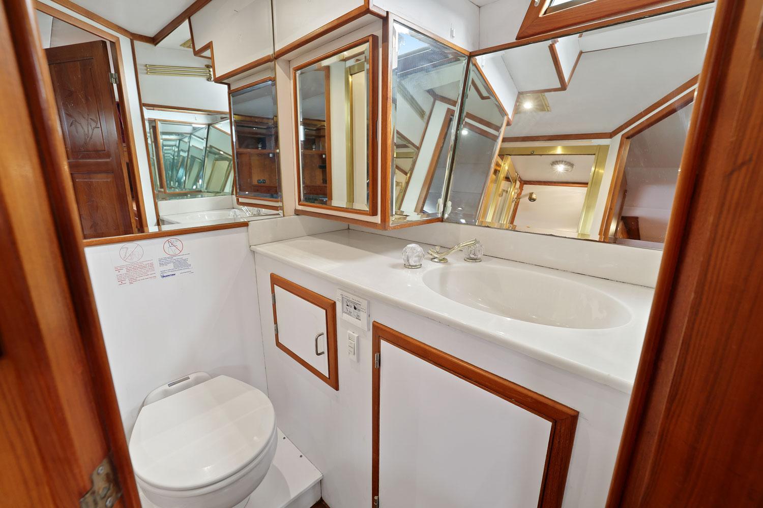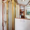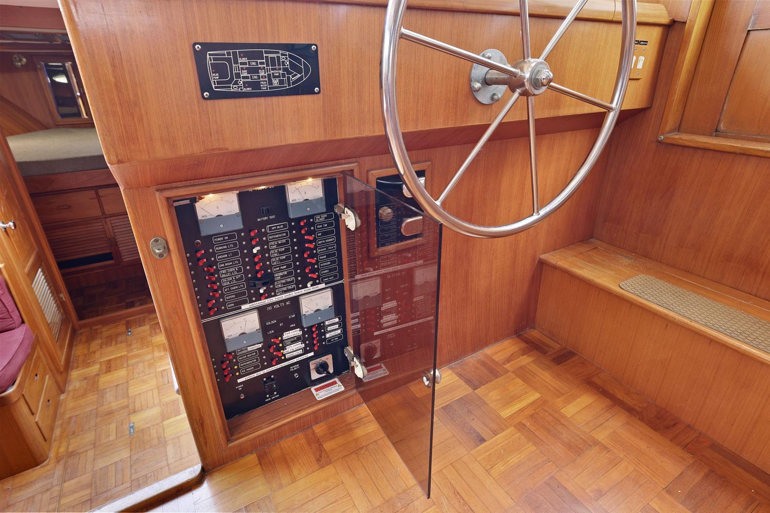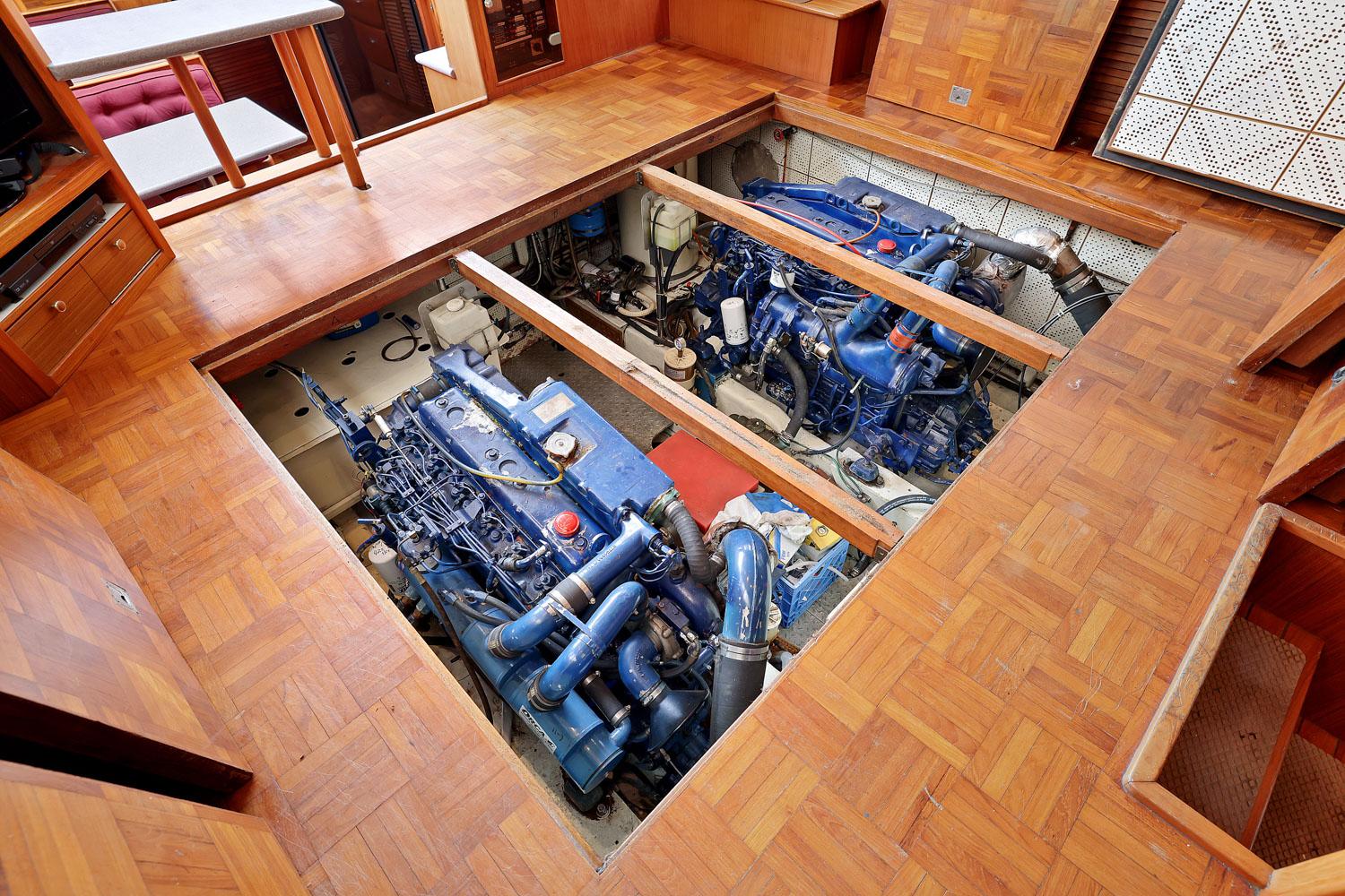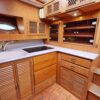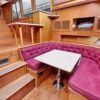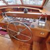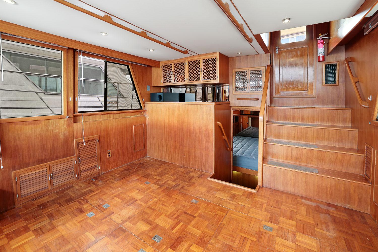 This spacious two-stateroom floor plan is arranged with the salon overlooking the galley and dinette below. The interior is finished with an abundance of well-crafted teak woodwork. There is plenty of fresh air ventilation with opening side windows and the two doors to the salon.