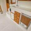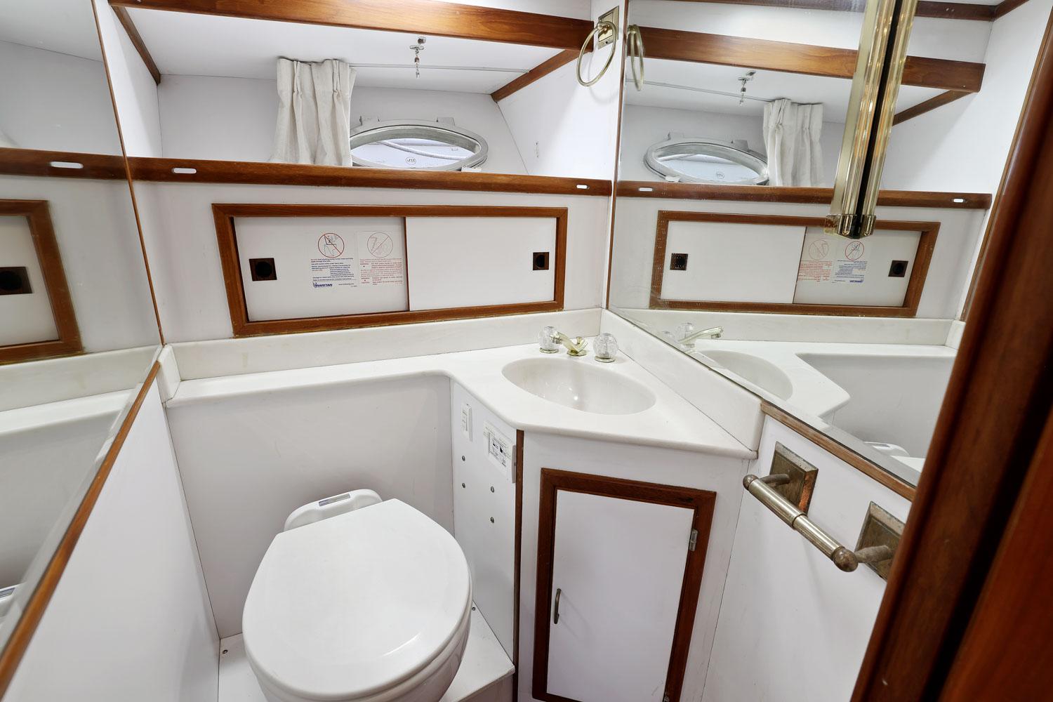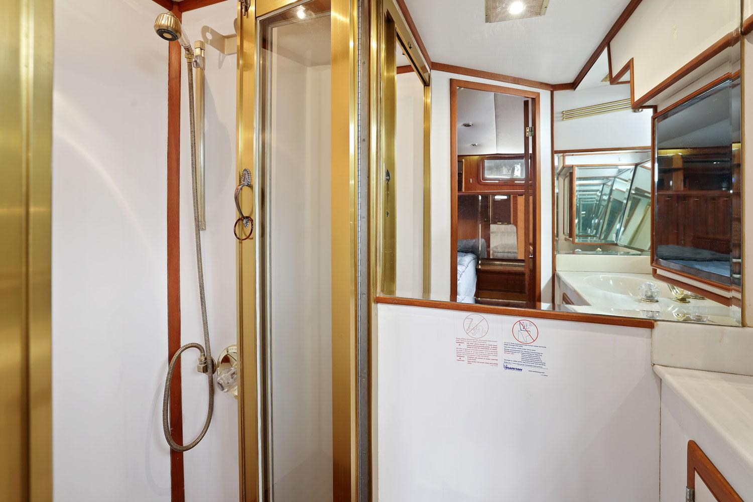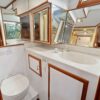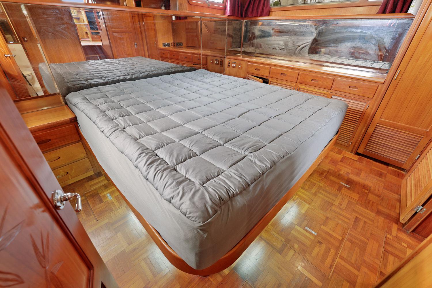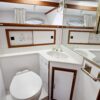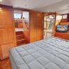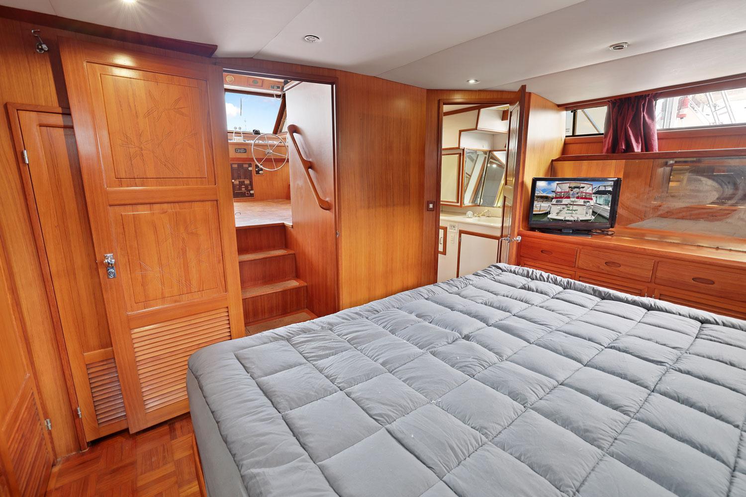 The owner’s stateroom is all the way aft. It has a queen-size bed and lots of storage drawers, closet, and cabinets. The ensuite head has a stall shower, vanity sink and electric toilet.