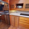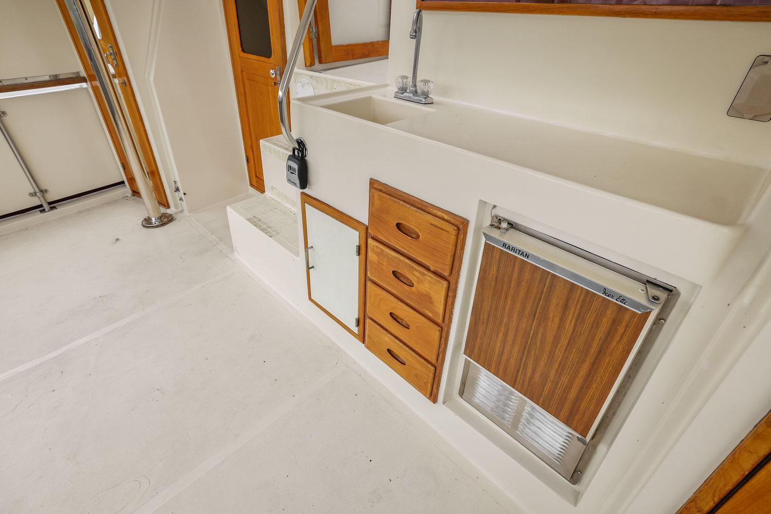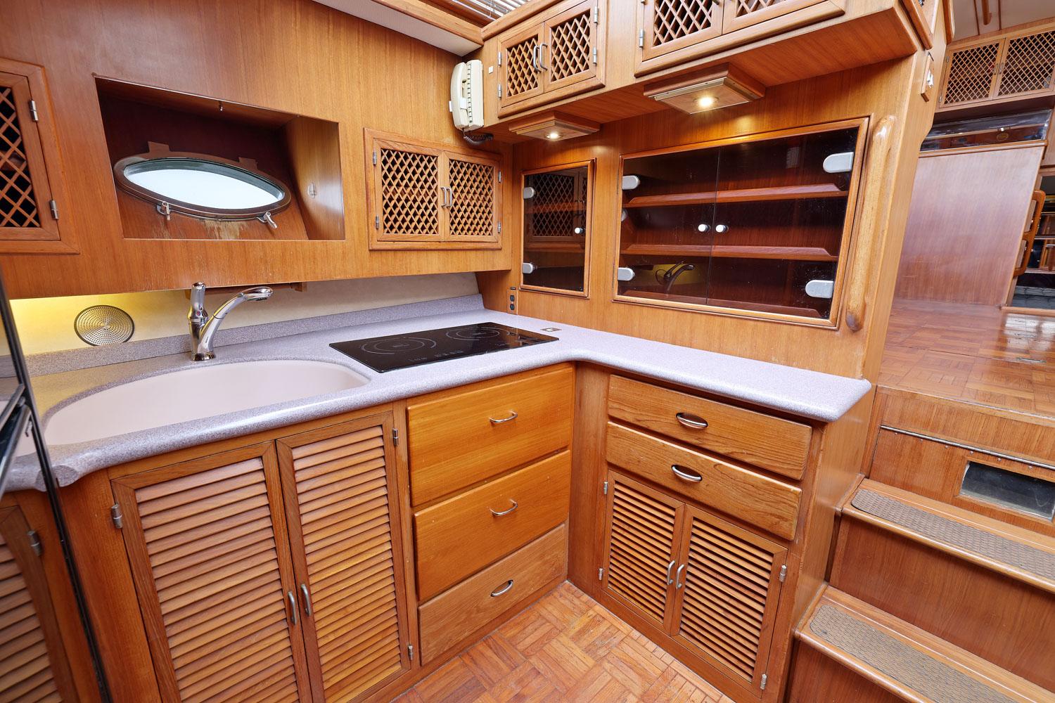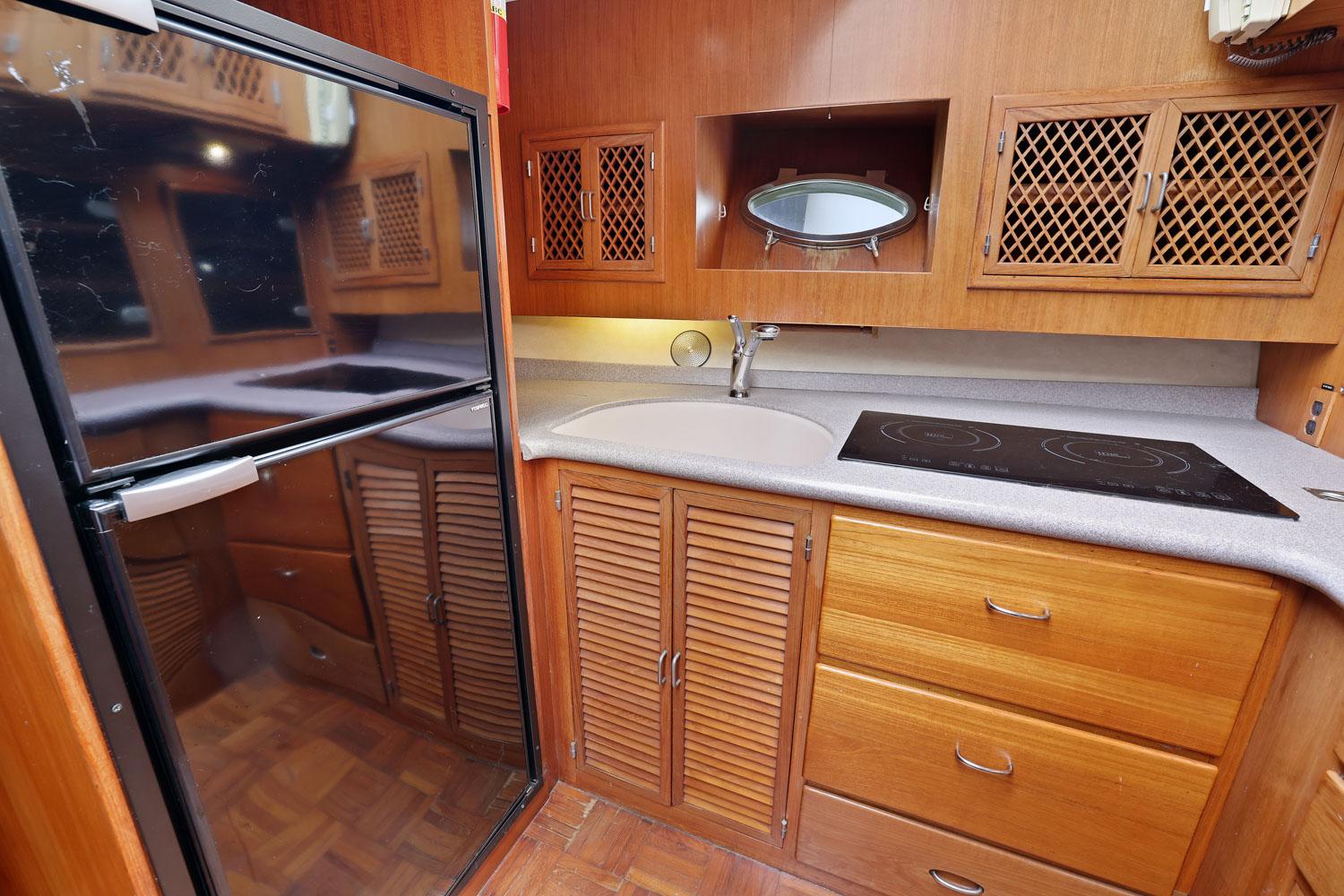 The galley and dinette are forward of the salon and down 3 steps, with refrigerator/freezer, two burner electric stove, twin sinks and abundant space and stowage. The dinette is large and comfortable and converts to a double berth.