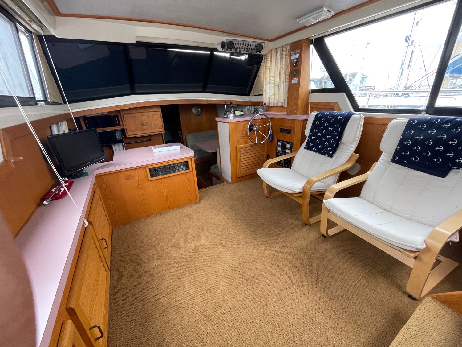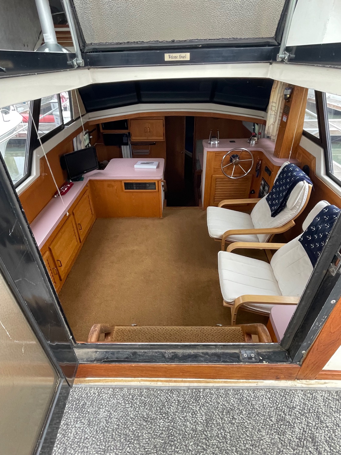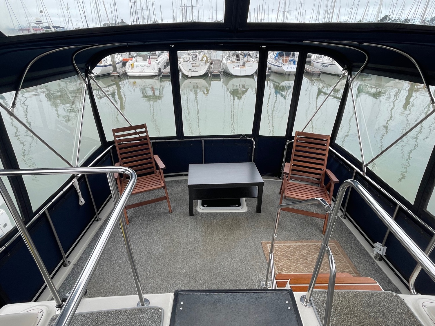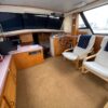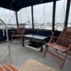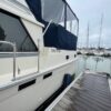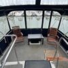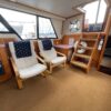 Complete galley includes refrigerator, microwave, and stove/oven. Lower deck has deck chairs and table; fully enclosed canvas with isinglass on the flybridge and aft deck. Upper deck has three swivel chairs for captain and guests