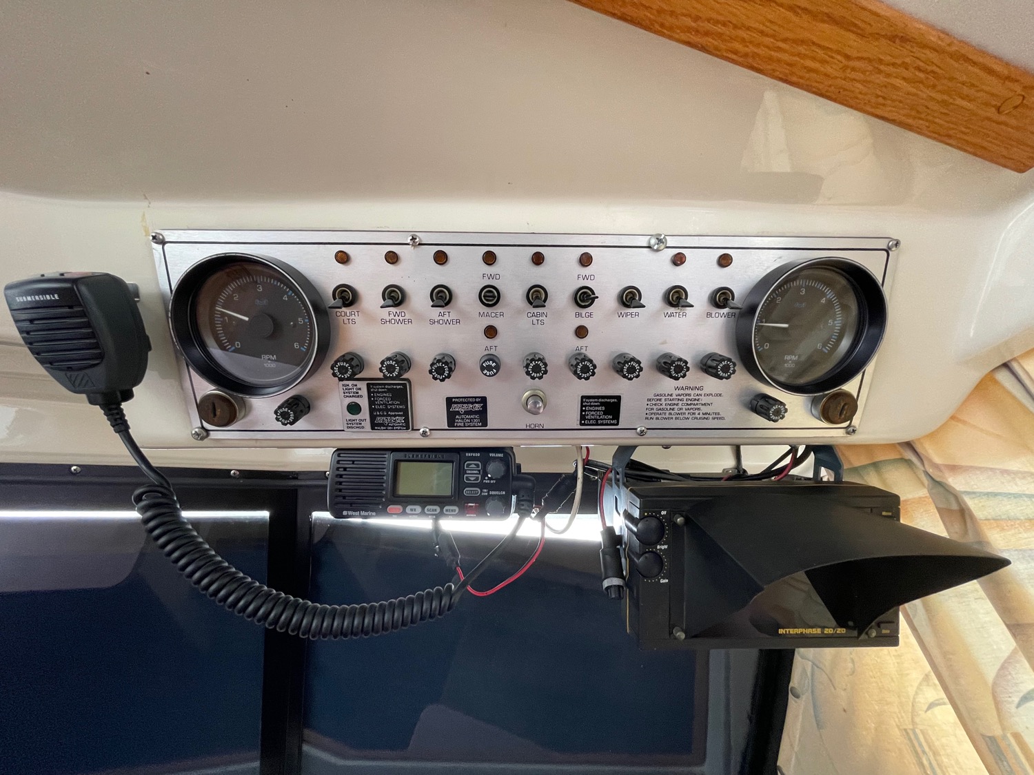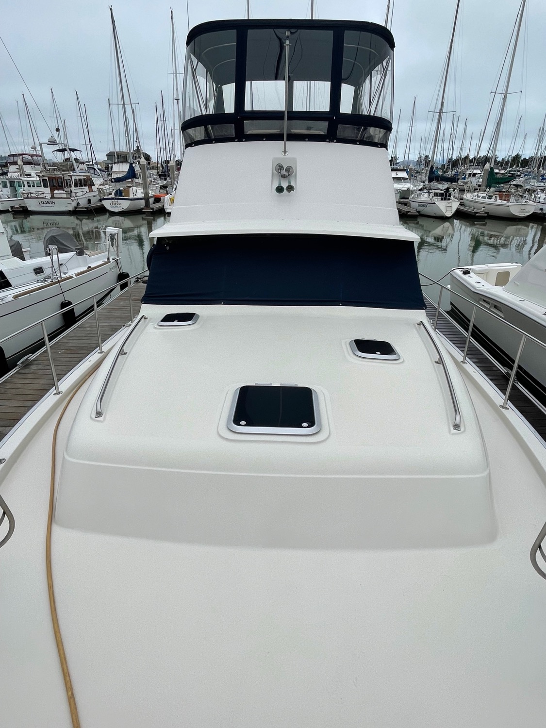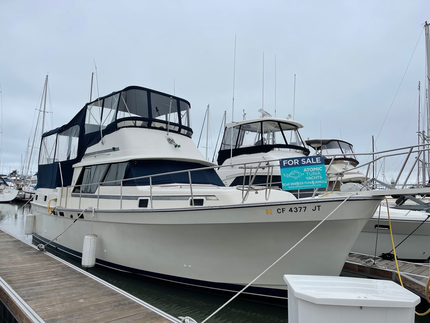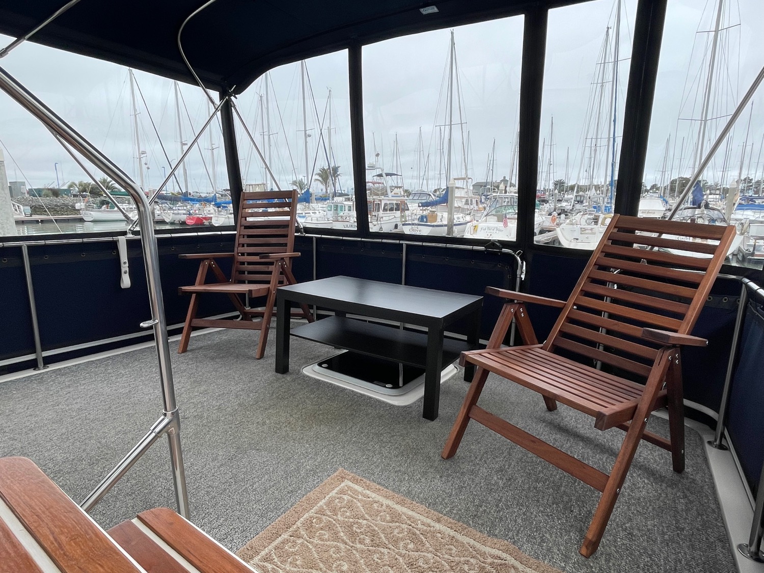 Complete galley includes refrigerator, microwave, and stove/oven. Lower deck has deck chairs and table; fully enclosed canvas with isinglass on the flybridge and aft deck. Upper deck has three swivel chairs for captain and guests
