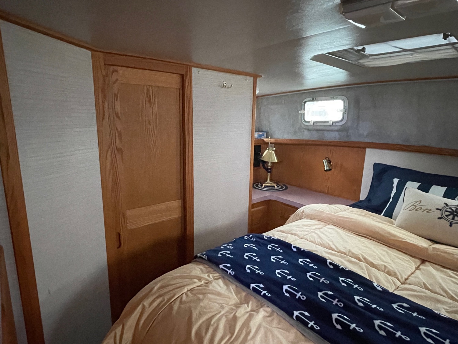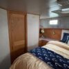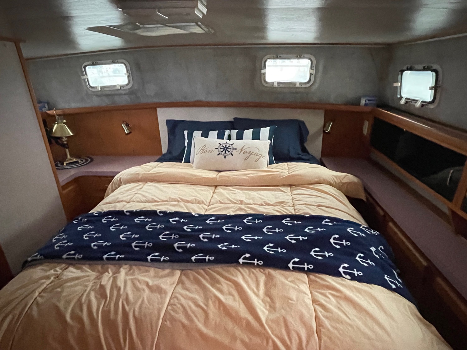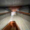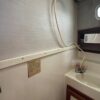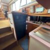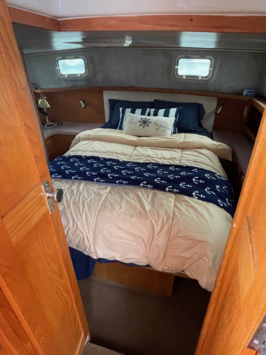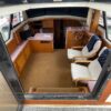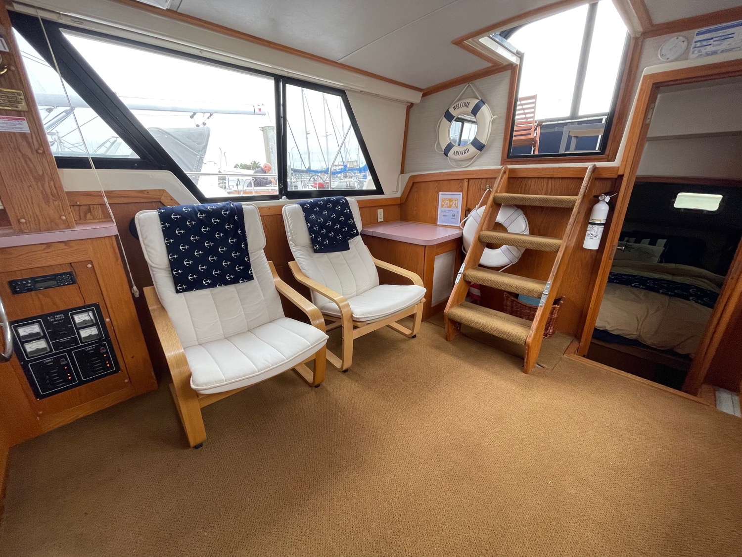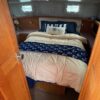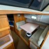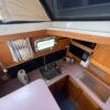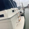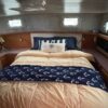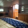 You can board TERRAPIN from either side. There are dual helm stations, in the main salon and flybridge. Two staterooms (v-berth and a walk around queen aft berth) and two heads. Very spacious throughout cabin and cockpit.