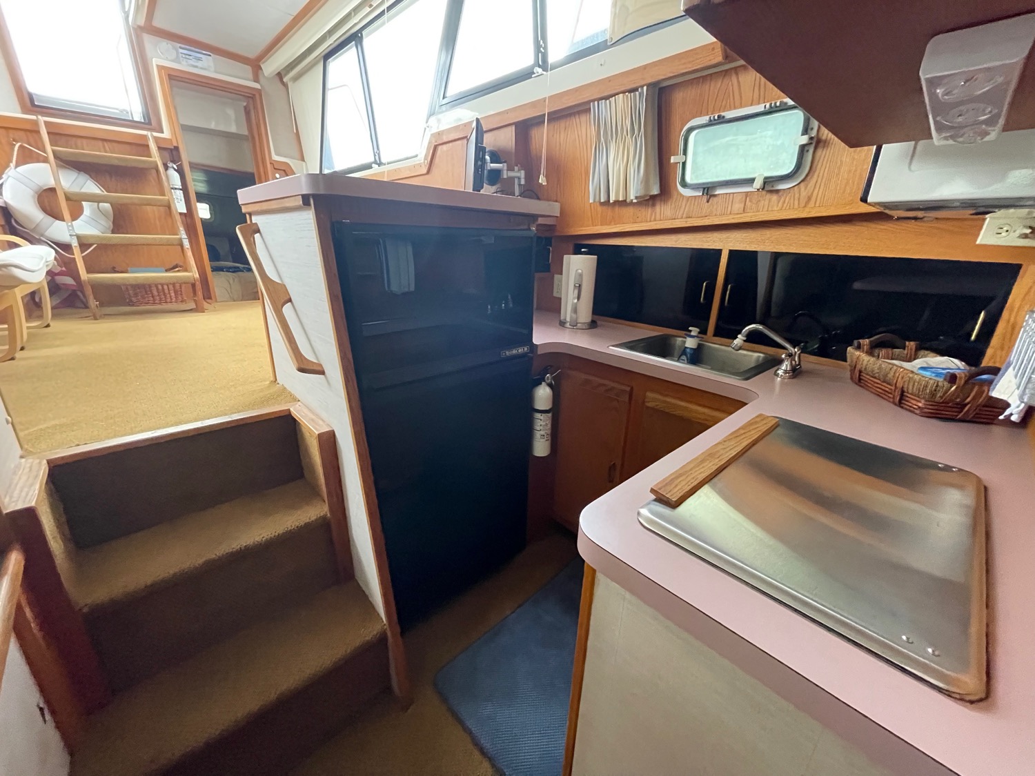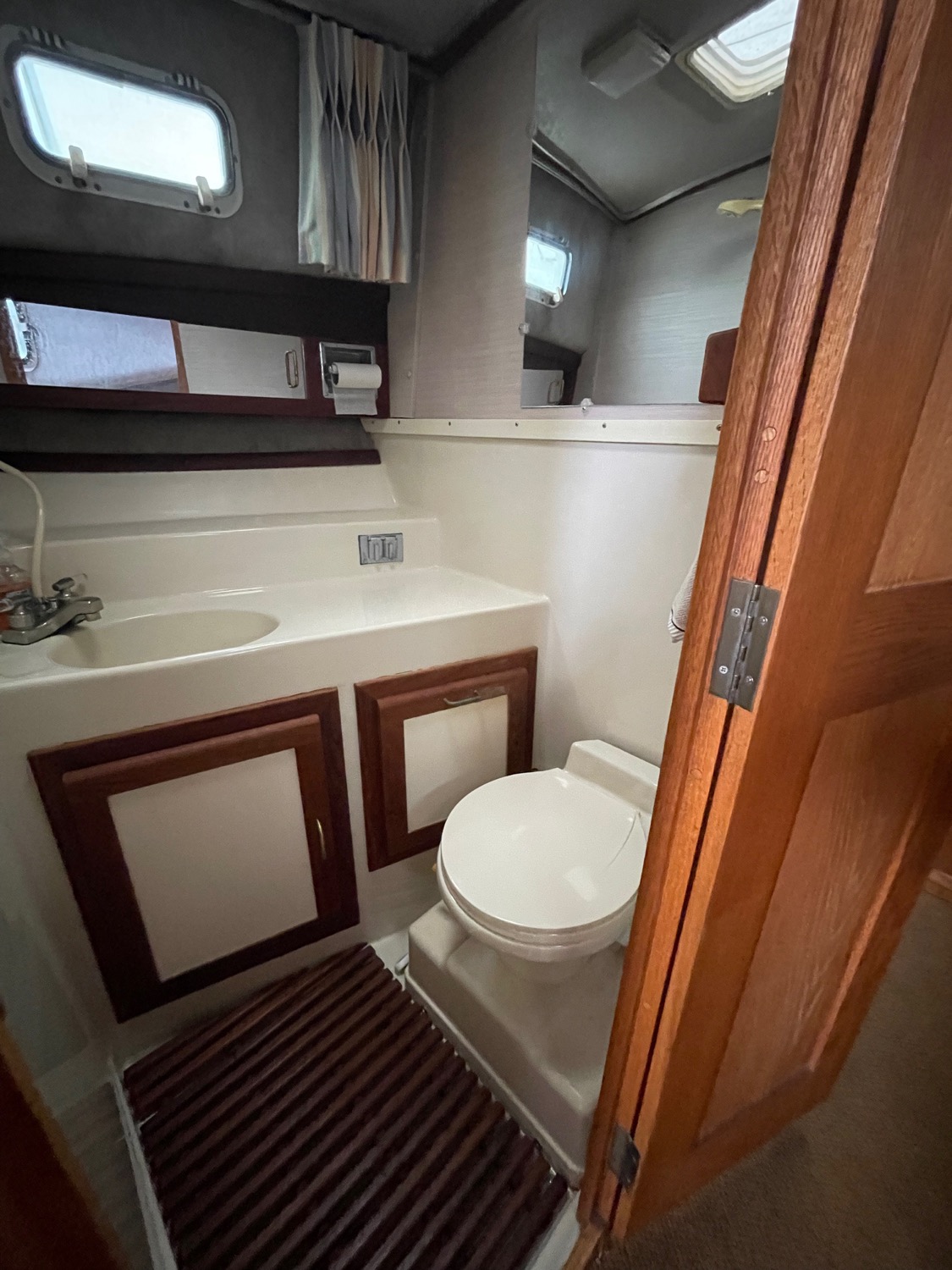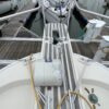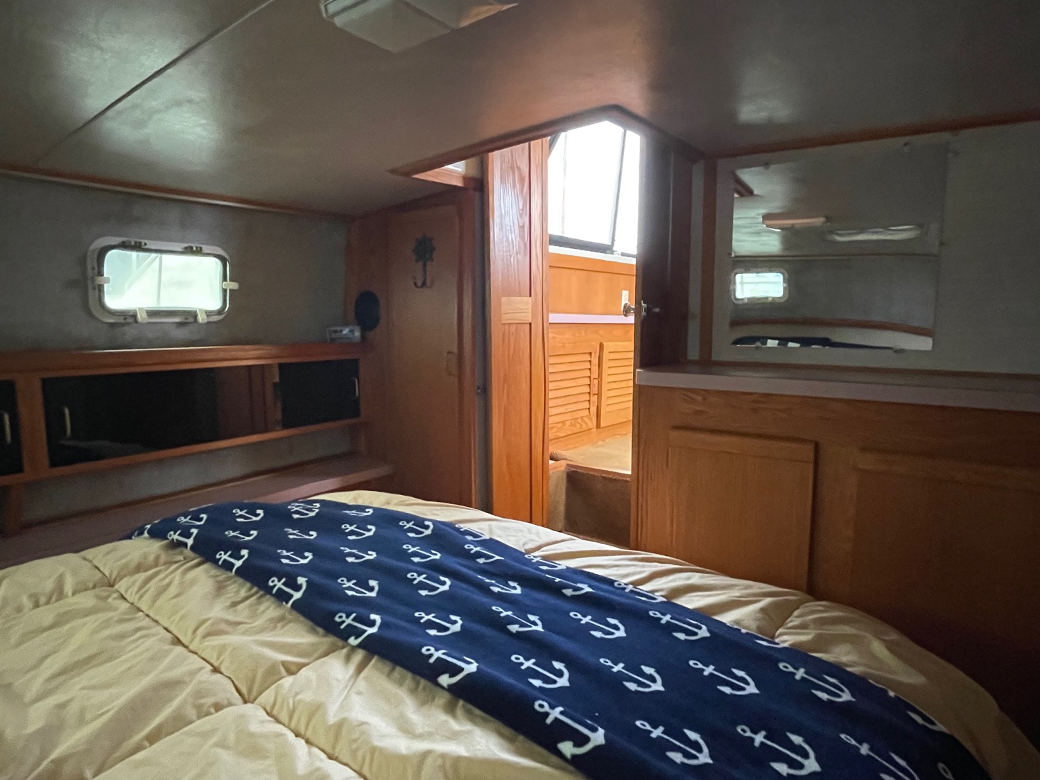 You can board TERRAPIN from either side. There are dual helm stations, in the main salon and flybridge. Two staterooms (v-berth and a walk around queen aft berth) and two heads. Very spacious throughout cabin and cockpit.
