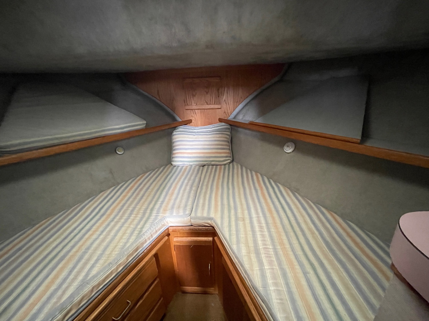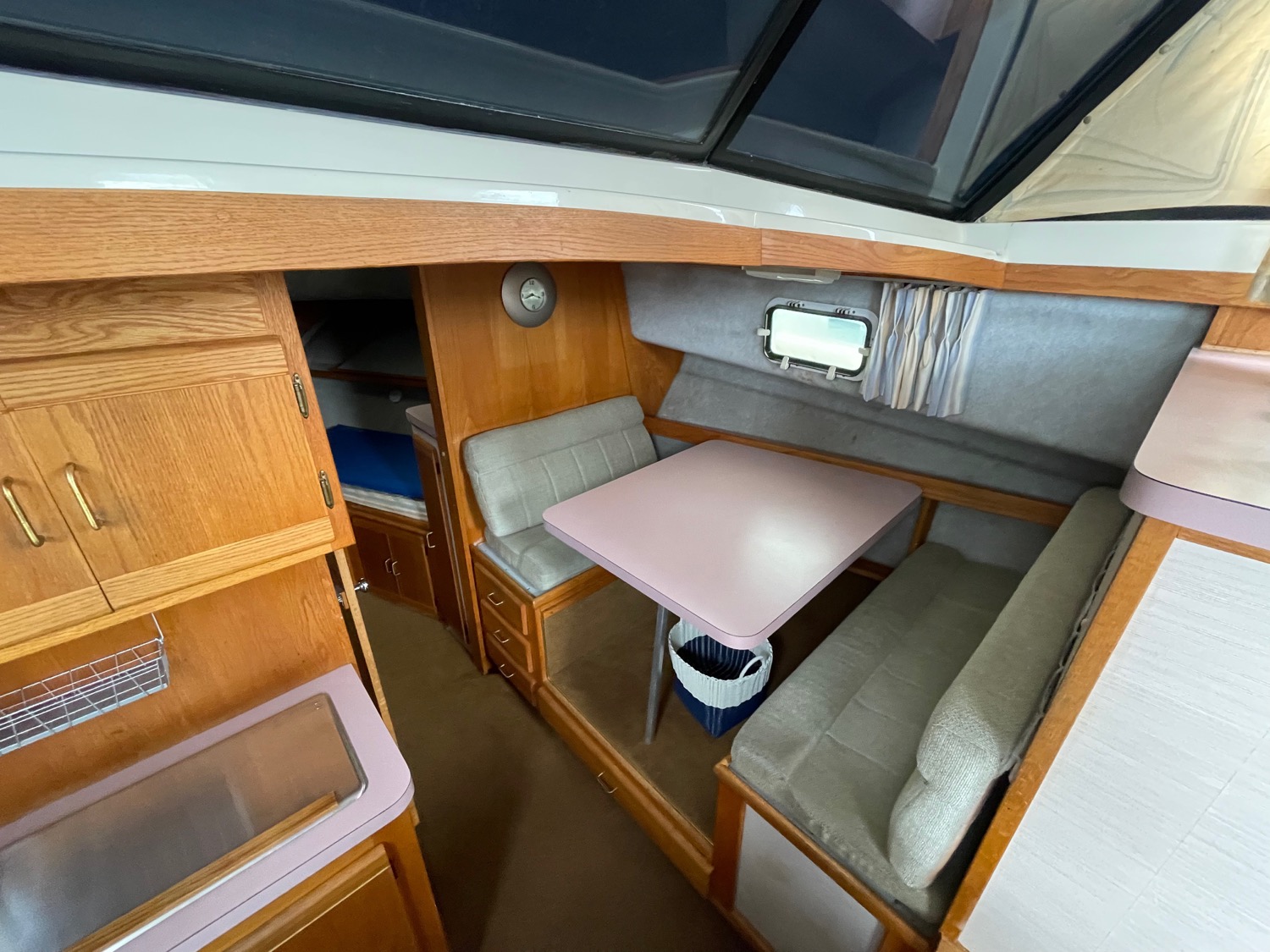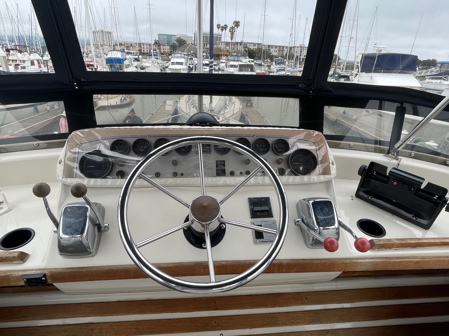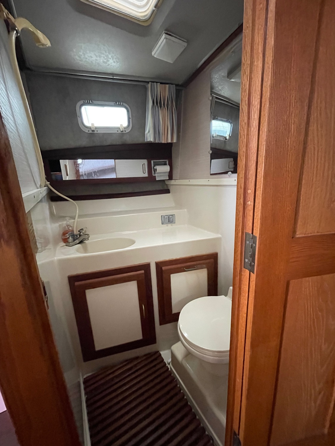 You can board TERRAPIN from either side. There are dual helm stations, in the main salon and flybridge. Two staterooms (v-berth and a walk around queen aft berth) and two heads. Very spacious throughout cabin and cockpit.