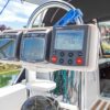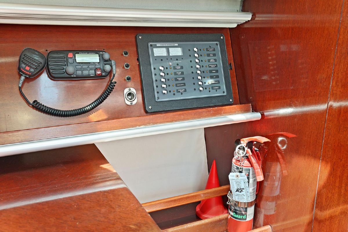 Aft of the saloon and to starboard is the L shaped navigation station with a large chart table, instrument panel and storage for books and guides. There is an array of instruments.