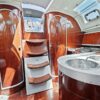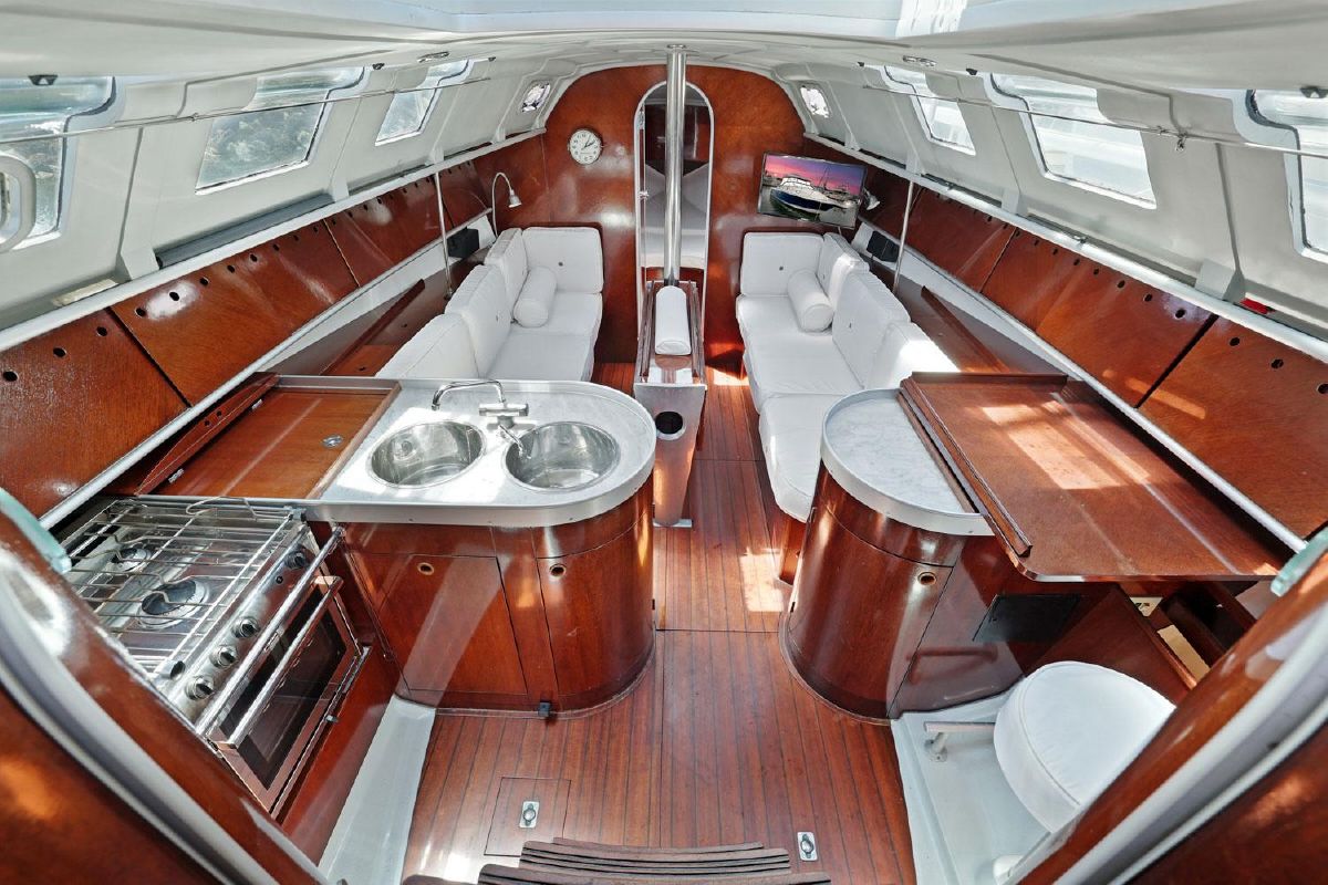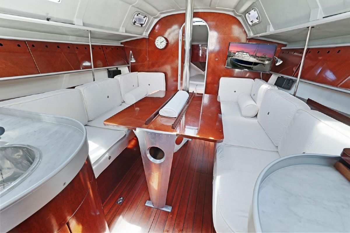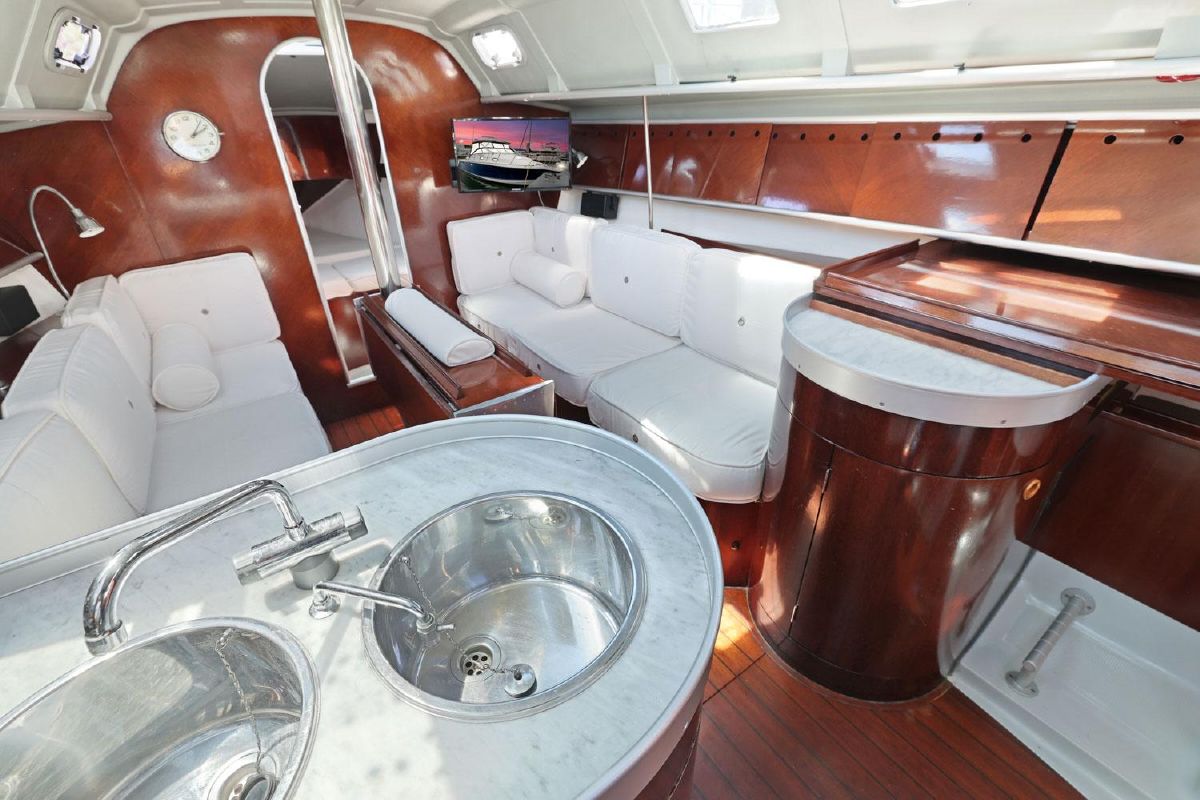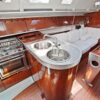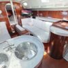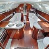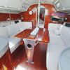 Aft of the forward cabin is the saloon which has a central saloon table with drop leaves supported by machined aluminium supports, which allows up to six people to sit around the table in comfort. It also provides easy access from either side of the table to the forward cabin.