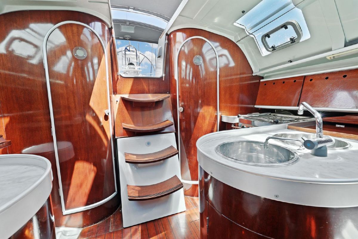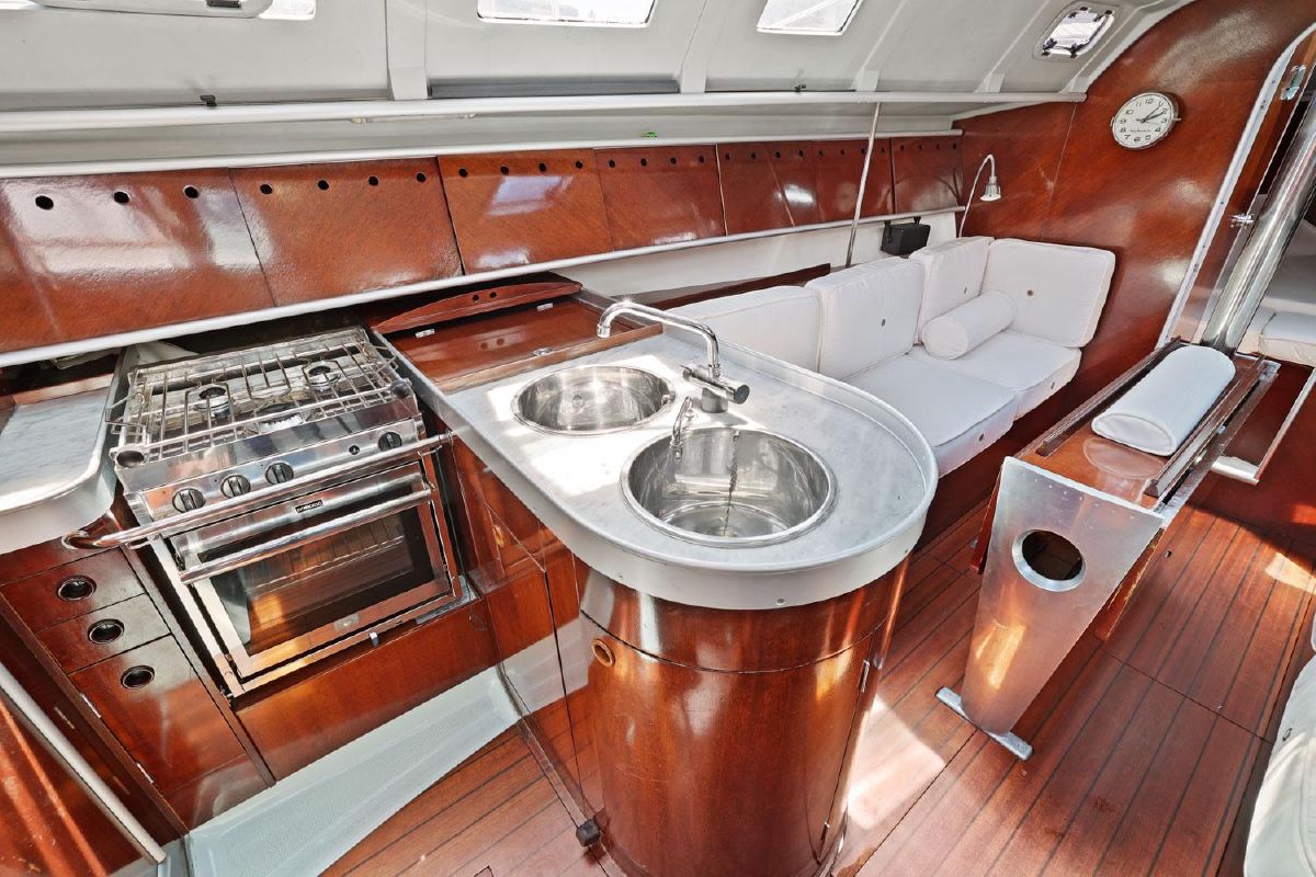 Opposite the navigation station to port is the galley which consists of a gas cooker with oven and grill, 12V fridge, stainless steel sink with hot and cold pressurized water supply and ample storage.