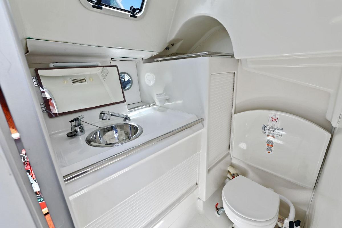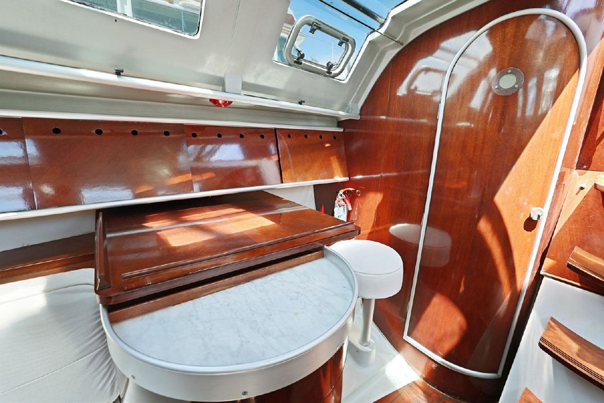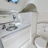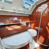 Aft of the navigation station is a separate heads compartment with marine toilet, sink and shower.