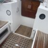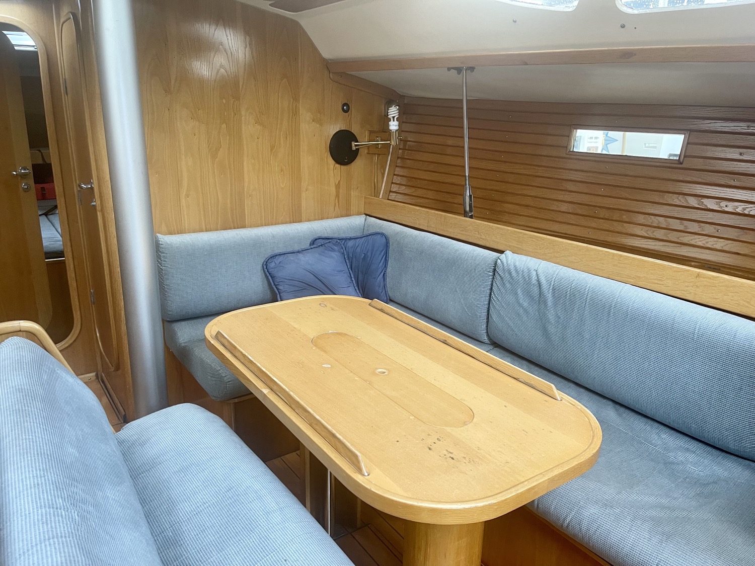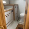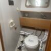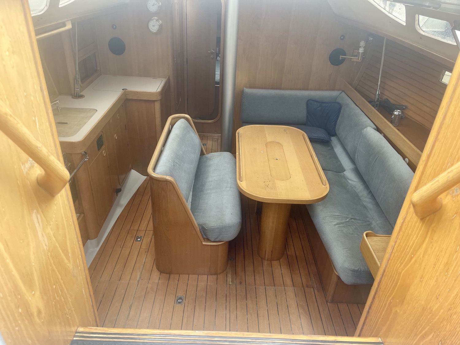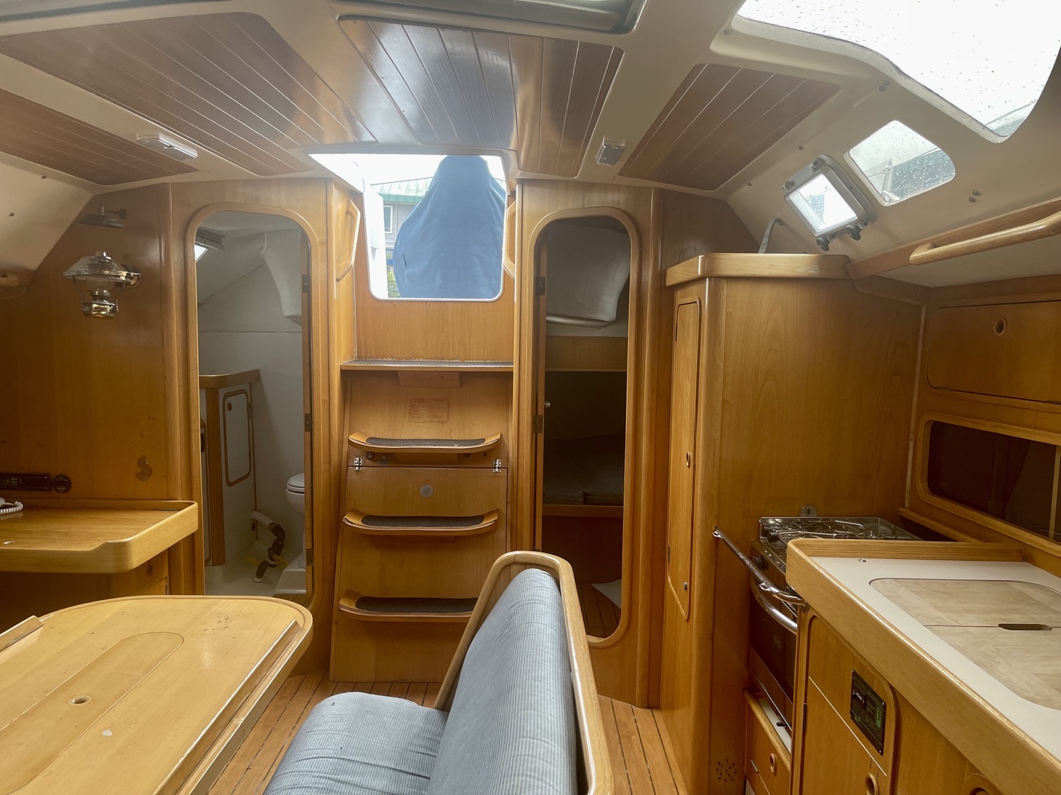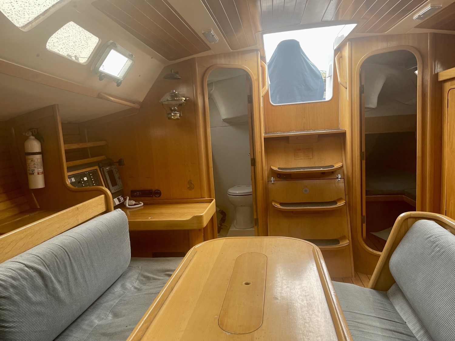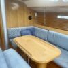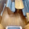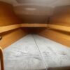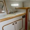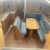 Forward of the nav station on starboard is a really large table with settee. You’ll have no trouble seating six comfortably here. There is another bench in the middle of the boat and the galley is contained in one long counter down the port side. On the port side of the cabin is a head and aft of that another cabin with bed under the cockpit.