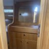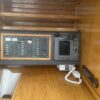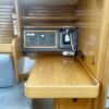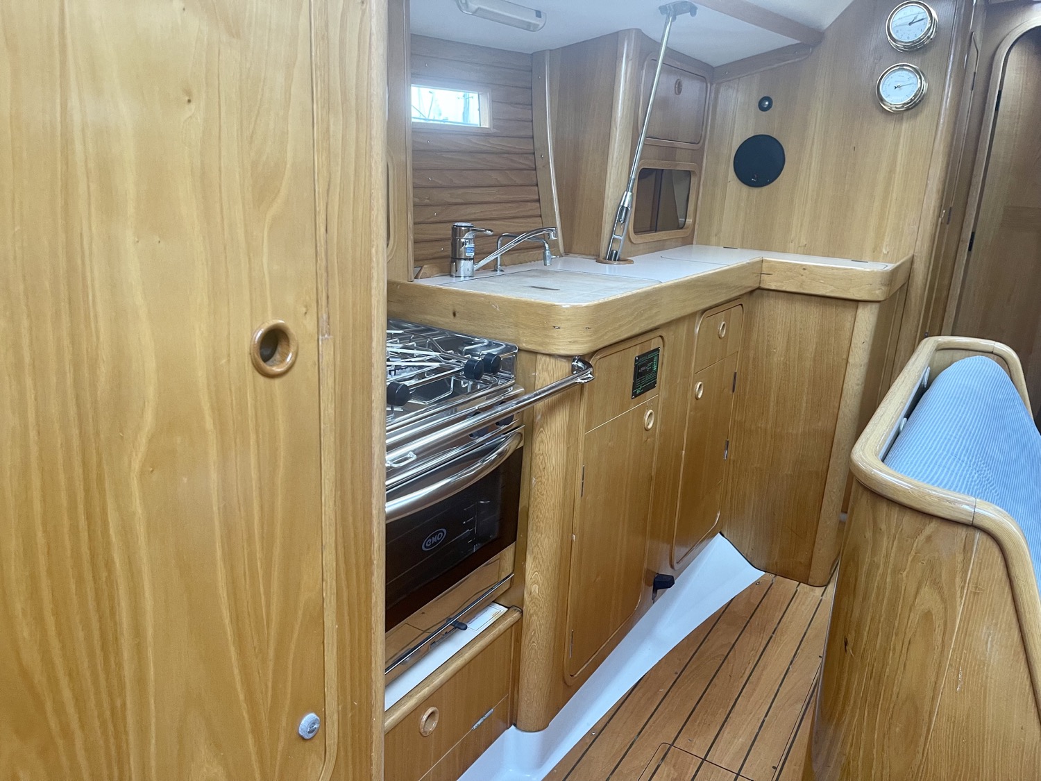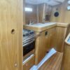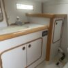 Port side, across from the salon is the galley which has multiple cabinets with plenty of storage. The galley is equipped with an ENO propane stove with oven, a double stainless steel and a refrigerator.