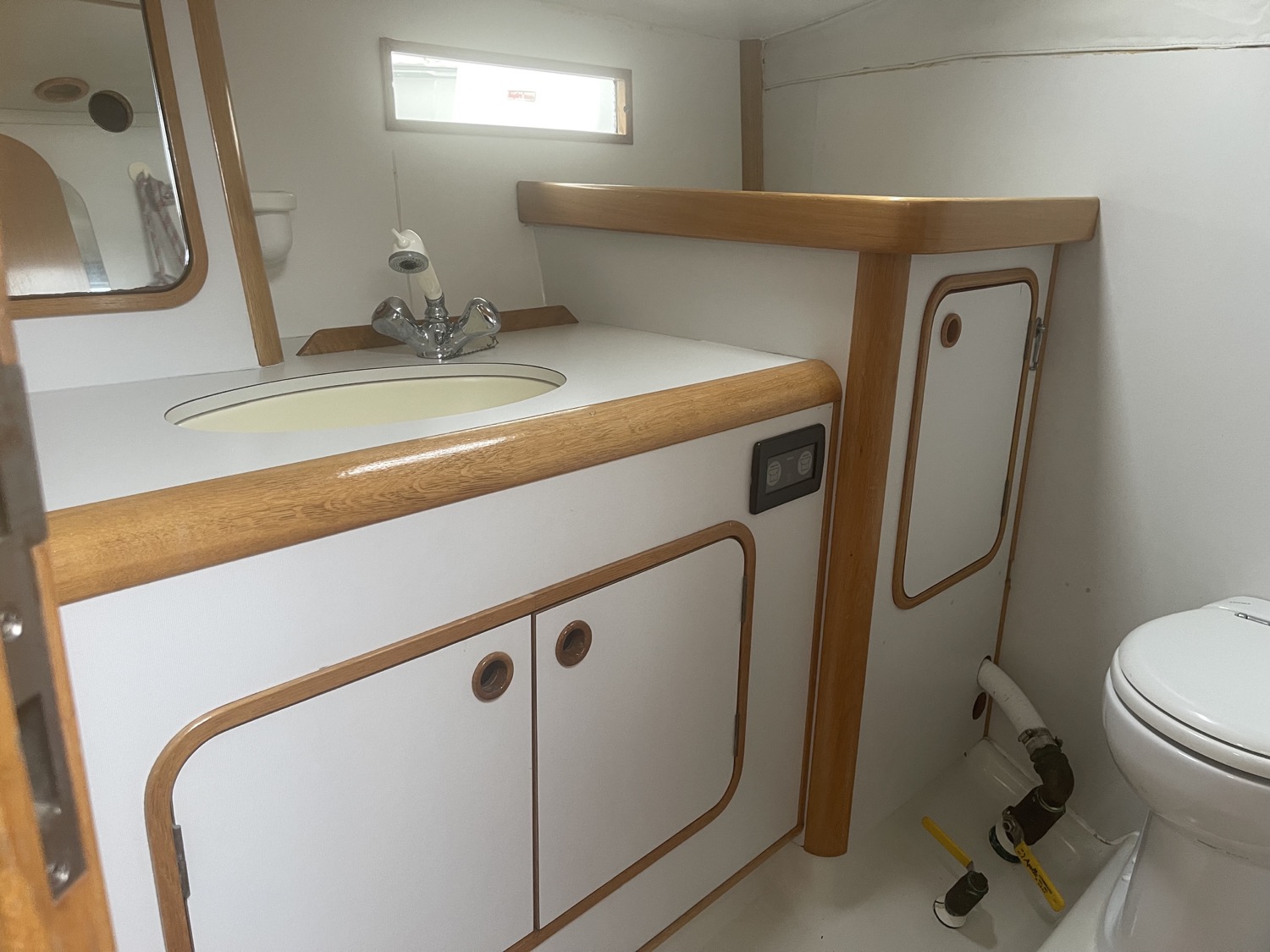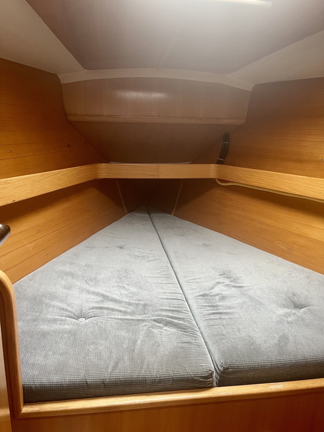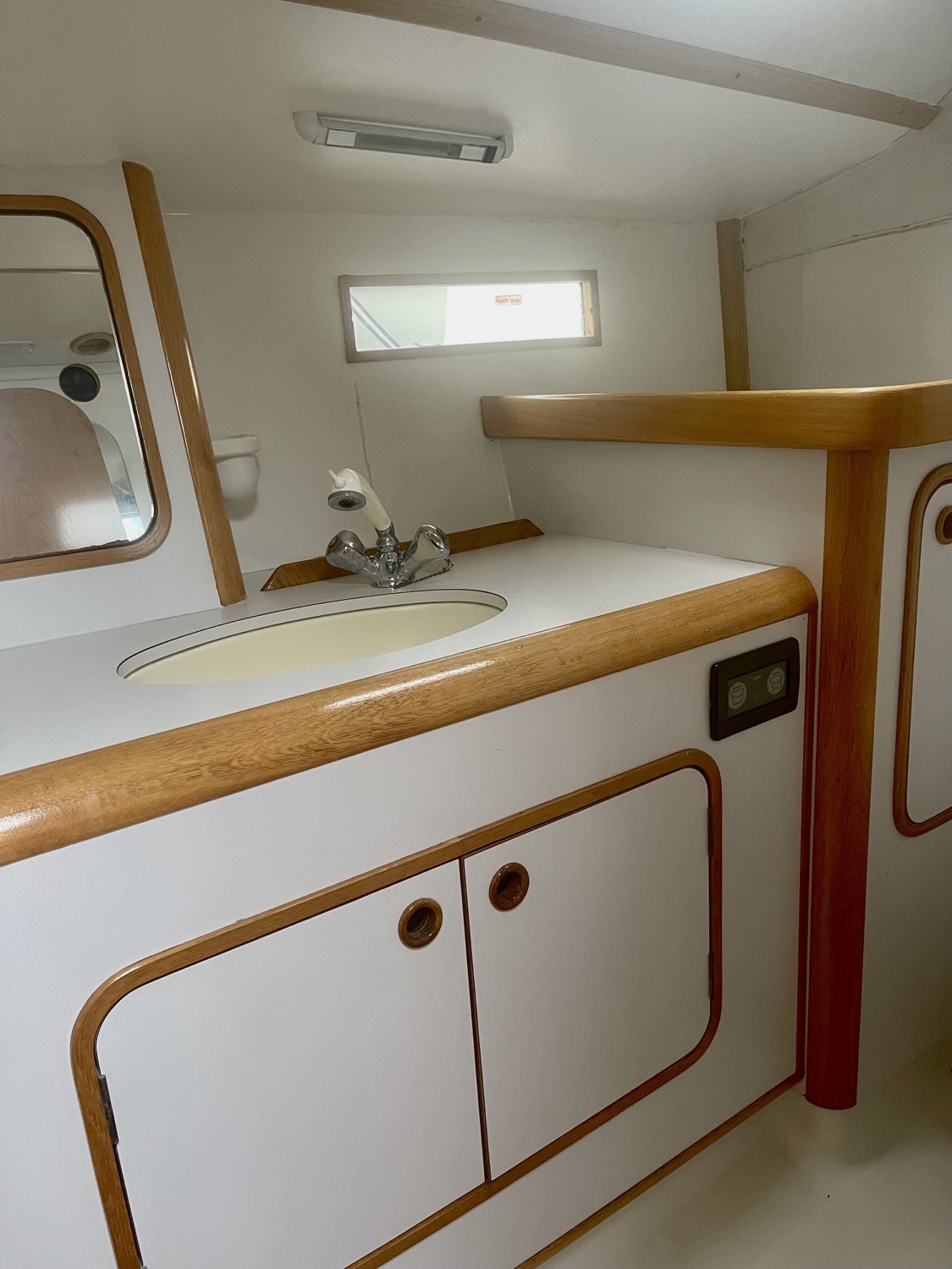 Forward of the salon on the starboard side is a head with shower (wet head). Foward of that is the v berth cabin with a privacy door, storage and vanity mirror.