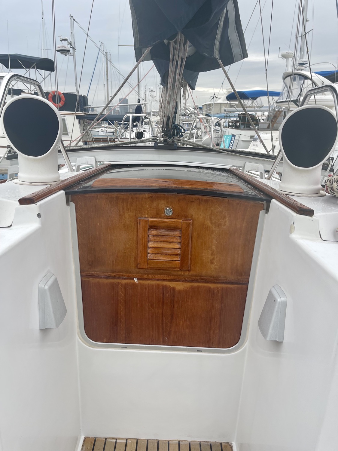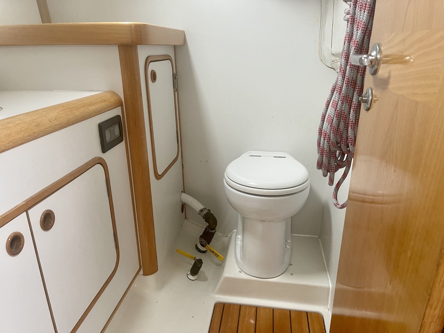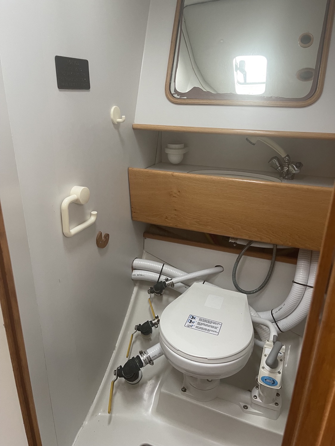 Forward of the salon on the starboard side is a head with shower (wet head). Foward of that is the v berth cabin with a privacy door, storage and vanity mirror.