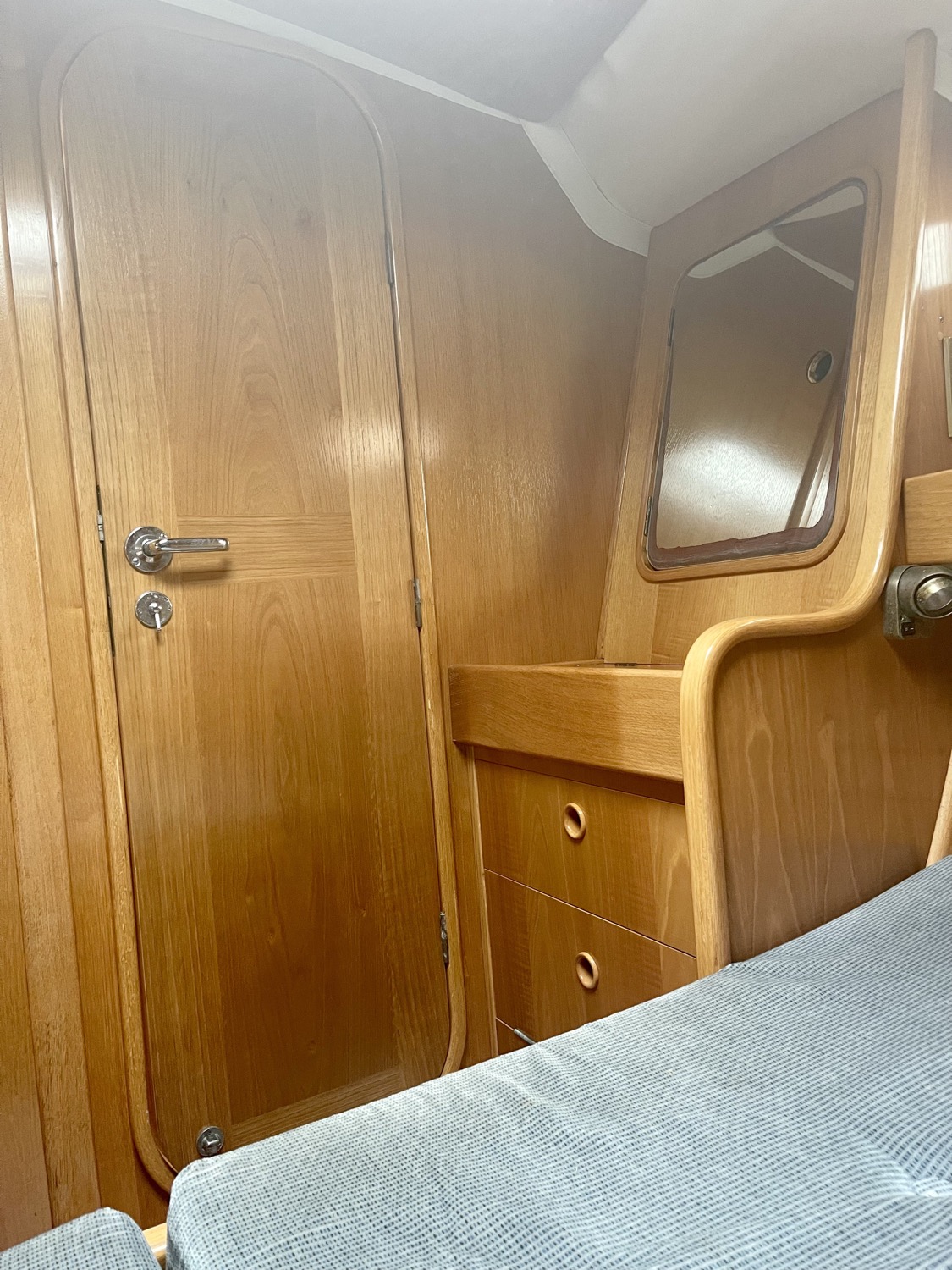 Stepping down the companion way you will first notice the headroom and bright it is from the natural light. At the base of the stairs to starboard is the navigation table. Aft of the navigation table is a spacious head with step in shower. Port aft of the companion way stairs is a double berth cabin. There are numerous cabinets and lockers in this cabin.