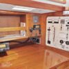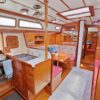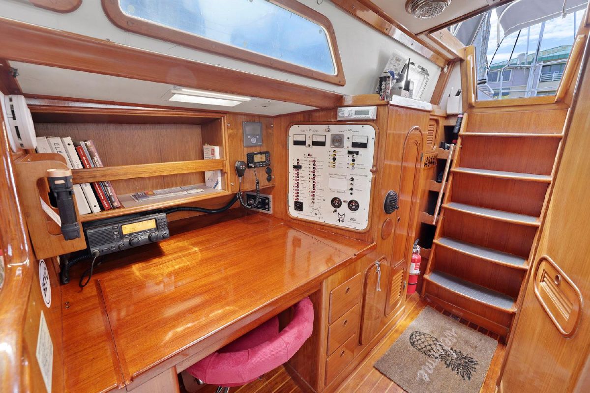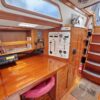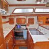 Aft of the starboard settee is the navigation station equipped with full electronics, electrical distribution panel, flip up chart table, drawers and swing out navigators? stool. Galley is located across from the nav station.