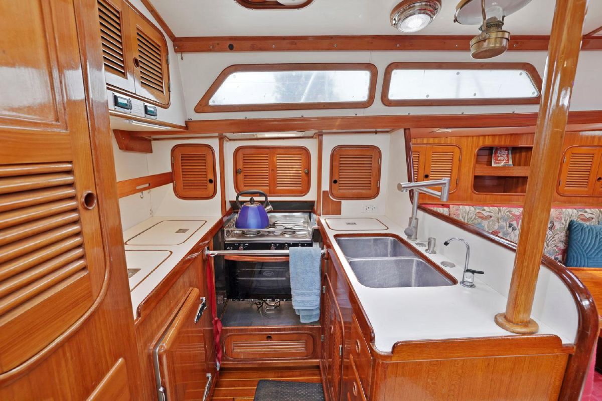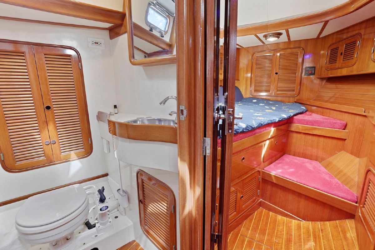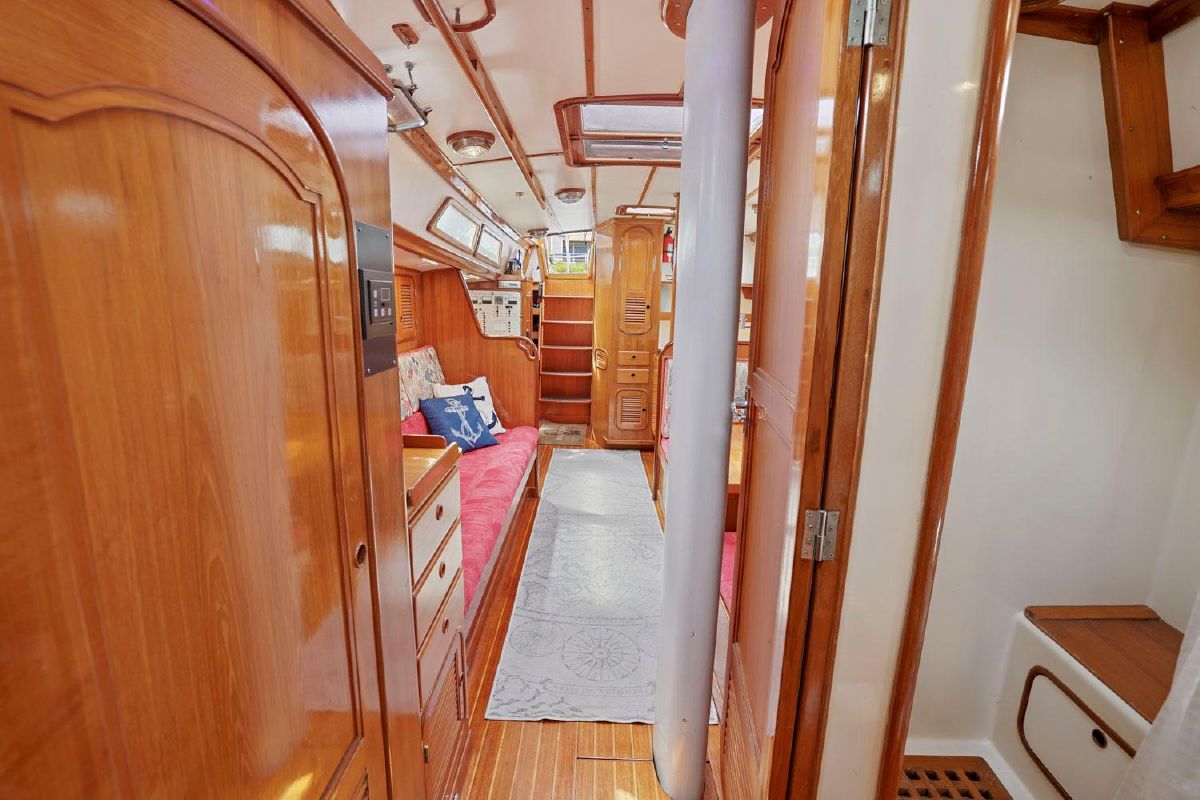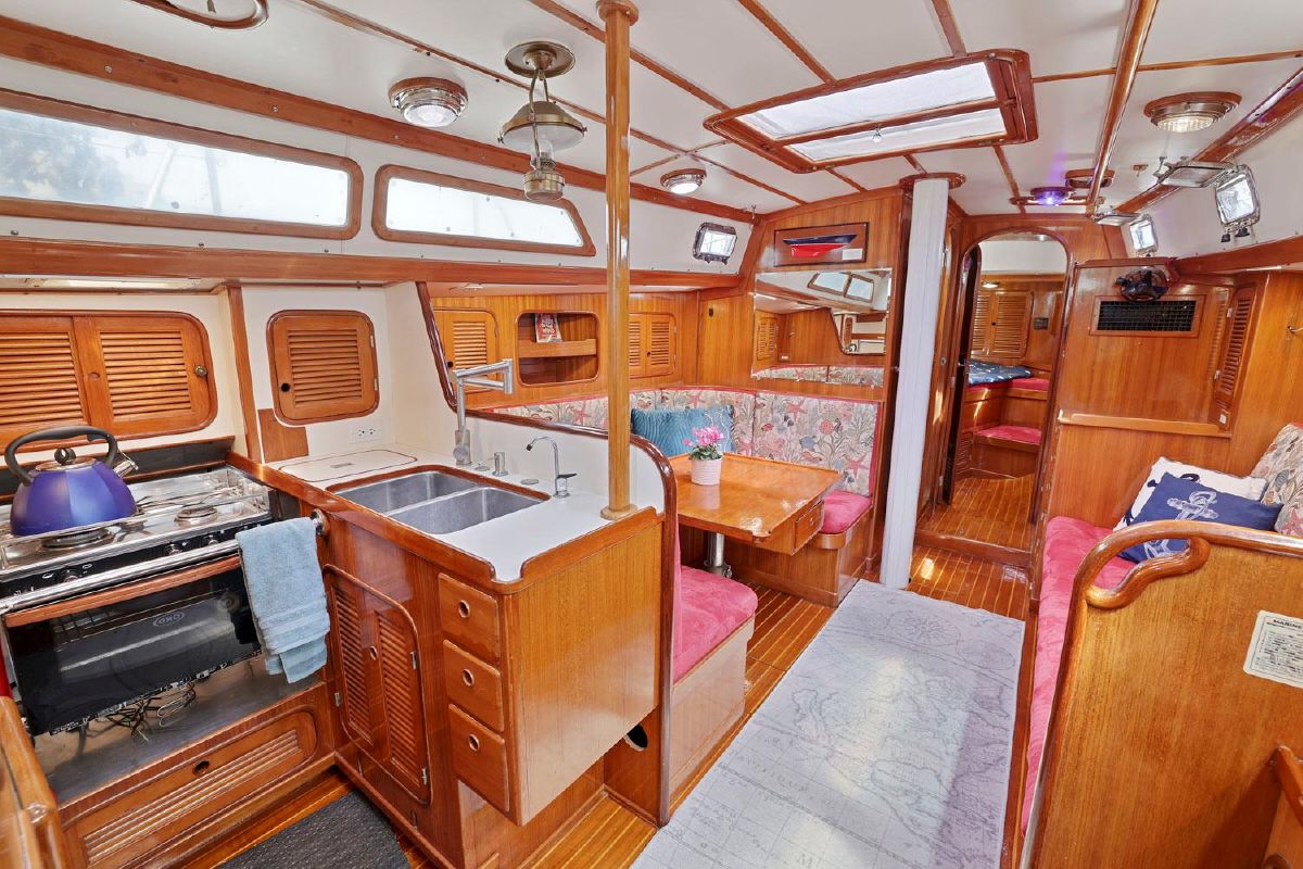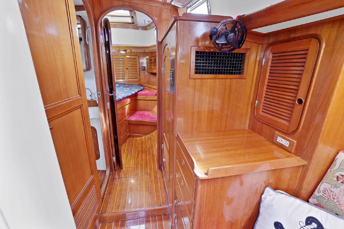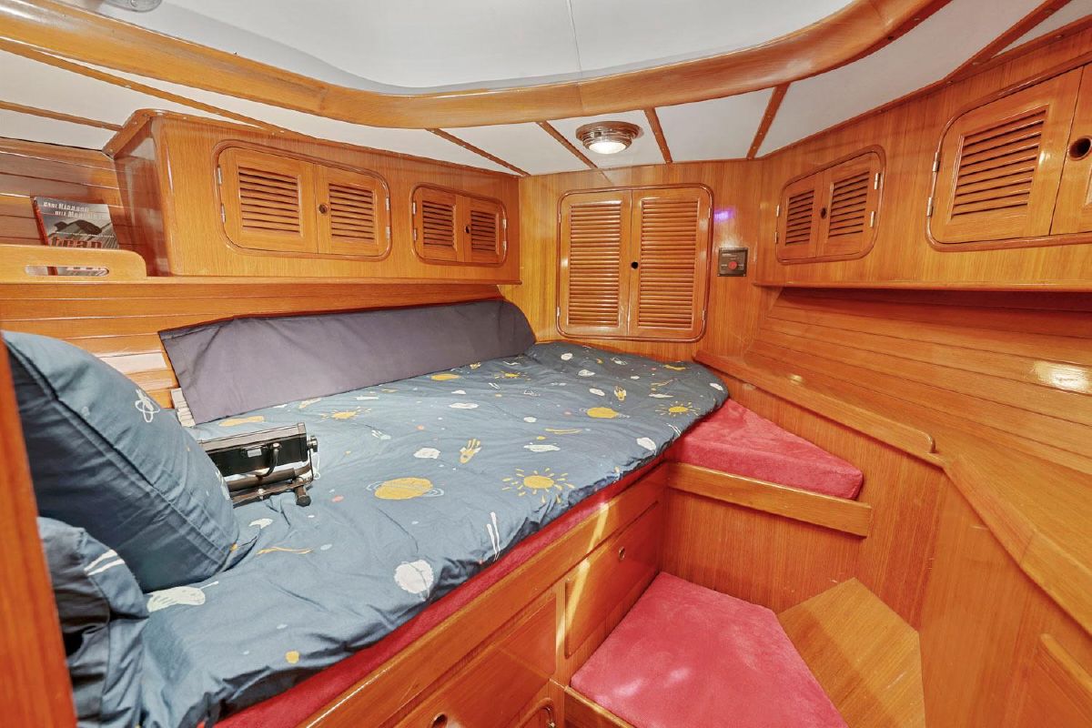 Below, you will be amazed by the craftsmanship and joinery. The warm & well-maintained teak interior, accented by the teak & holly cabin sole highlight the well thought out cabin. There are two private berths, one in the forepeak, one aft of the galley to port.