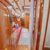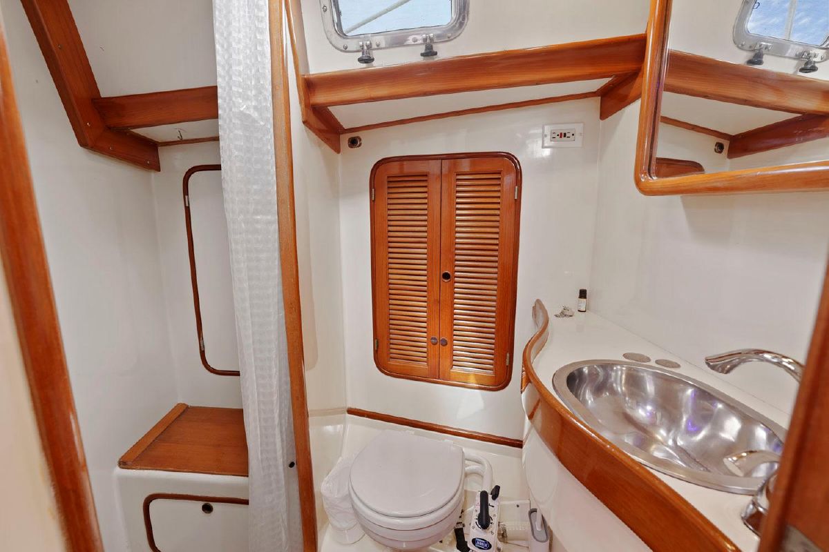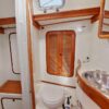 Aft and to port is the head, vanity with stainless sink, and Corian countertop. Separate, large stall shower compartment and good stowage. Opposite to starboard is a hanging locker where the air condition unit is located. Storage throughout this boat is excellent!
