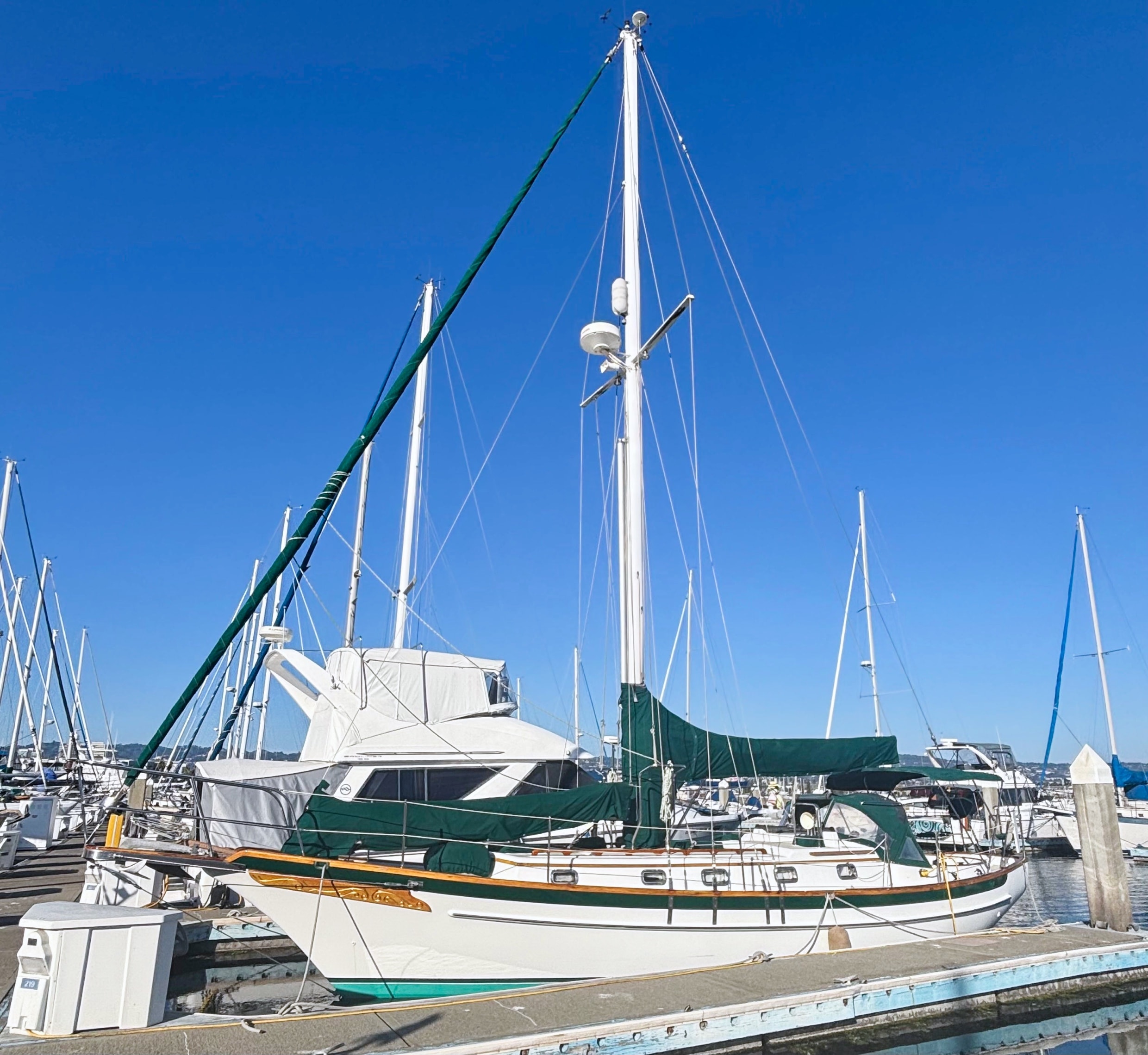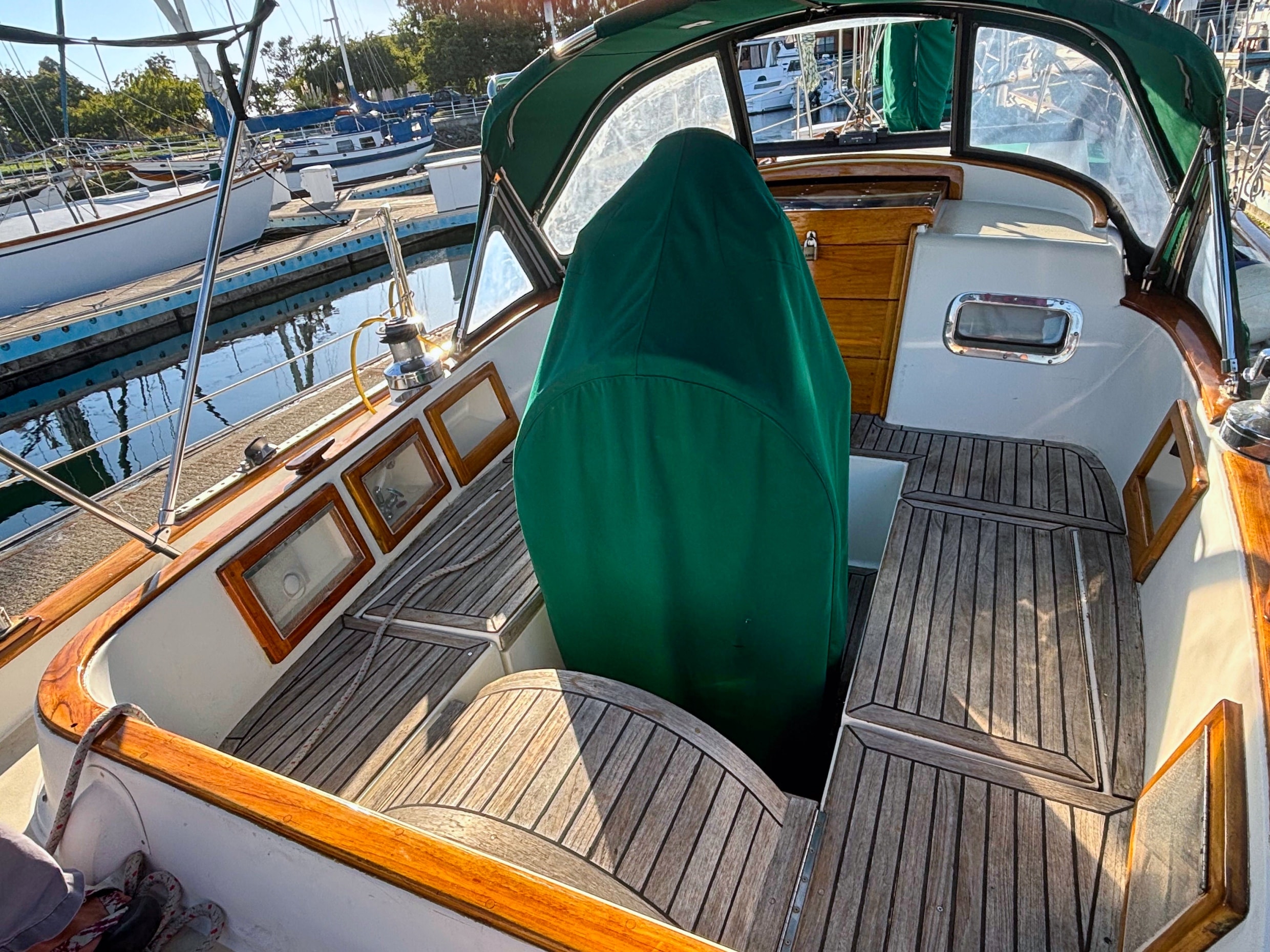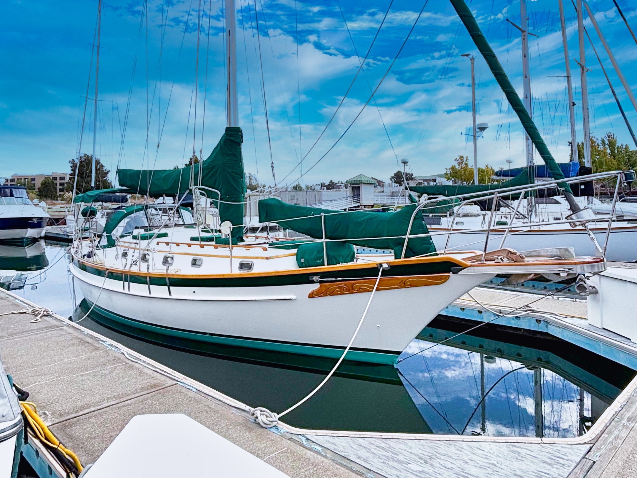 EMERALD STAR has been loved and cared for by her current owners since 2003. They raved about the simple ergonomics and sailing her as a couple. She has recent bottom paint, and a new shaft seal. The exterior varnish is less than a year old and the interior was revarnished in 2020. The folding salon table is a work of art. She is hull number 151 with many custom upgrades.