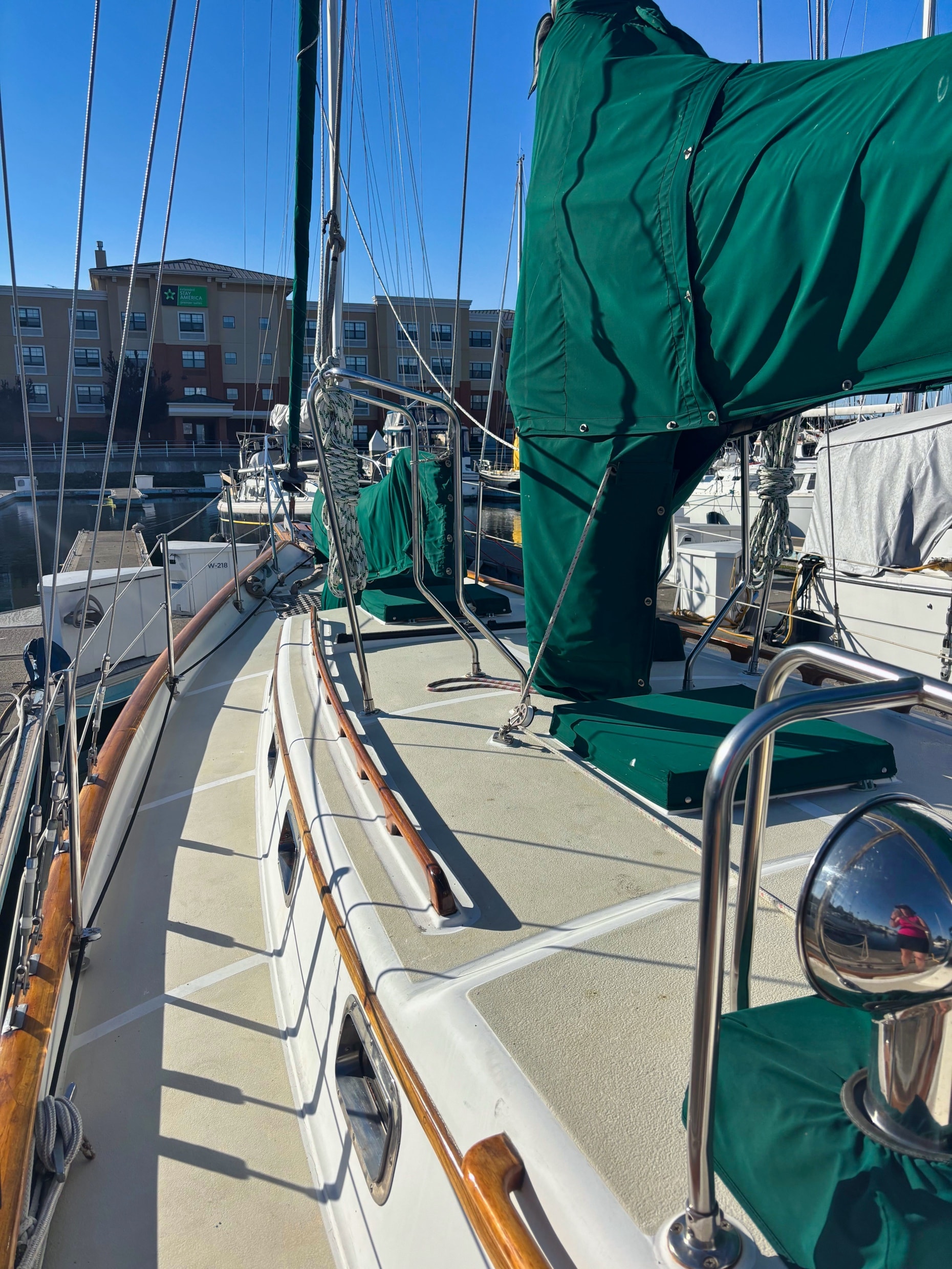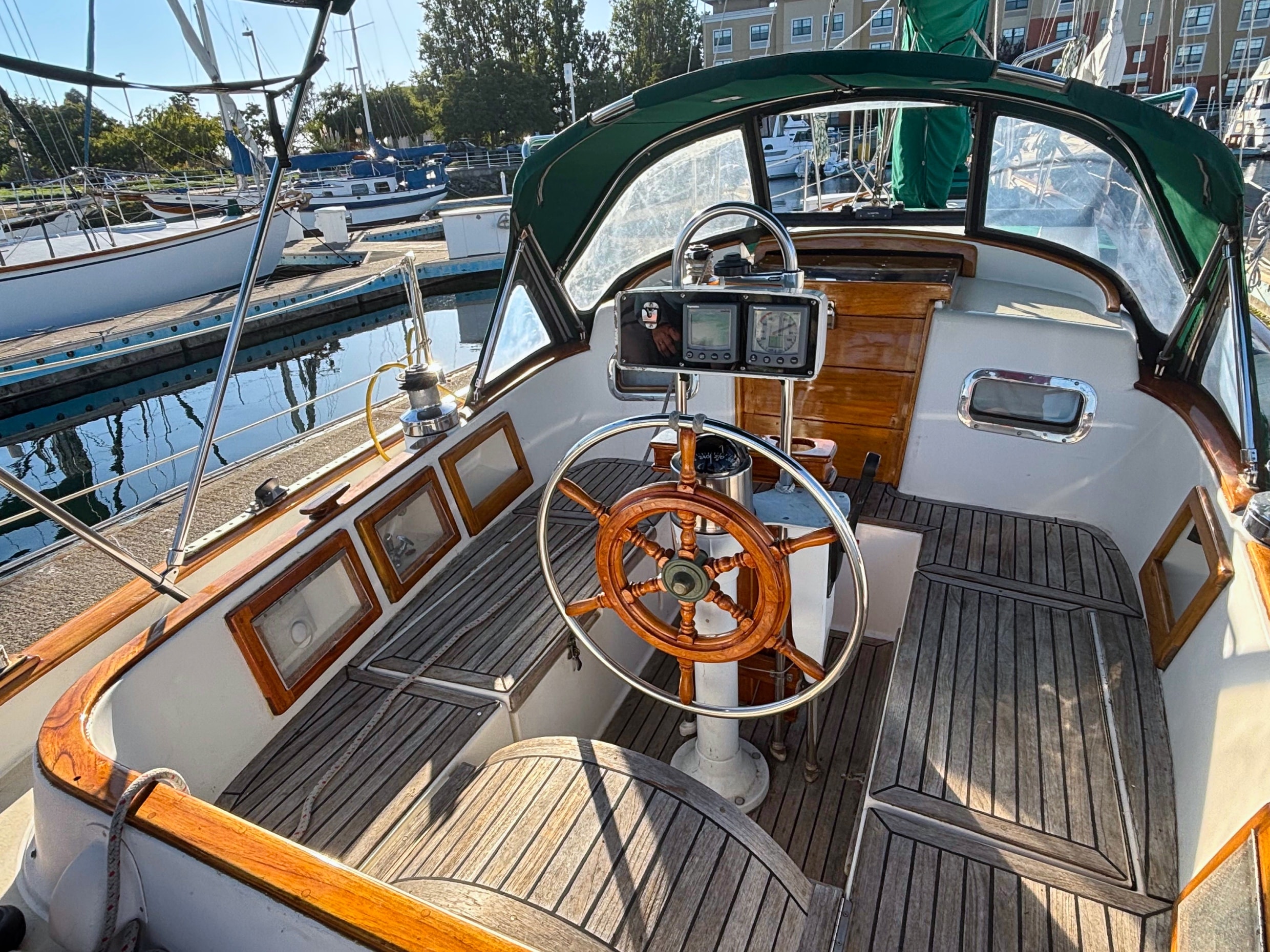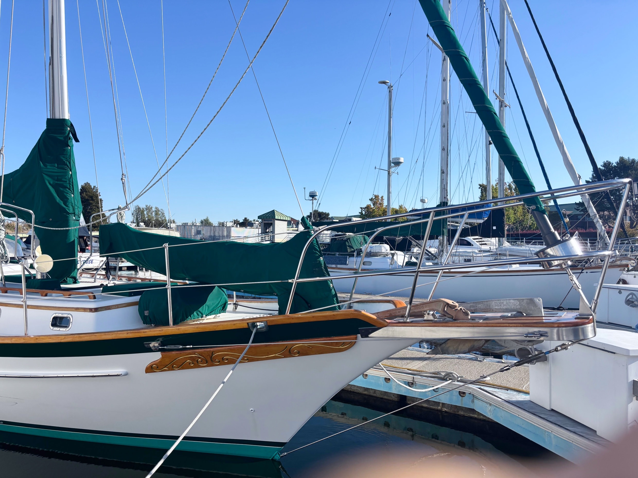 EMERALD STAR has been loved and cared for by her current owners since 2003. They raved about the simple ergonomics and sailing her as a couple. She has recent bottom paint, and a new shaft seal. The exterior varnish is less than a year old and the interior was revarnished in 2020. The folding salon table is a work of art. She is hull number 151 with many custom upgrades.
