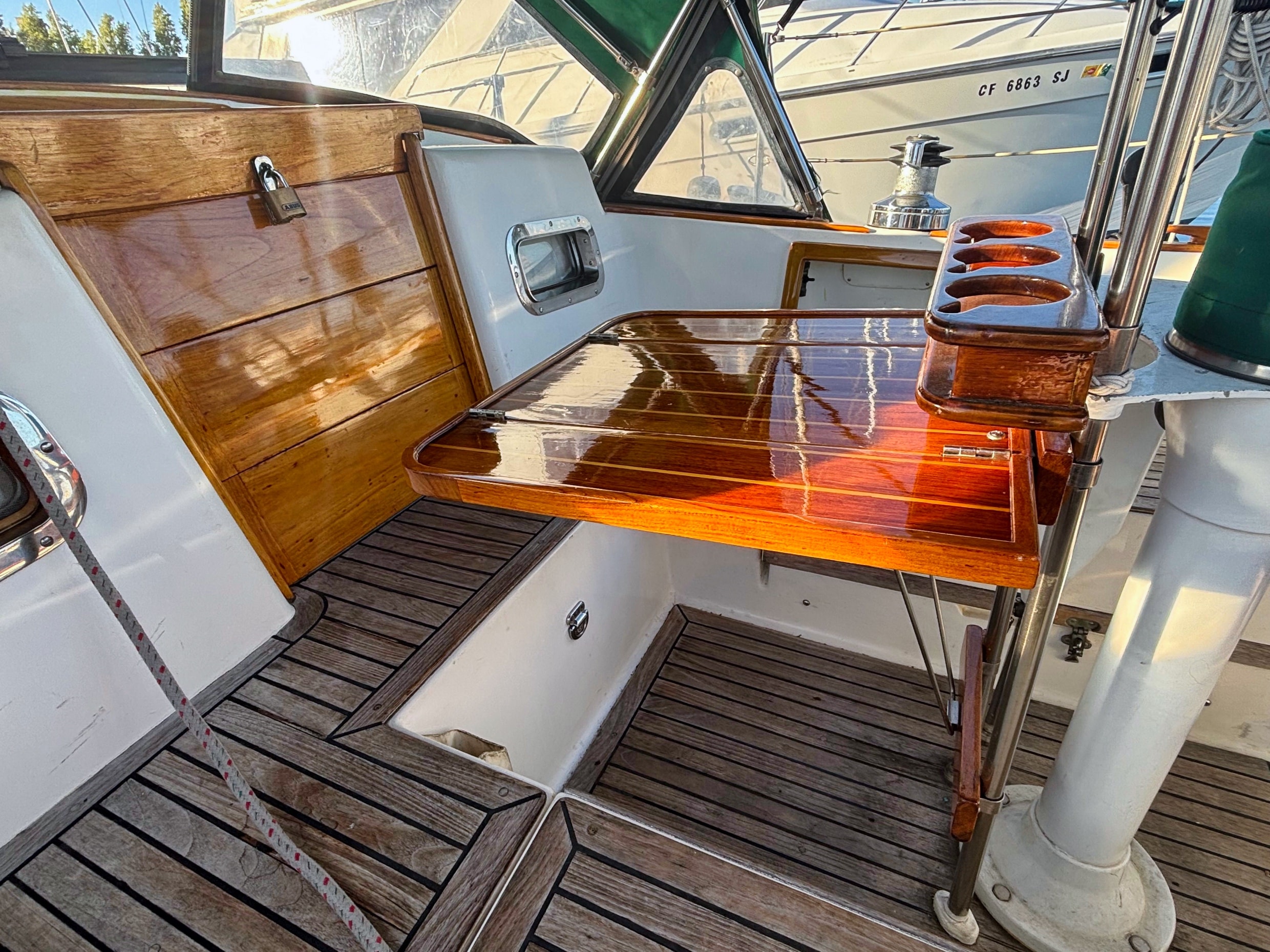 - Teak cockpit table and cup holder