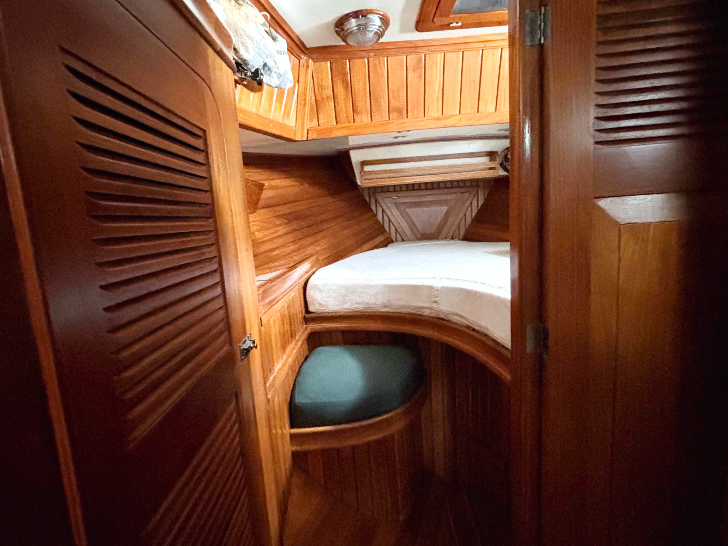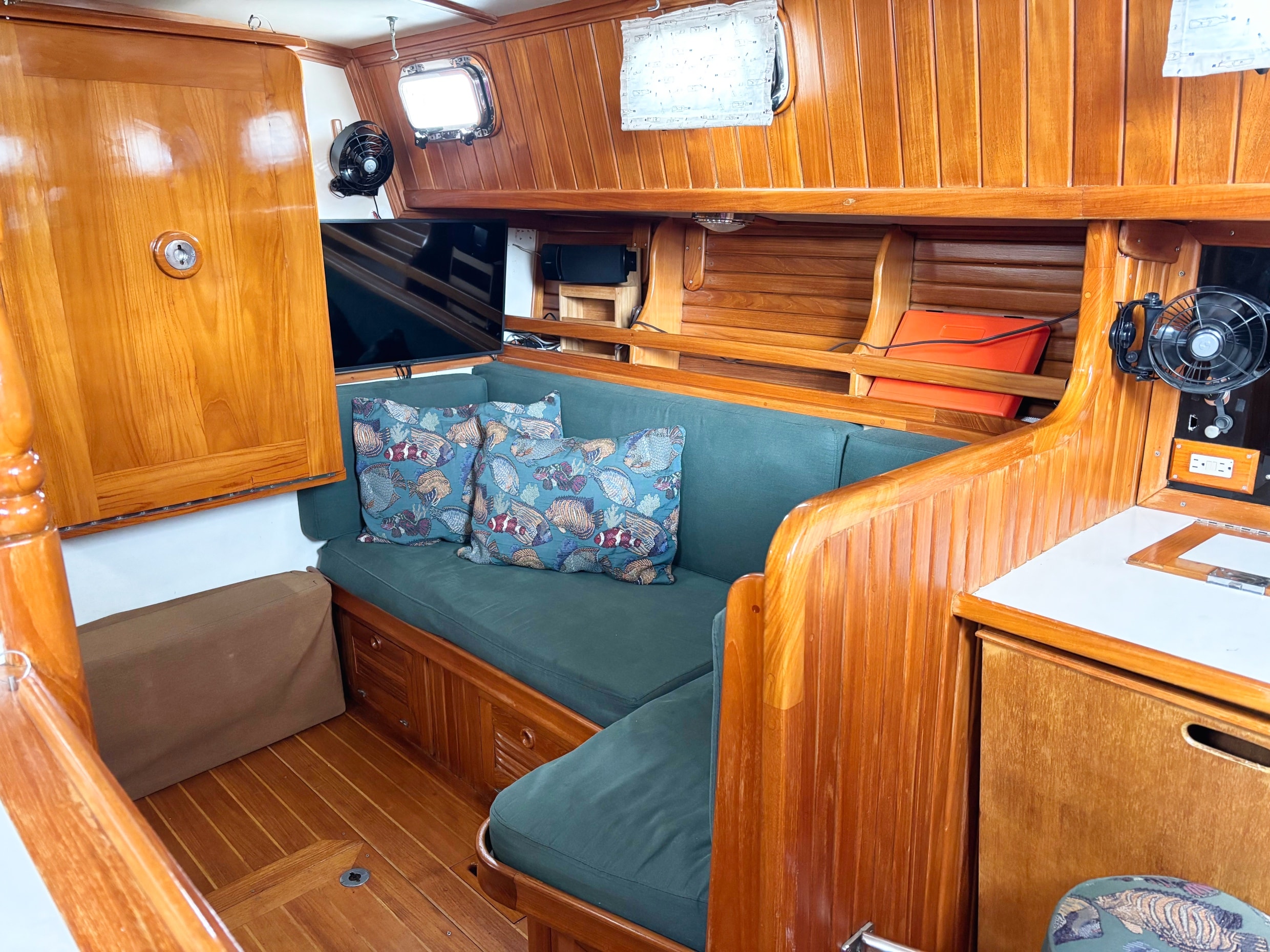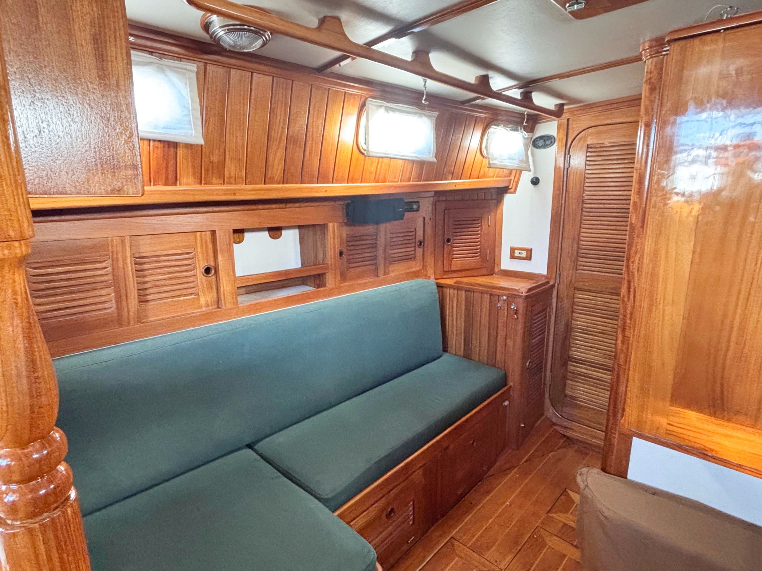 The teak woodwork throughout was redone in 2020 and looks new. Excellent ventilation is achieved with six well-placed 12-volt fans, three opening hatches with teak frames and screens, twelve SS opening ports with screens and two SS dorades. Excellent natural light and visibility through the portlights is a plus for a boat this size.