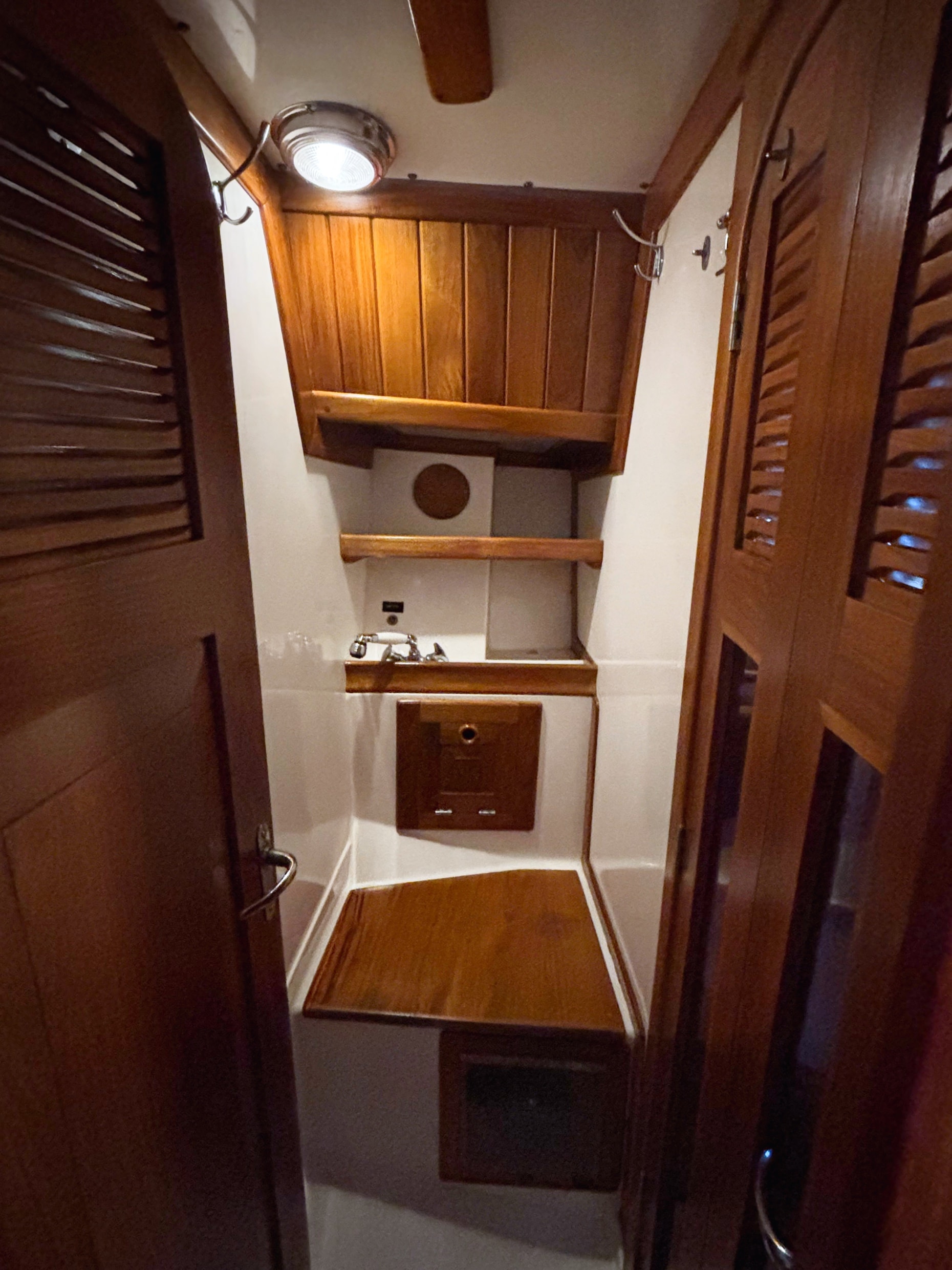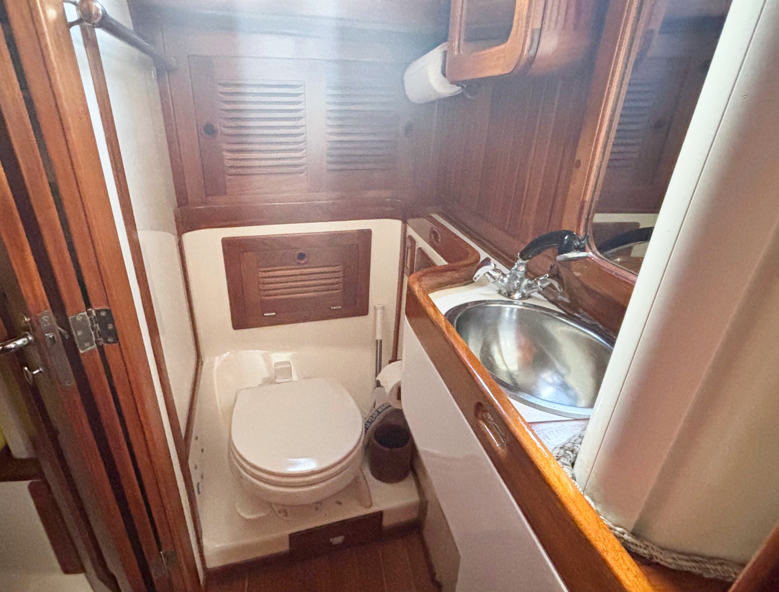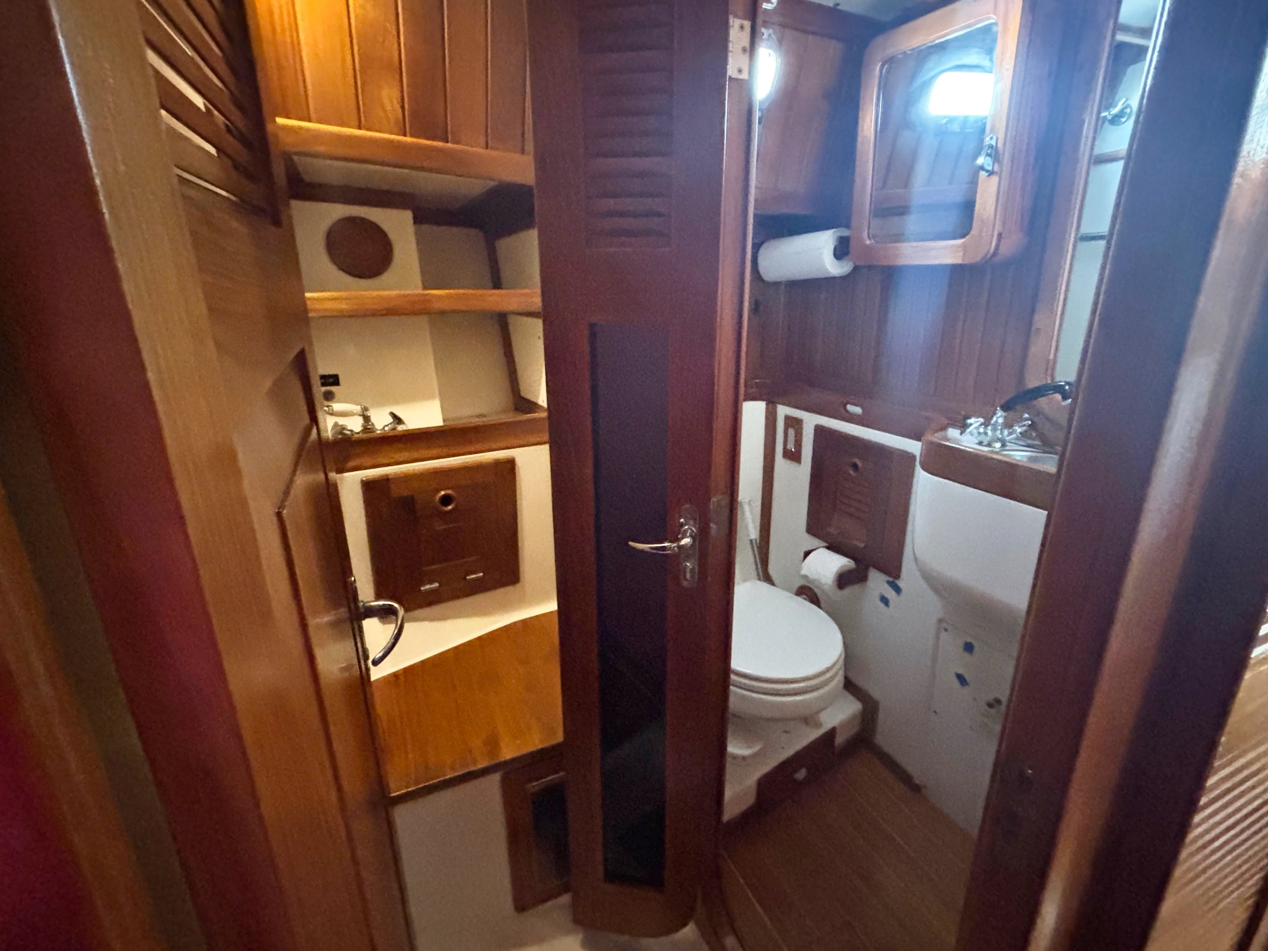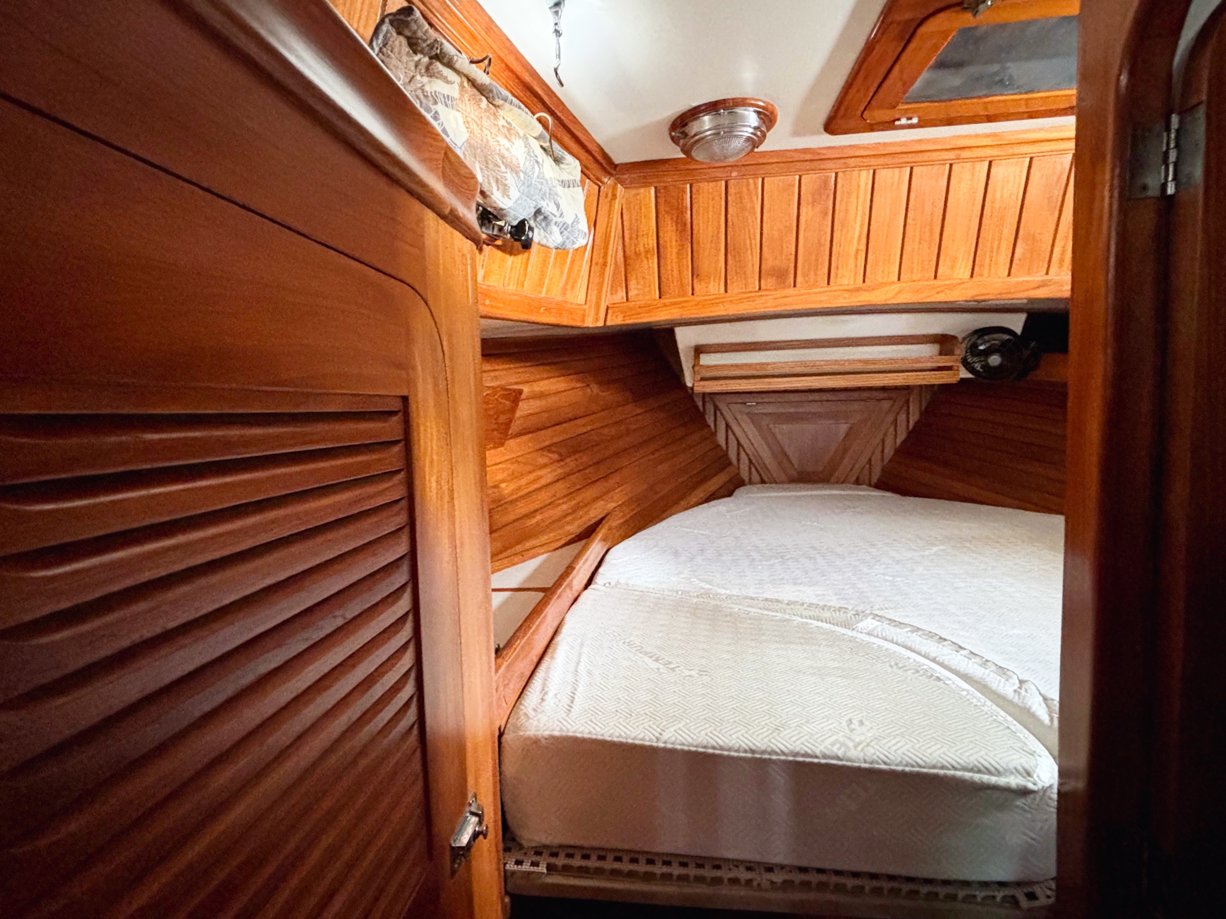 The teak woodwork throughout was redone in 2020 and looks new. Excellent ventilation is achieved with six well-placed 12-volt fans, three opening hatches with teak frames and screens, twelve SS opening ports with screens and two SS dorades. Excellent natural light and visibility through the portlights is a plus for a boat this size.