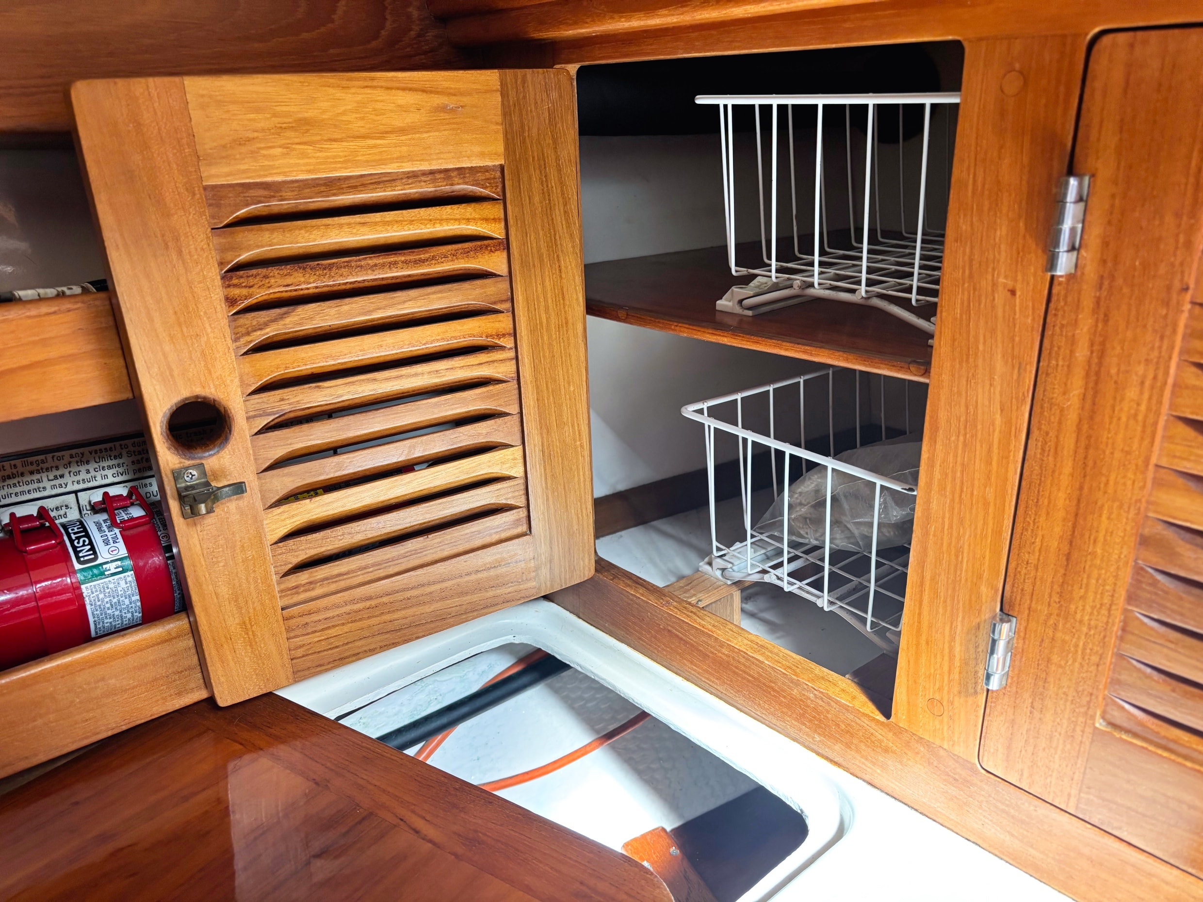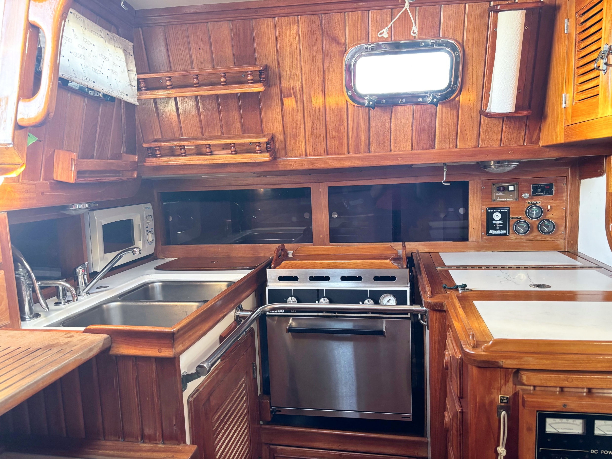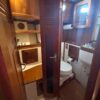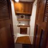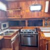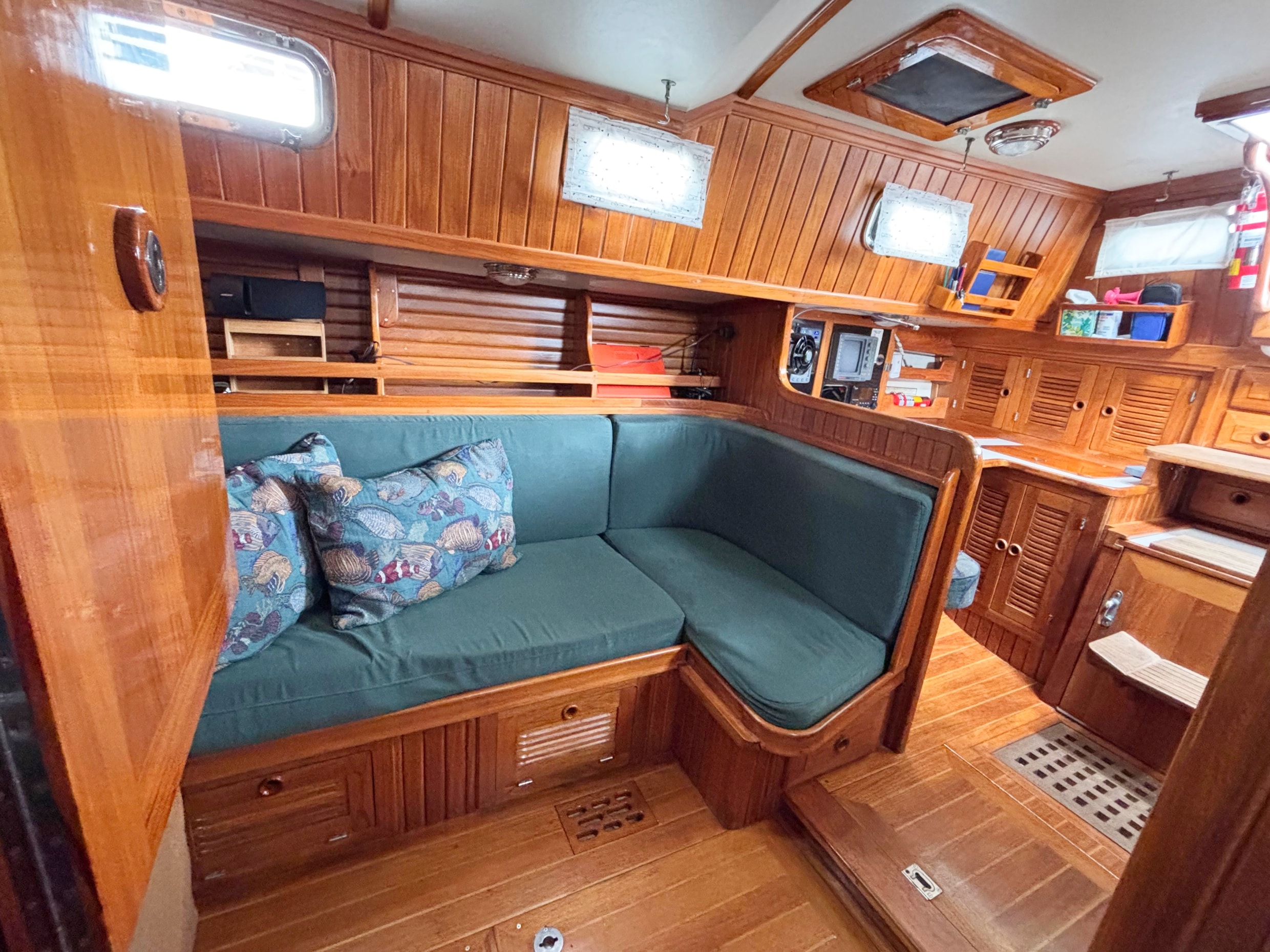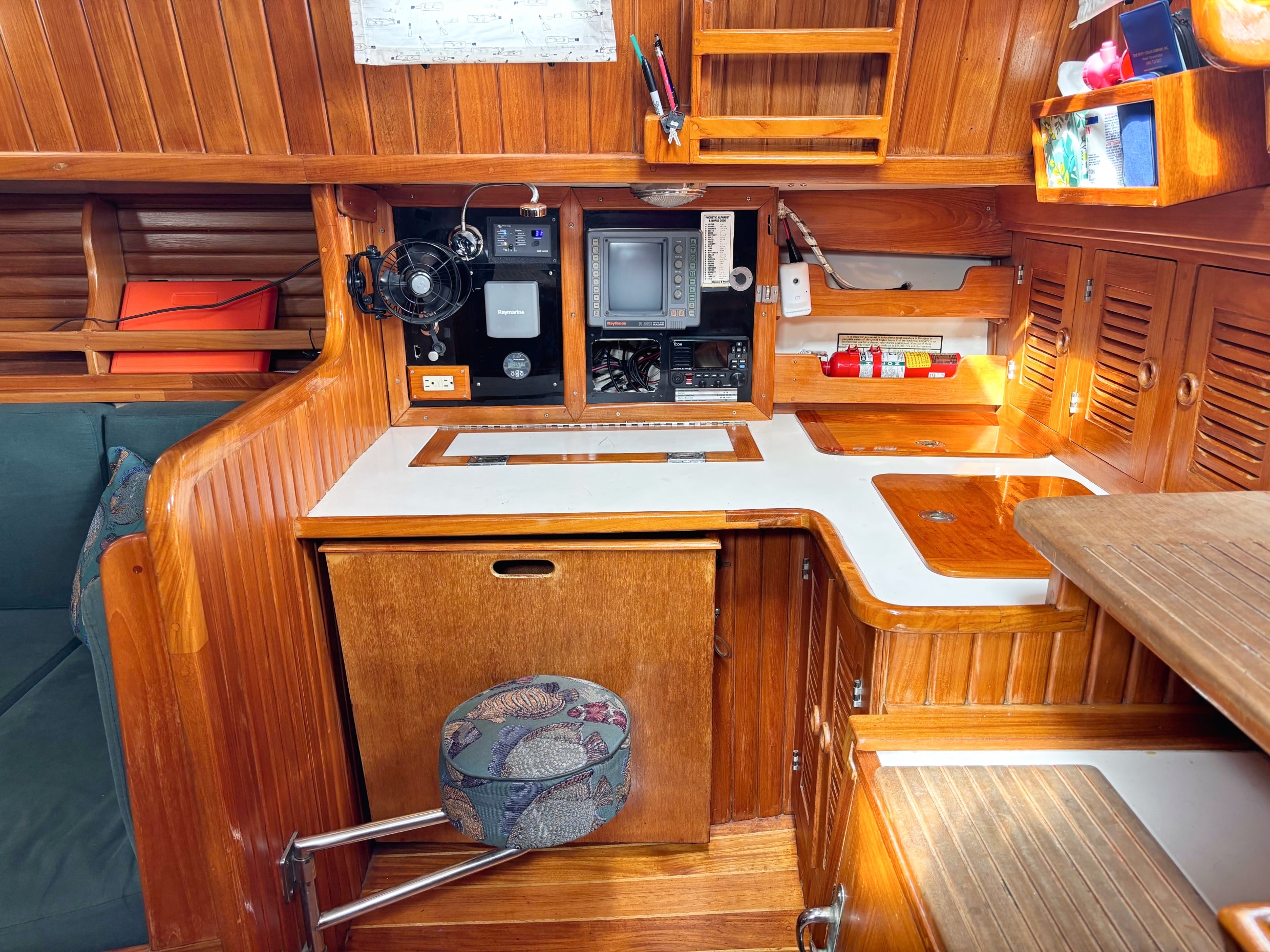 Down the companionway is a large chart table to starboard and the U-shaped galley is to port. The galley has abundant cabinet storage, spice racks, utility drawers and counter space. The Nav station/desk has a swing out chair, chart locker, more teak storage cabinets, and electronics.