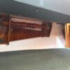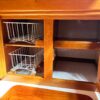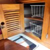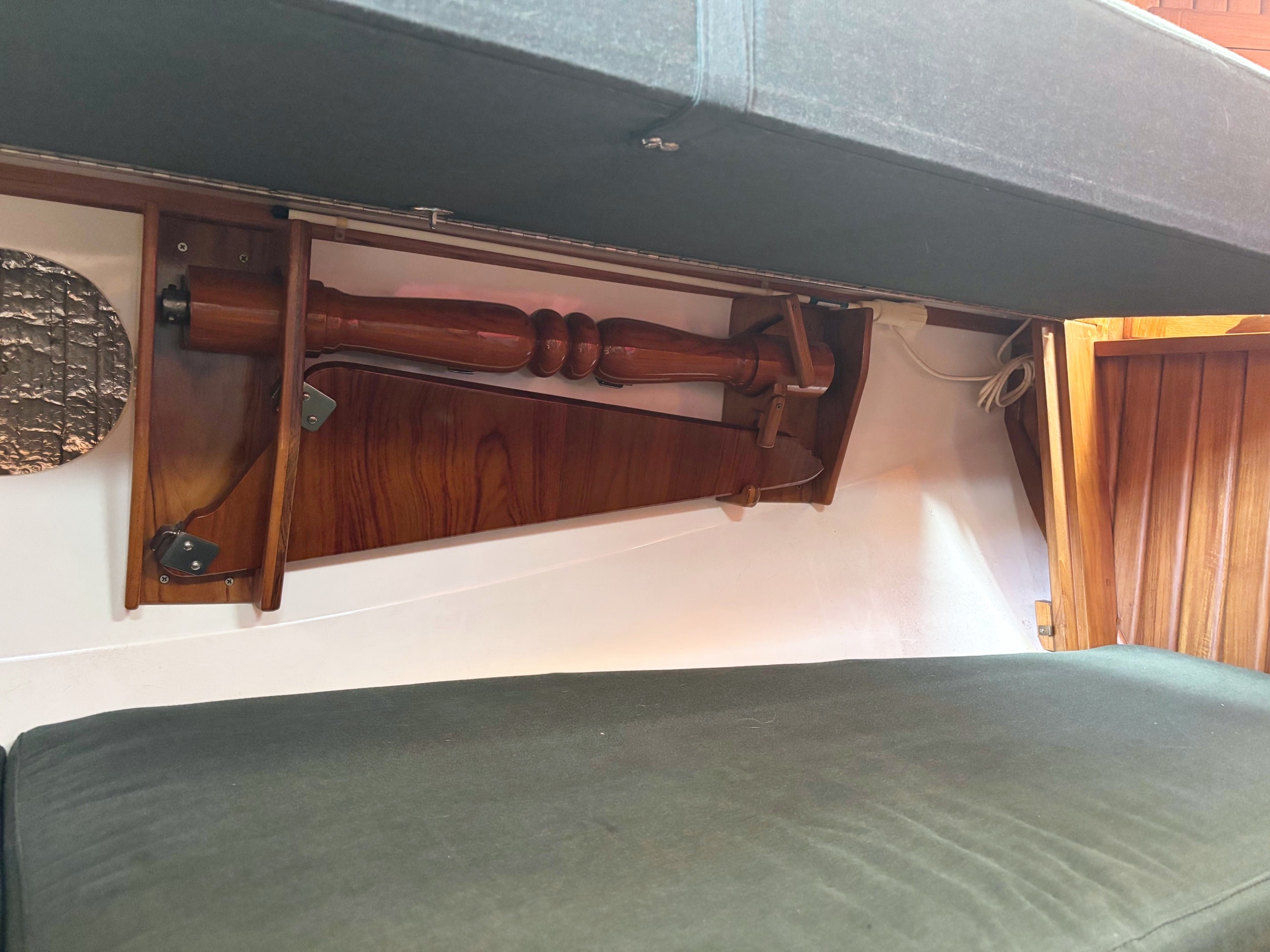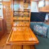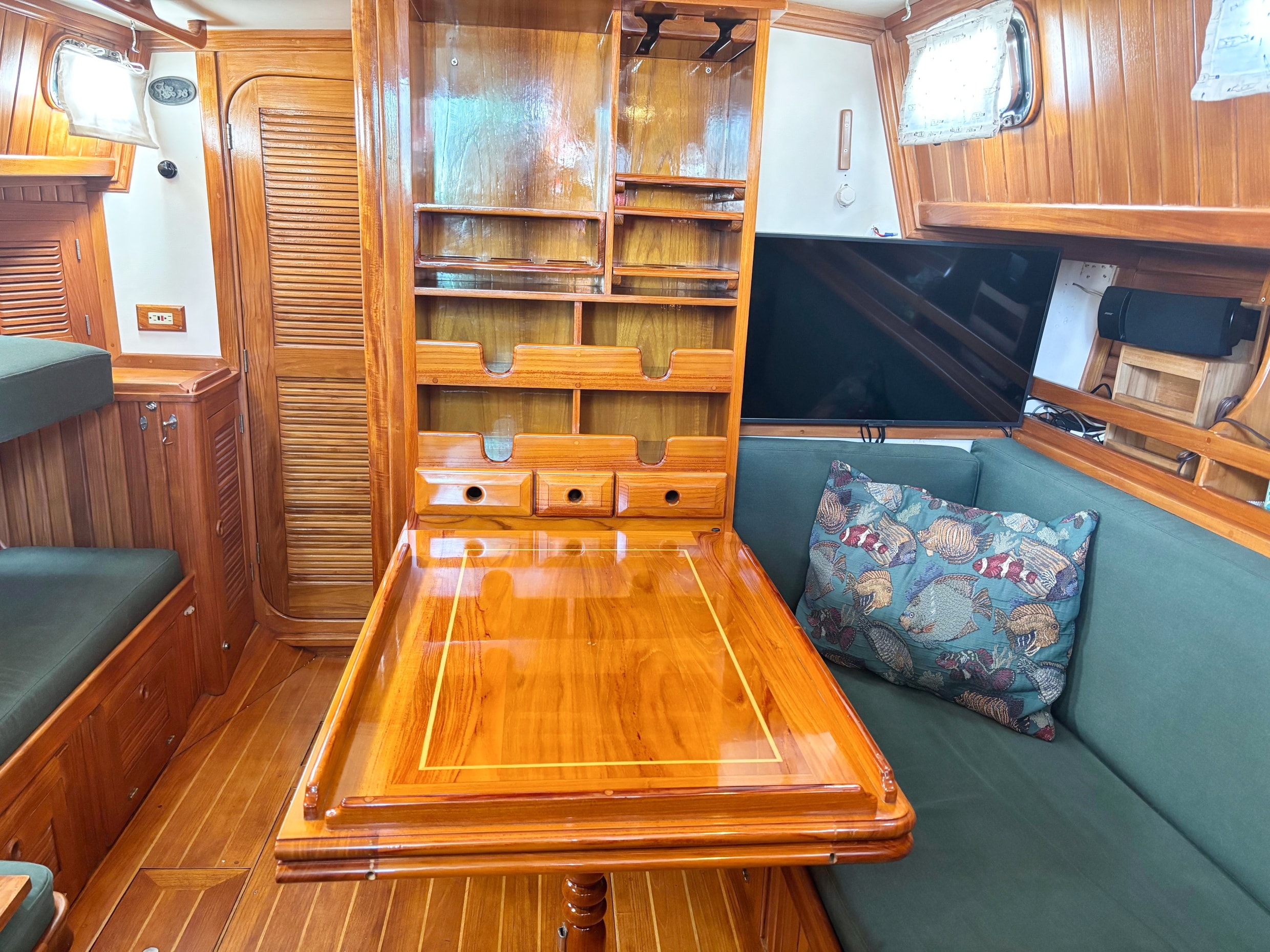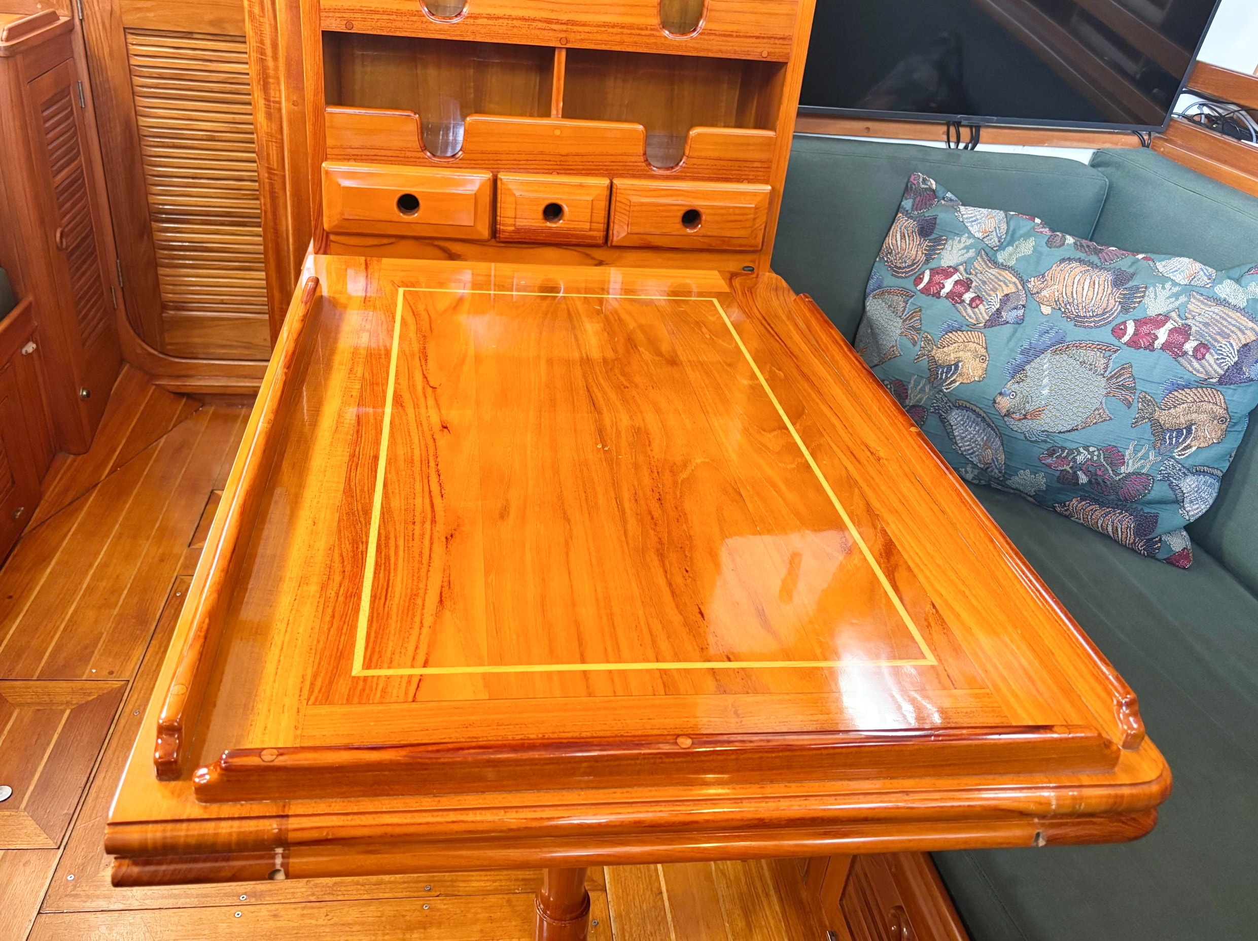 The exquisite inlaid dining table folds away against a forward bulkhead cabinet and can be folded open to accommodate both settees. When the table is down its bulkhead cabinet reveals storage for dishes and glassware, a wine rack, and drawers for tableware. Samsung TV- 32 inch mounted on salon bulkhead.
