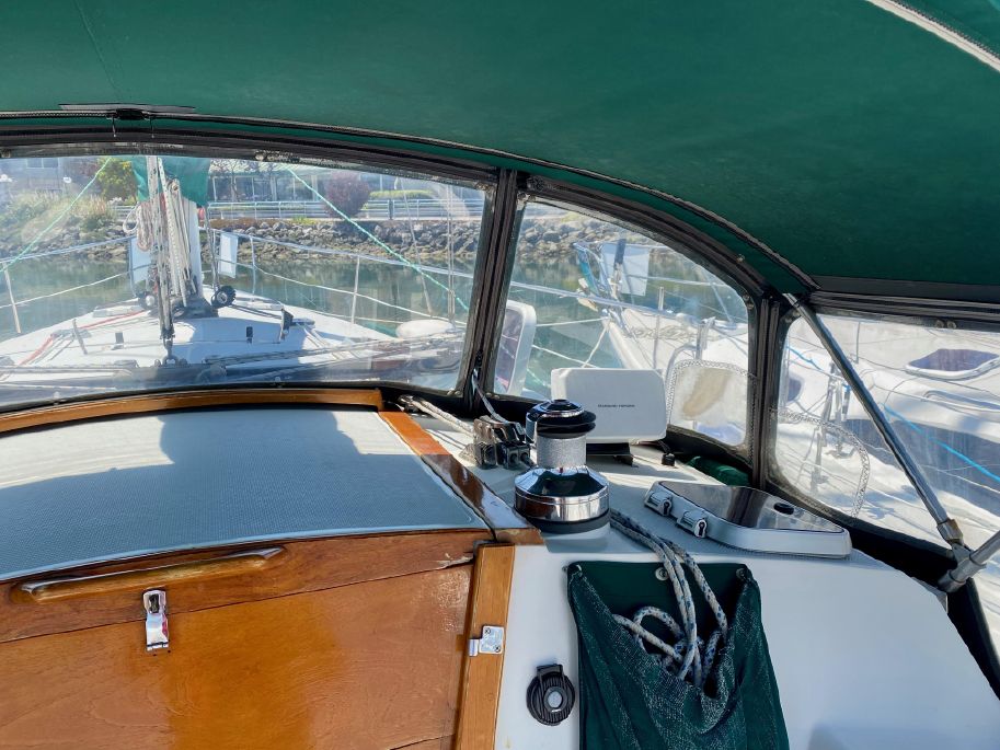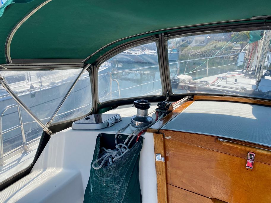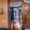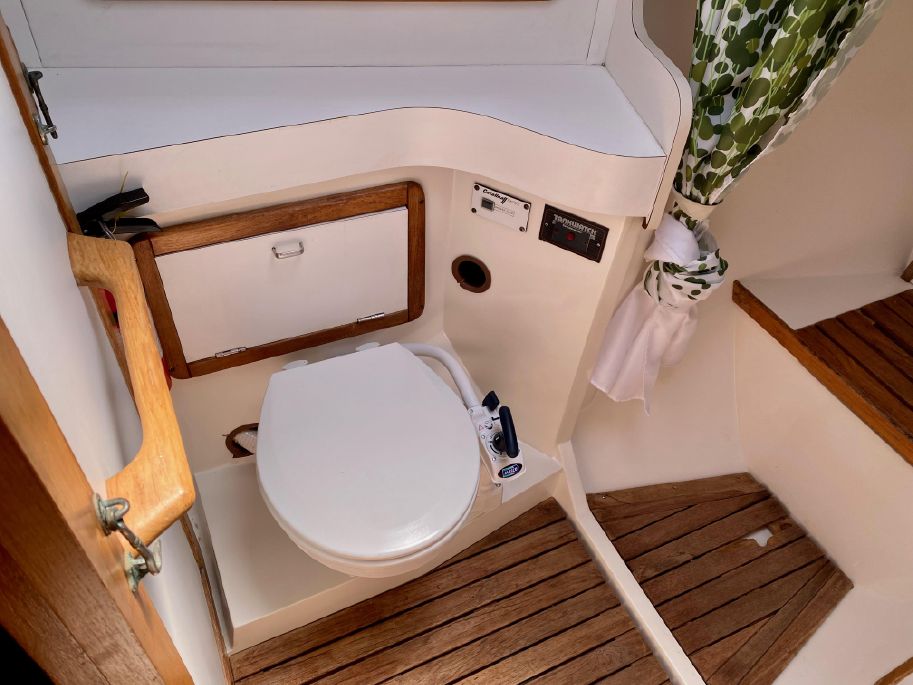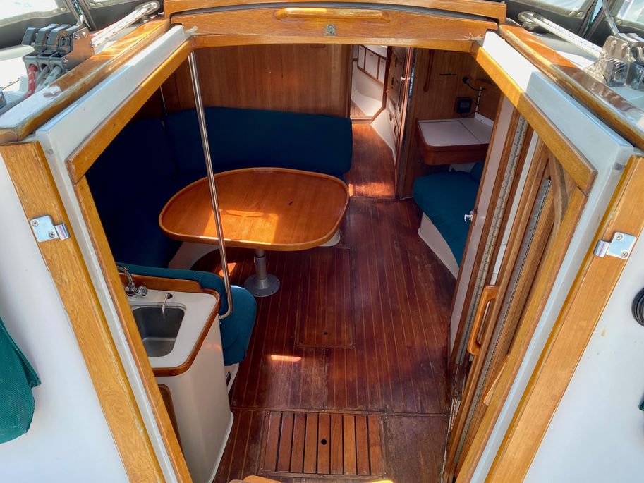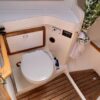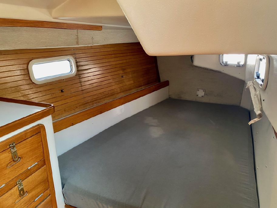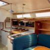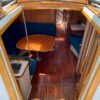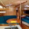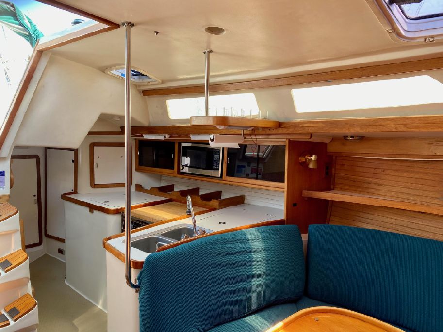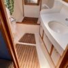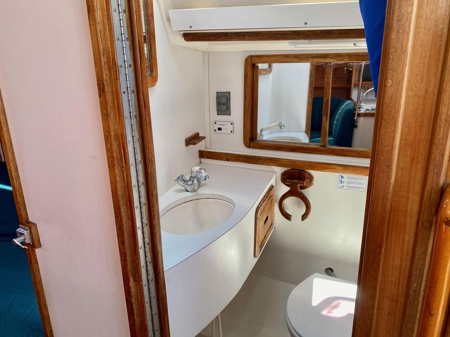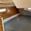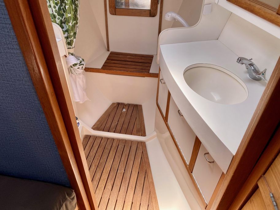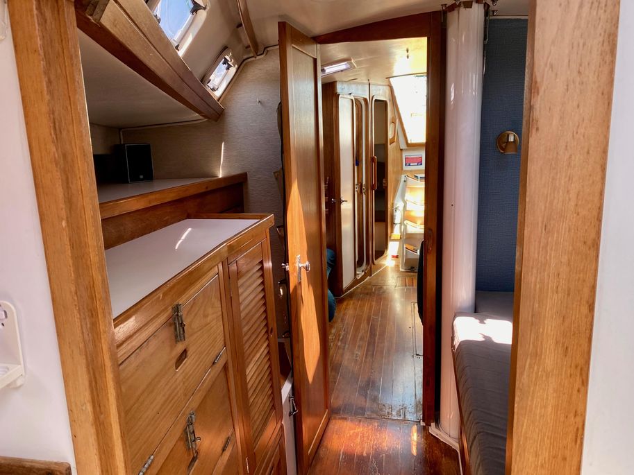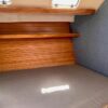 There is lots of storage underneath. On the starboard side of the mail salon is the navigator table with a Raymarine remote and large settee that sleeps one (with storage behind and underneath). The galley is on the port side of the salon with large counter spaces, and cabinets, refrigeration and a pantry; followed by a large storage area and battery/engine access. The guest head islocated starboard rear, followed by the aft cabin with a large double bed.  The head has a vanity & sink,  hot and cold pressure water, marine toilet, and shower with electric sump pump.