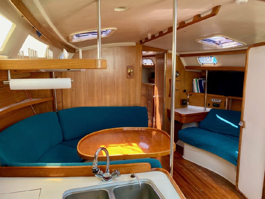 Sleeps seven in the Catalina 42 two stateroom/ two head design. Owners stateroom forward with Pullman berth to port – double bed, drawers below,  with hanging lockers and drawers to starboard. Forward of the stateroom is a private head, with vanity & sink with hot & cold pressure water, marine toilet  and stall shower with an electric sump pump. The main salon has large U-shape dinette to port, that converts to a double bed.