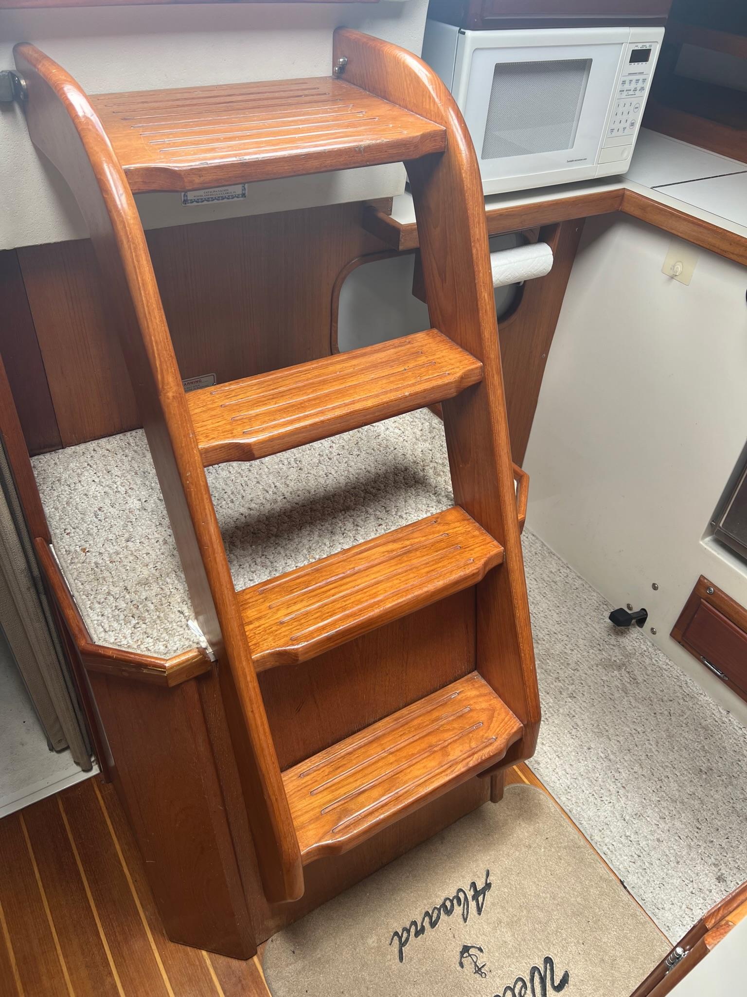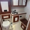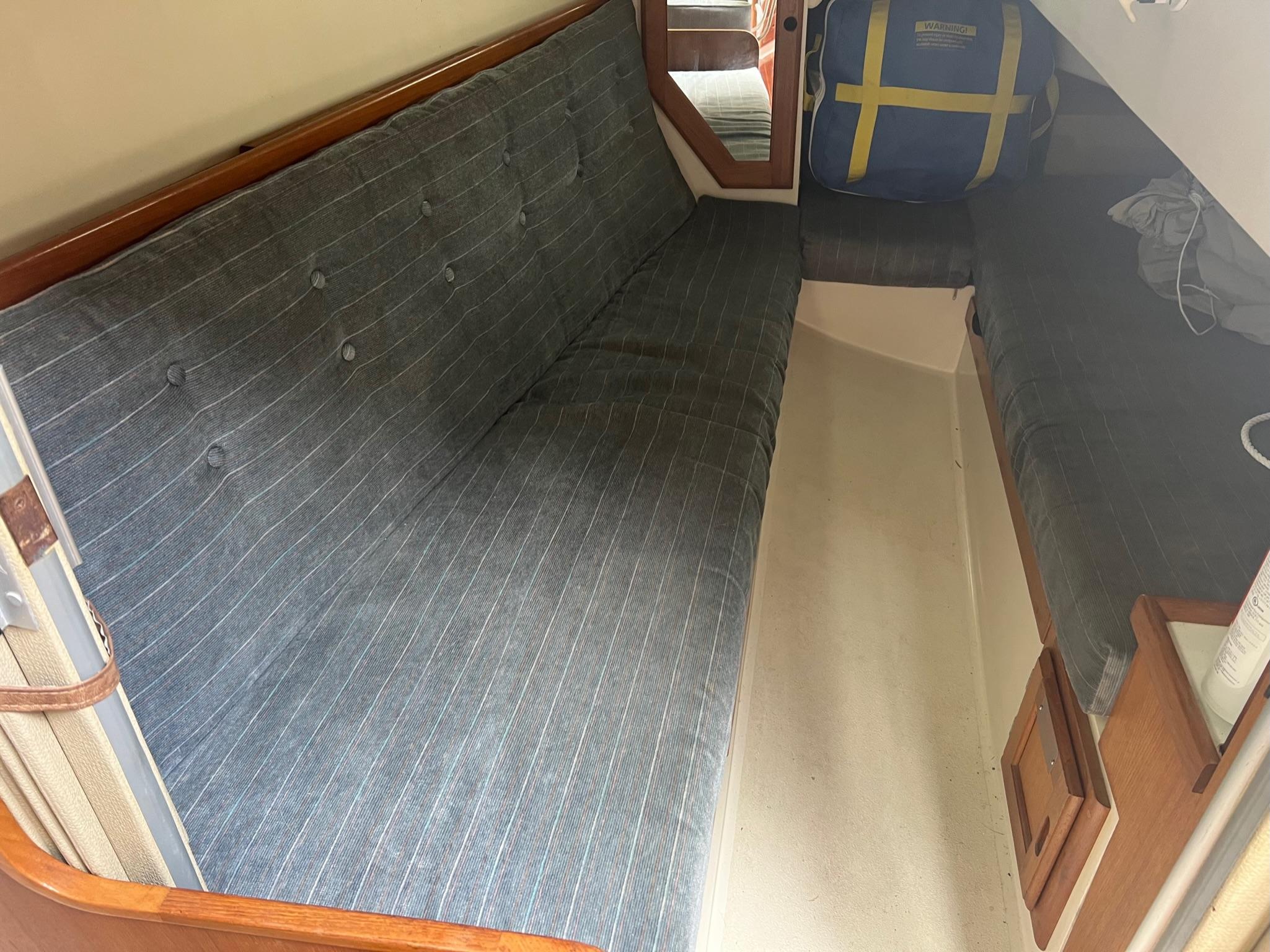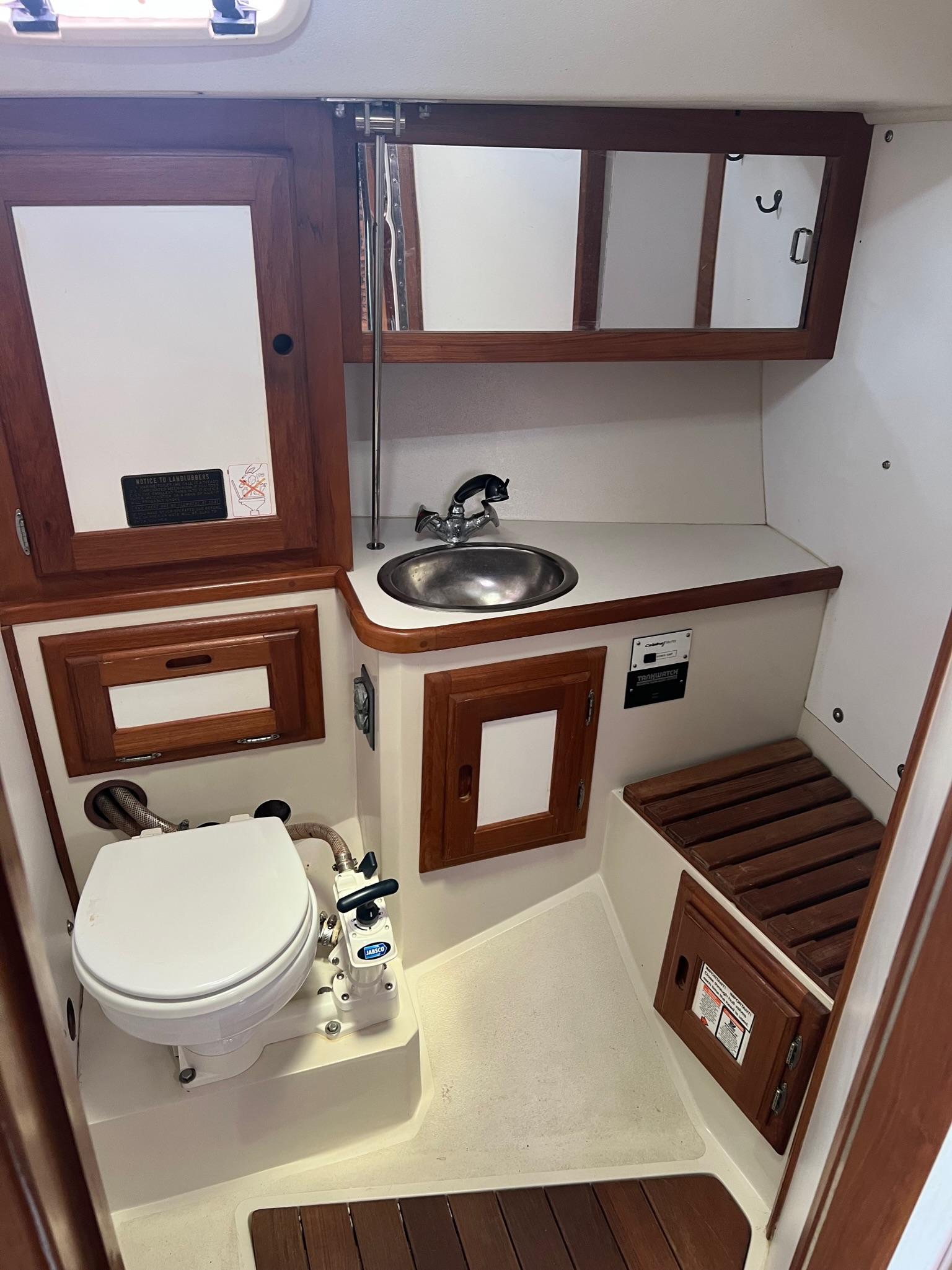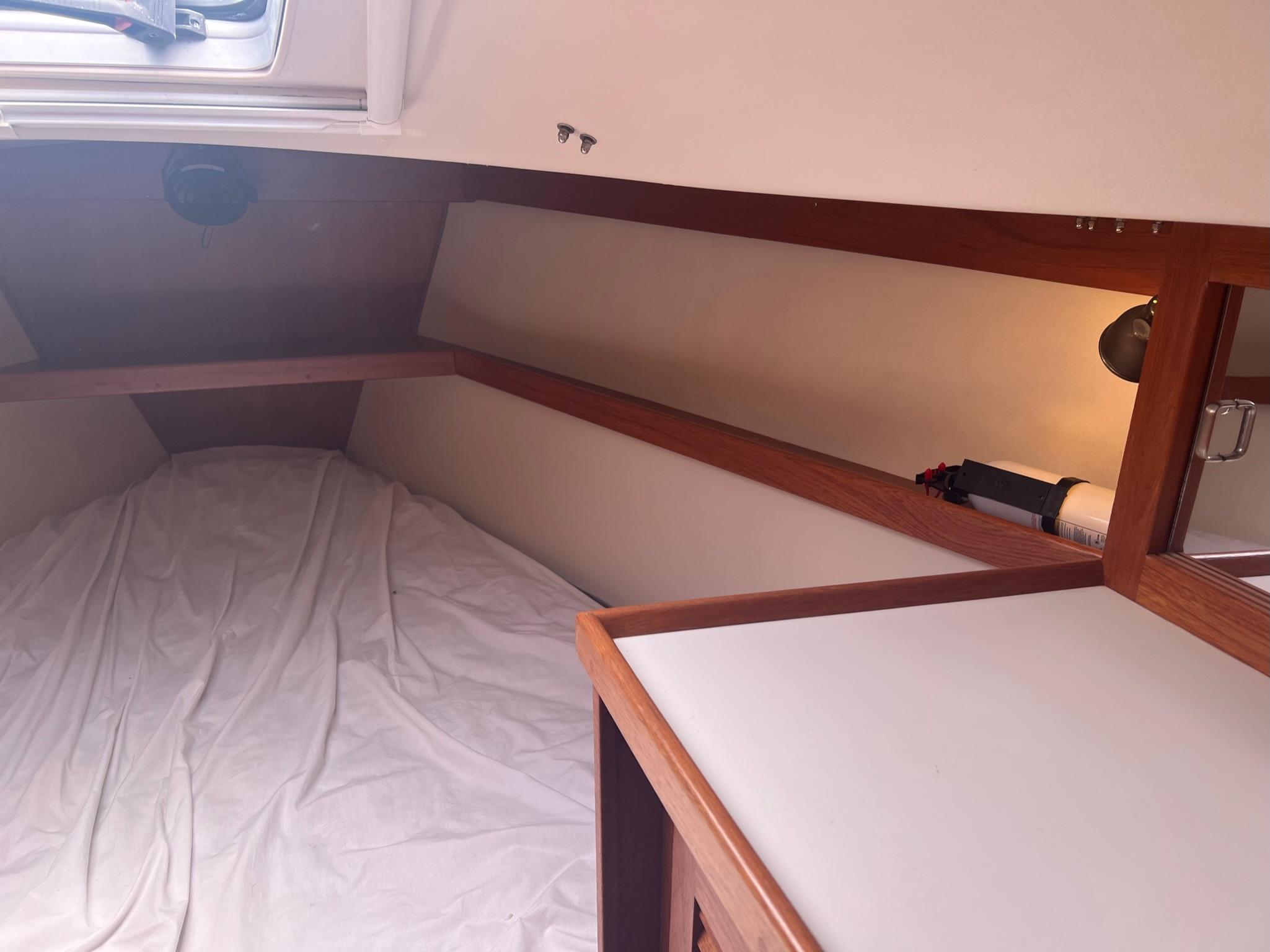 Moving forward through the vessel, to starboard there are cabinets with drawers and a large storage area. To port is the large head, the owner has an electric head unit available with the boat (for future installation). Forward is a large stateroom and V-berth, with drawers and hanging locker. Highlights include: