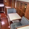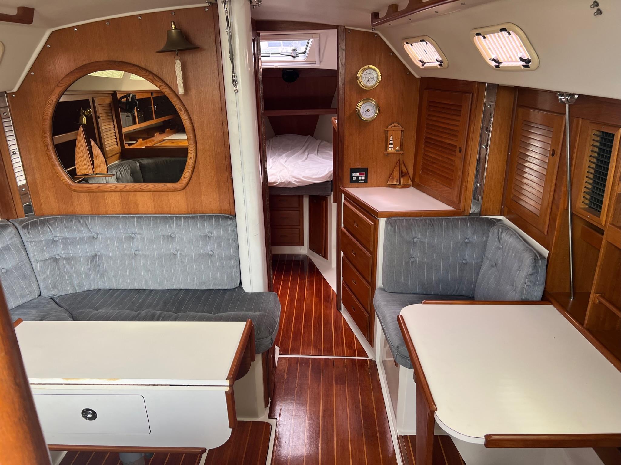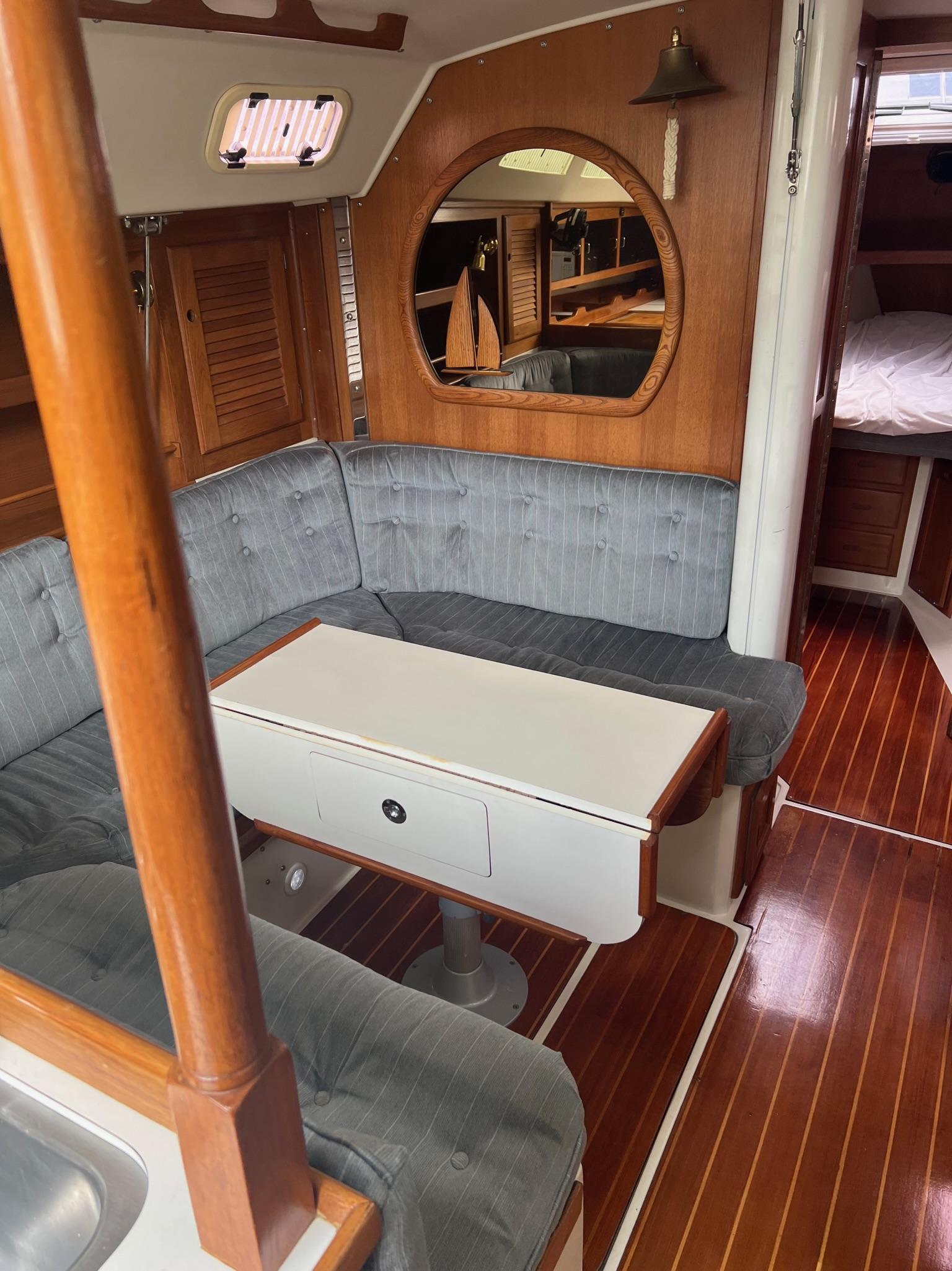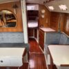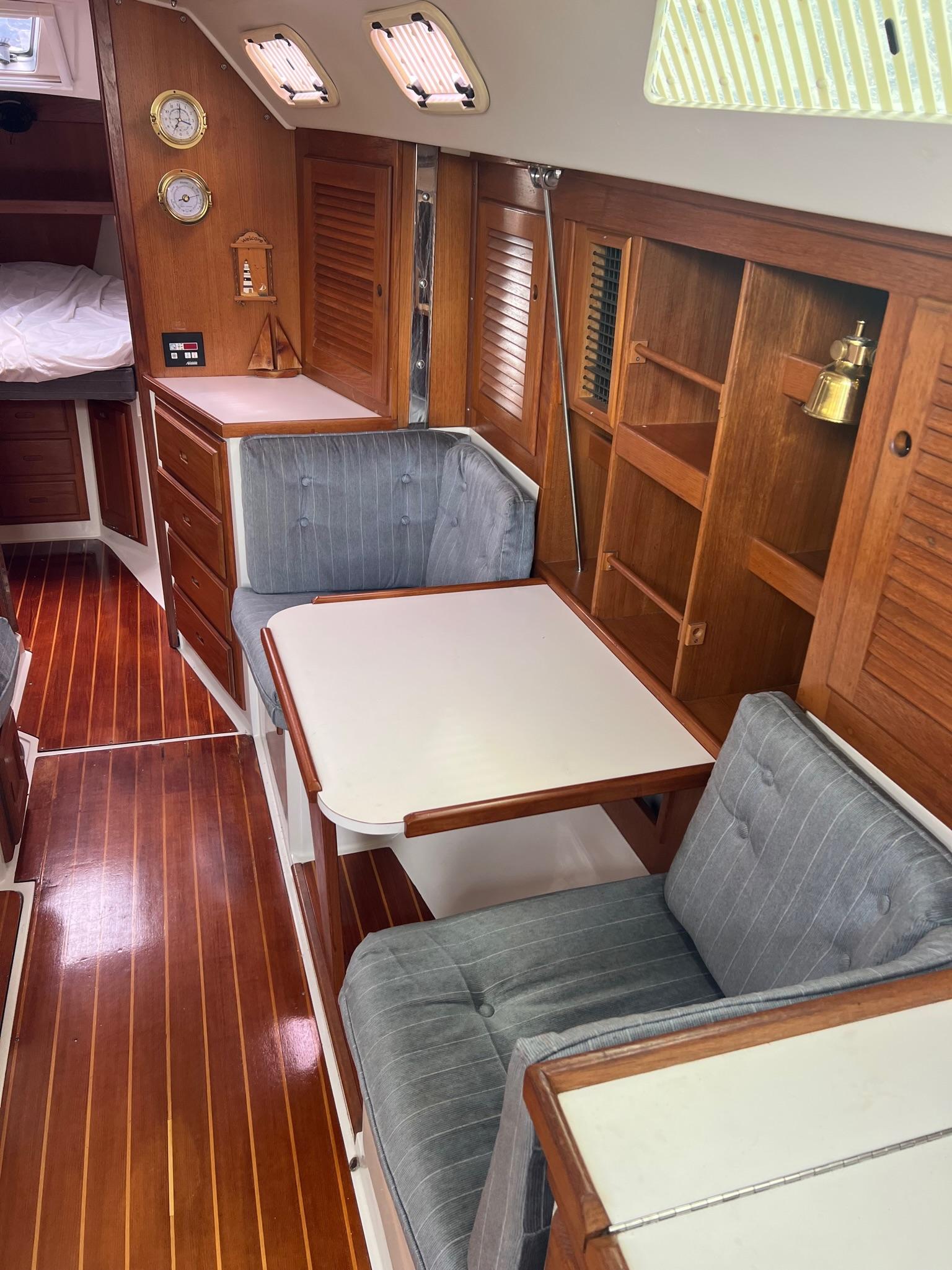 A traditional Catalina 2 cabin, dinette layout, with a single head. Entering through the wide and comfortable companionway, you immediately notice the open and airy welcome the Catalina 36 offers. There is a large “U” shaped galley to port, and to starboard is the nav desk with the desirable forward-facing seat, and an aft stateroom. Midship is a large convertible seating area to starboard, and a dinette that can seat six (converts to a double berth) to port. The midship main salon is perfect for friends and family, and games. The salon table can be folded to accommodate meals, games or happy hour for guests. The salon is spacious and very ventilated with opening hatches and windows. Storage is one thing the Catalina 36 is known for – with ample cabinets, drawers, closets, and lockers behind and below cushions.