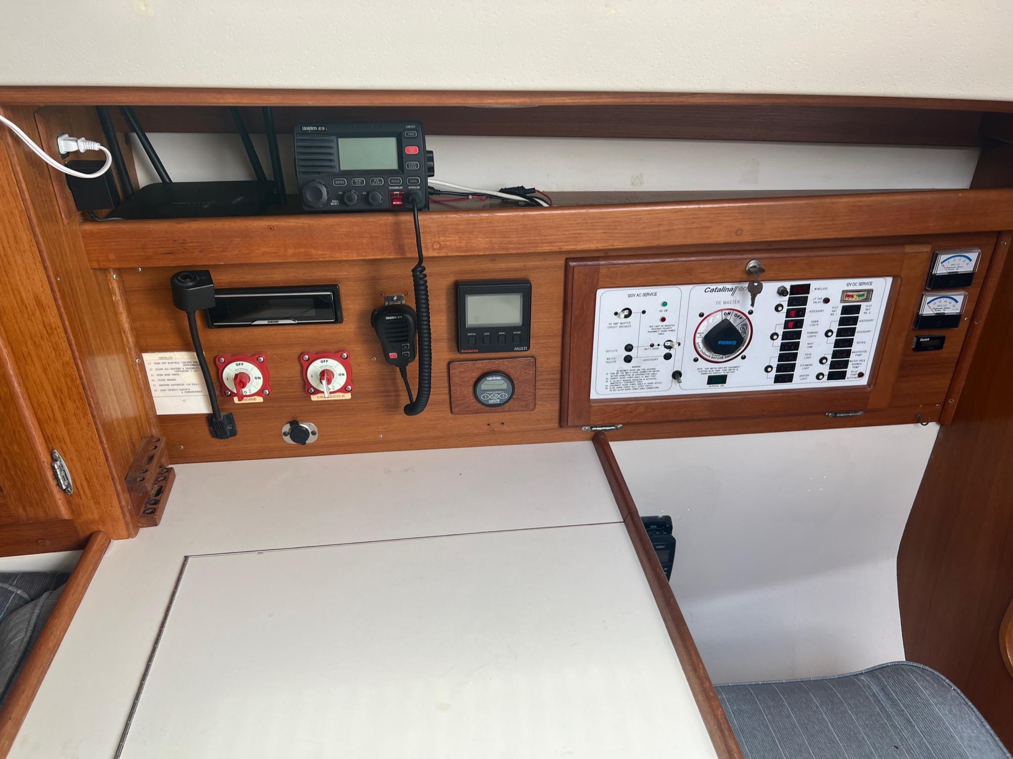 The navigation desk sits starboard of the companionway with a forward-facing swivel chair, a large working area and storage. The electric distribution panel is intuitive and at your fingertips. An inverter/charger supports most 110V requirements.