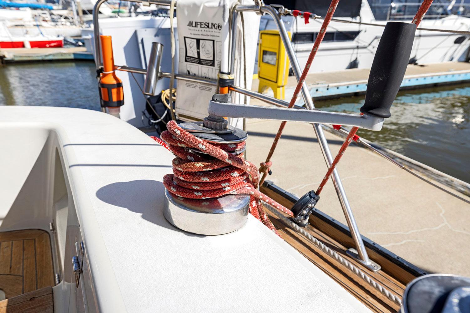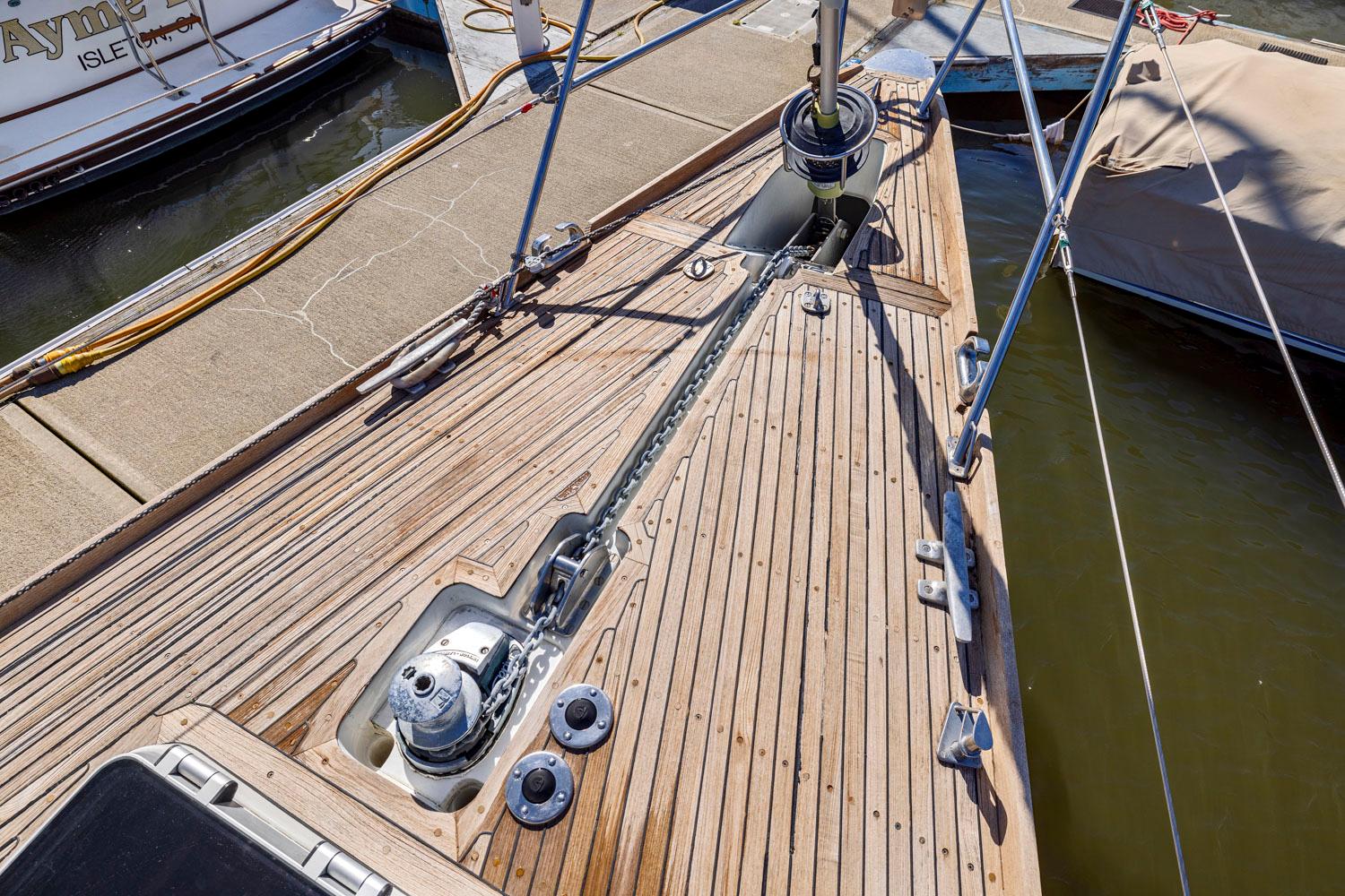 - 88 lb. Bruce anchor insert in bow slot with 300′ chain rode